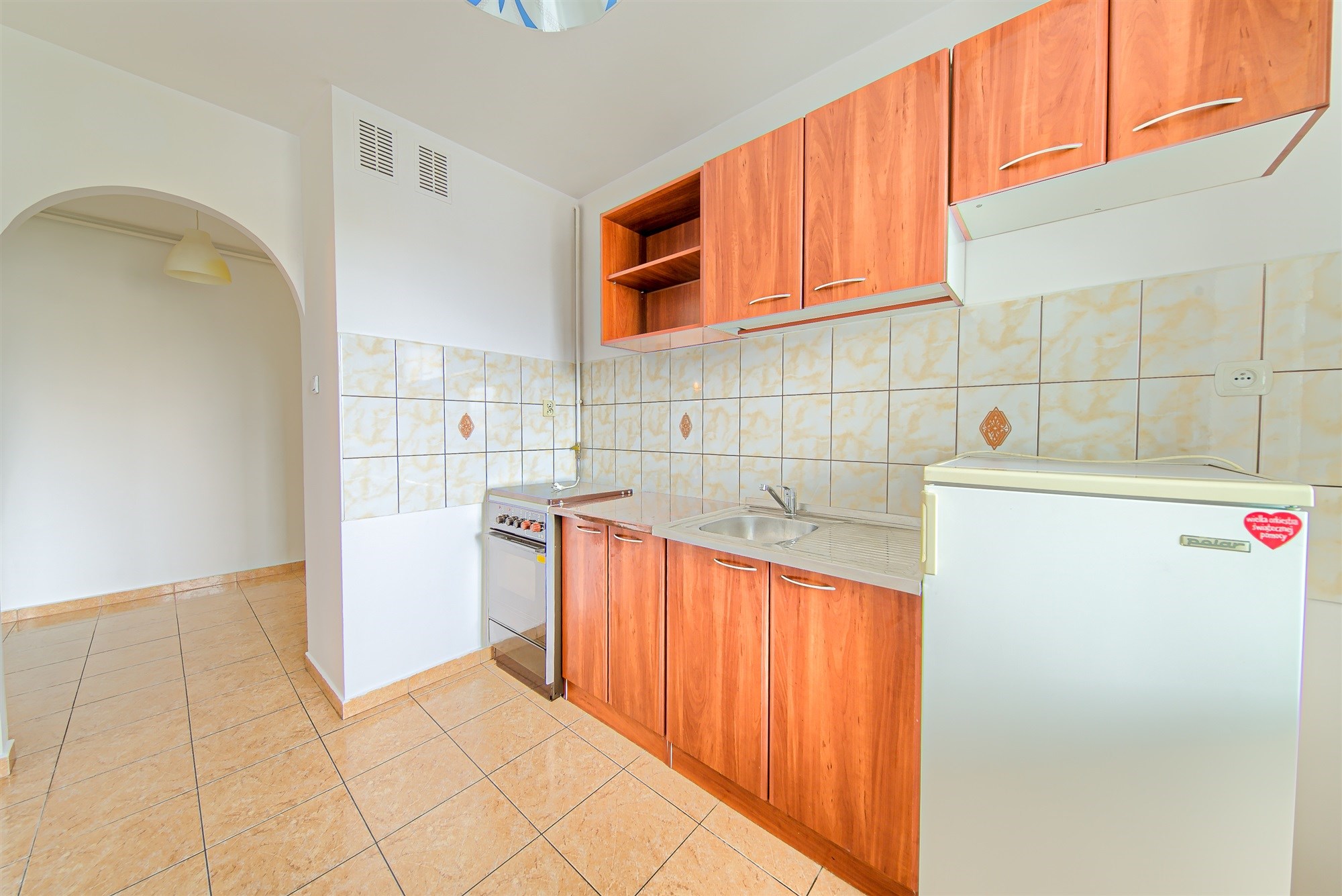 - umeblowana kuchnia (szafki kuchenne, na wyposażeniu kuchenka gazowa i lodówka). Na podłodze terakota, ściany częściowo malowane, częściowo fartuszek z glazury,