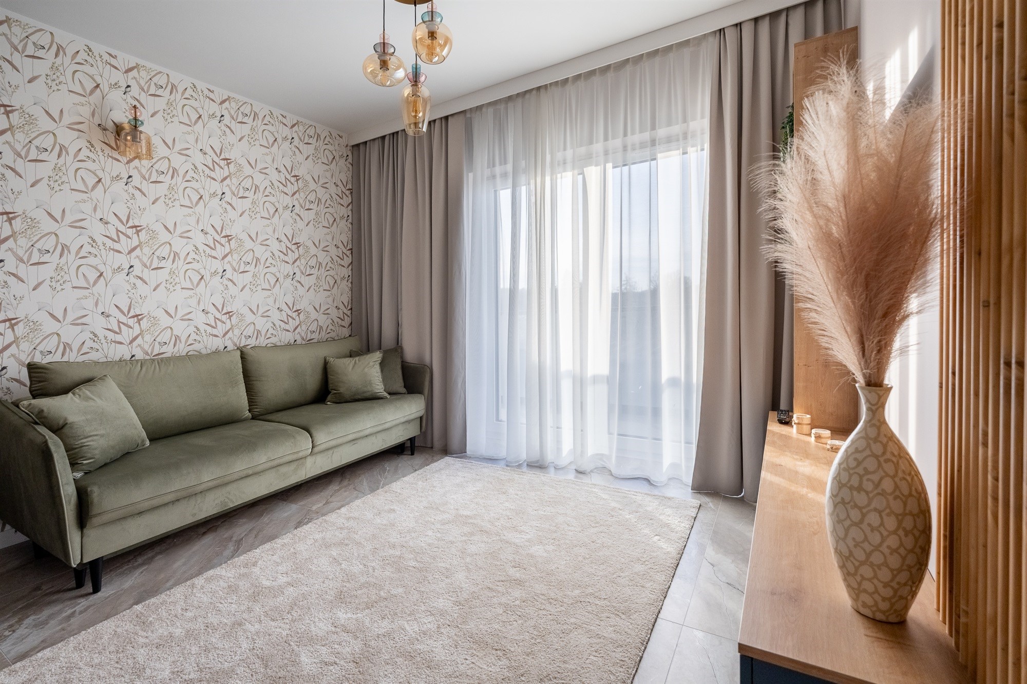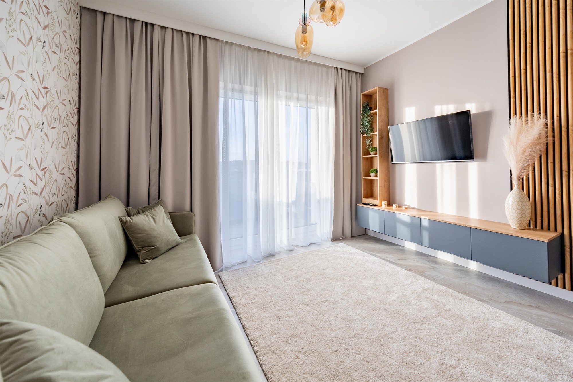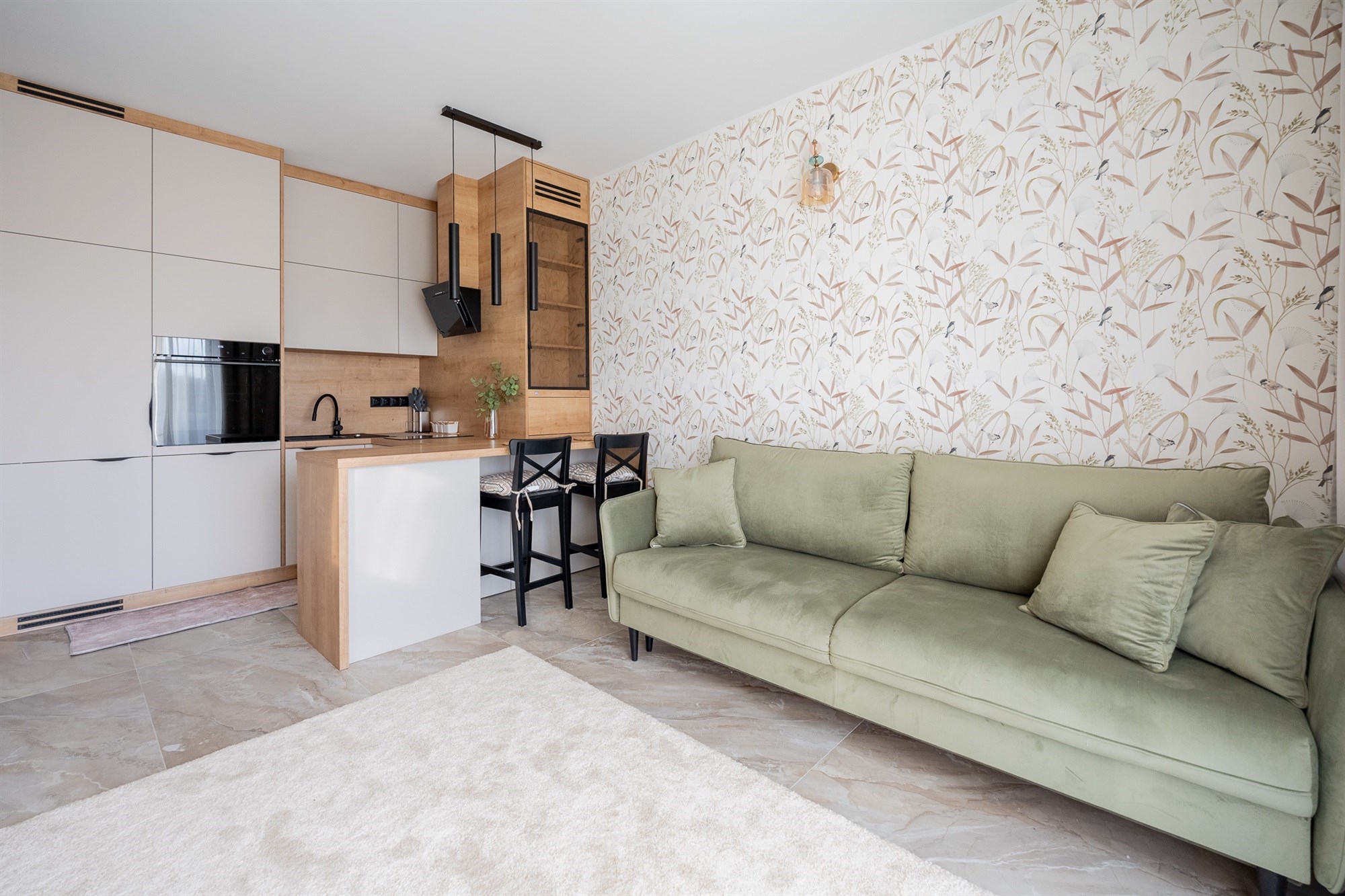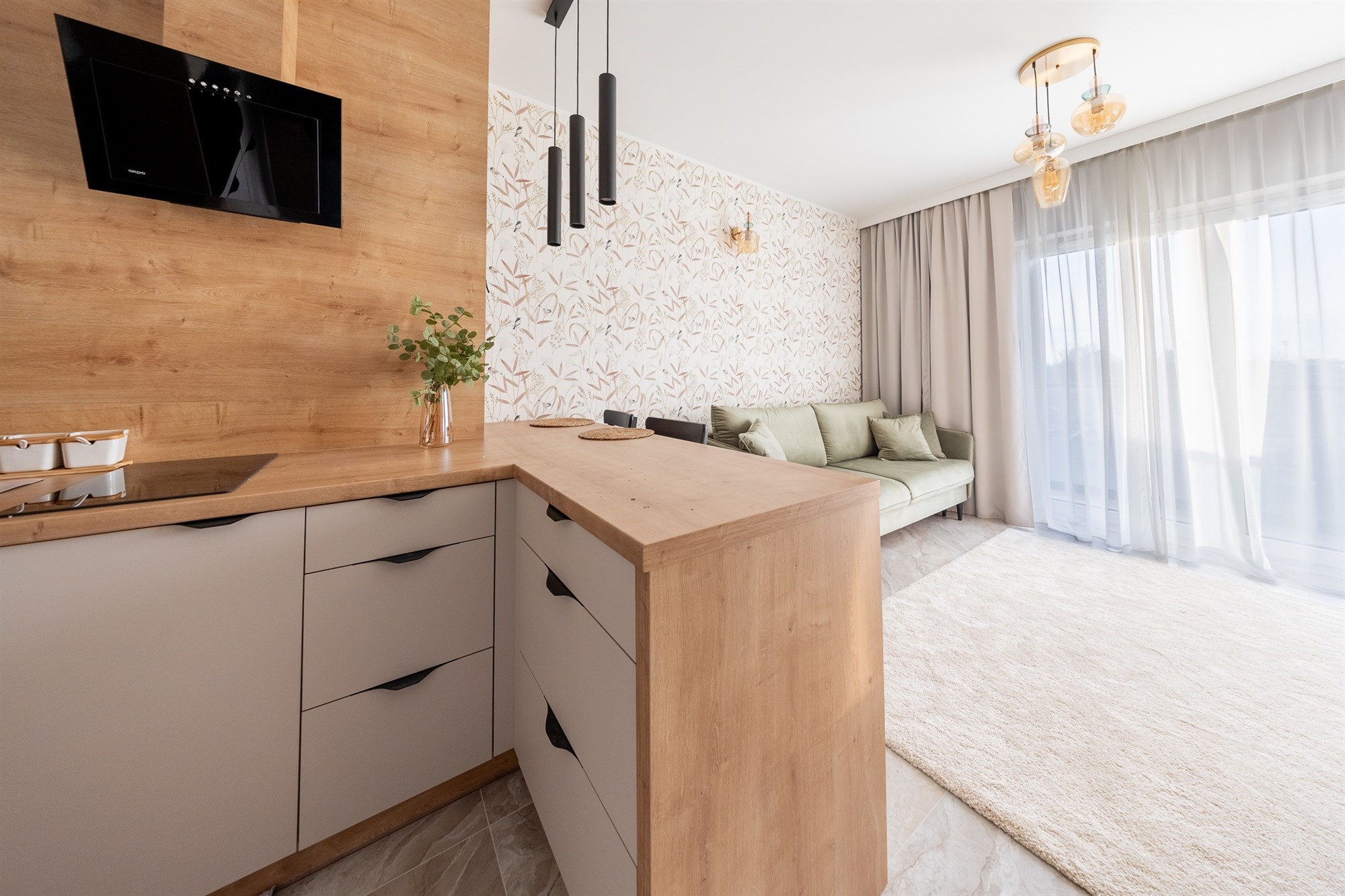 Mieszkanie wykończone jest materiałami z najwyższej jakości, które tworzą elegancką i funkcjonalną przestrzeń do codziennego życia.