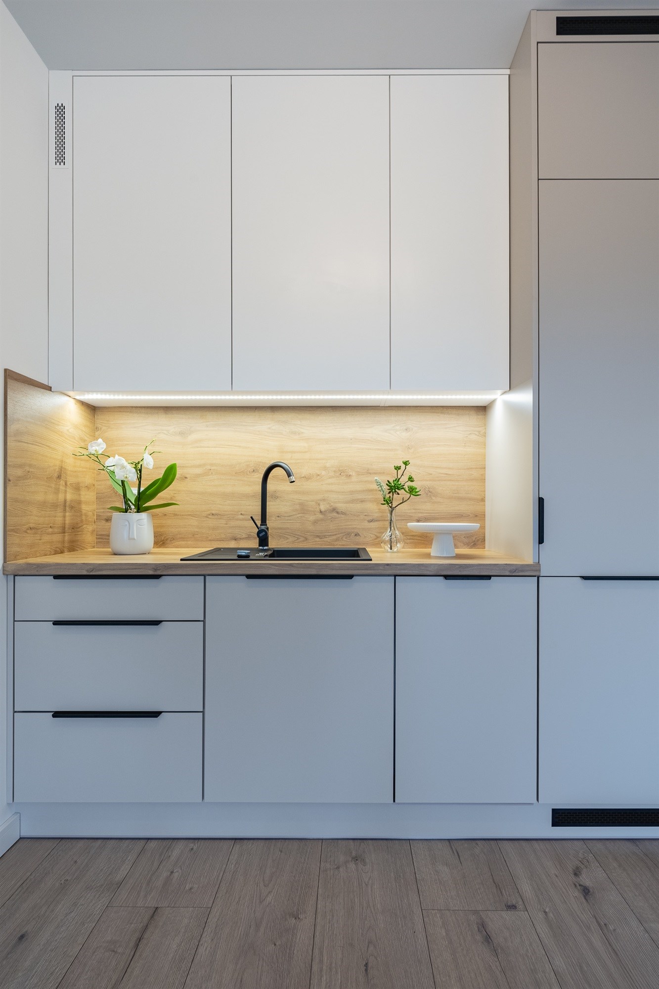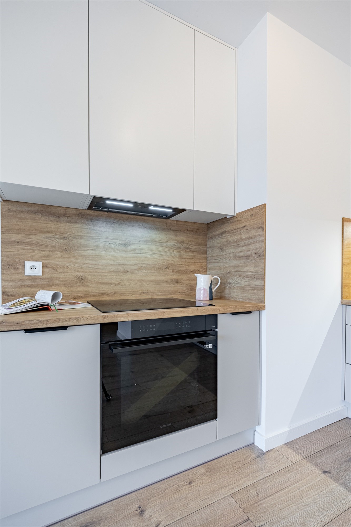 - Kuchnia – nowa zabudowa meblowa wraz z kompletnym sprzętem AGD (piekarnik, płyta, okap, zmywarka, lodówka). Całość utrzymana w nowoczesnej stylistyce, gotowa do codziennego użytkowania.