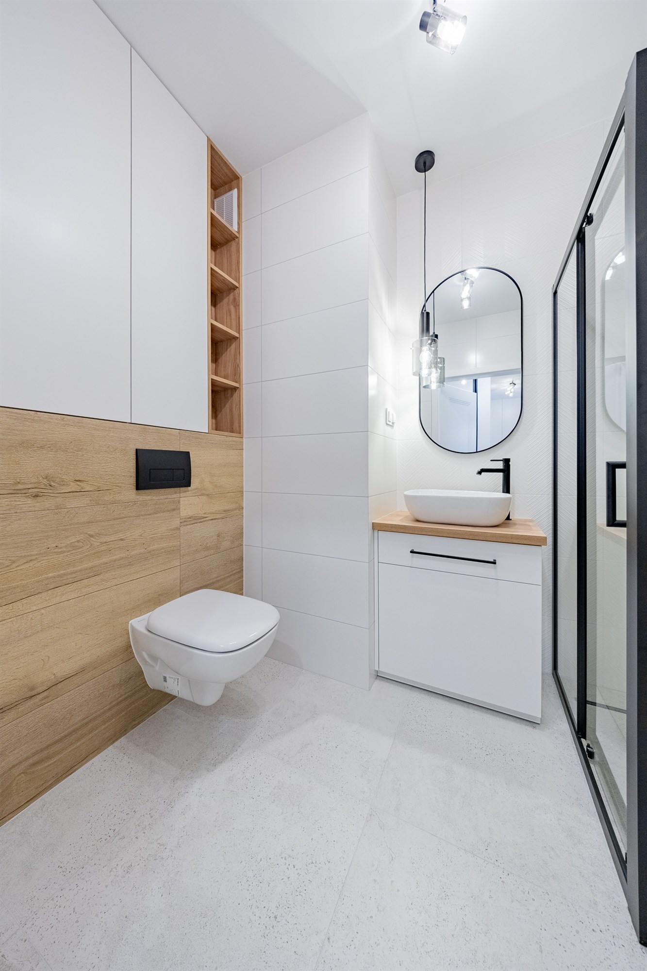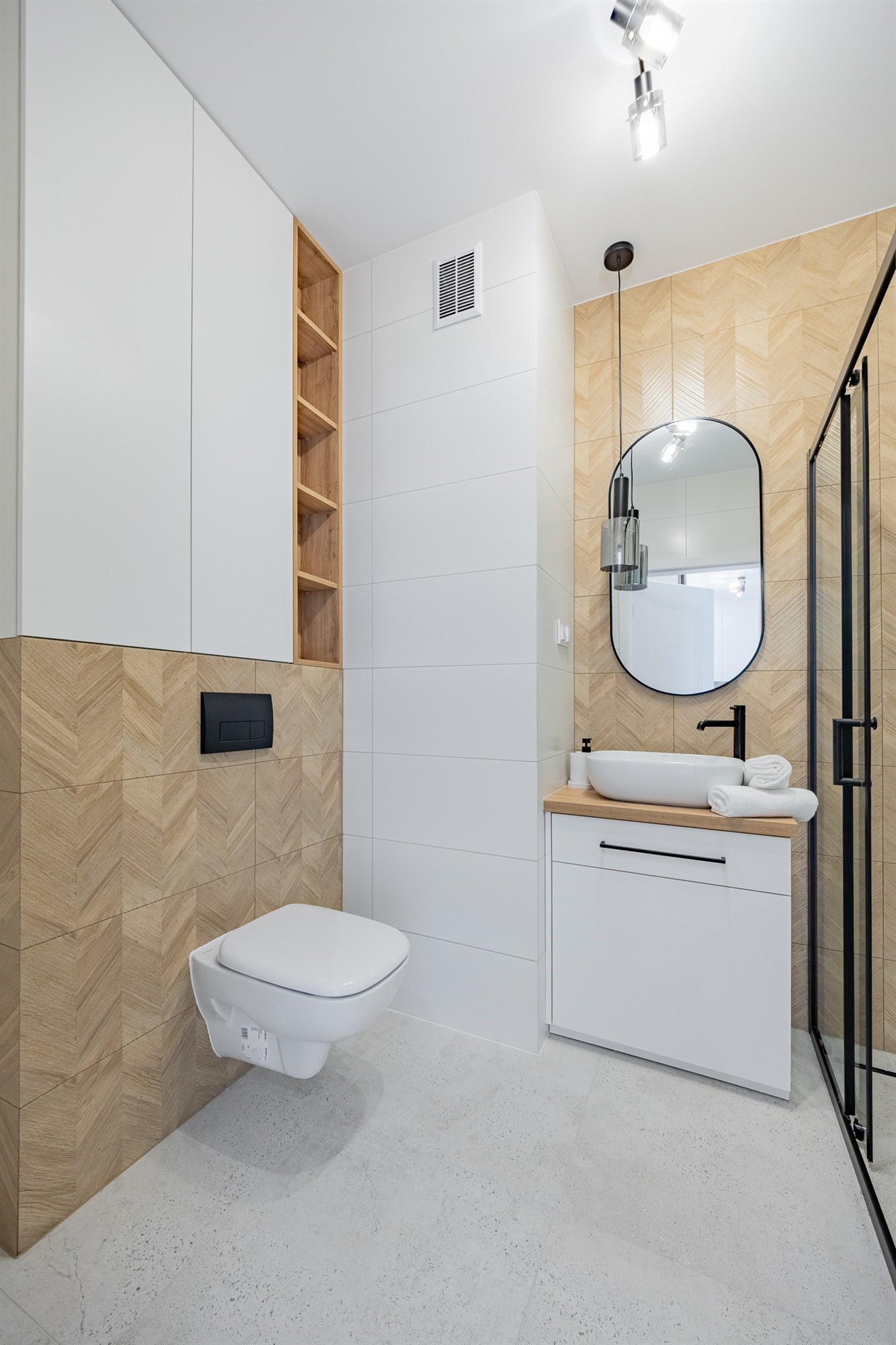 - Łazienka – elegancka, funkcjonalna przestrzeń z zabudowanymi szafkami, kabiną prysznicową oraz miejscem na pralkę.