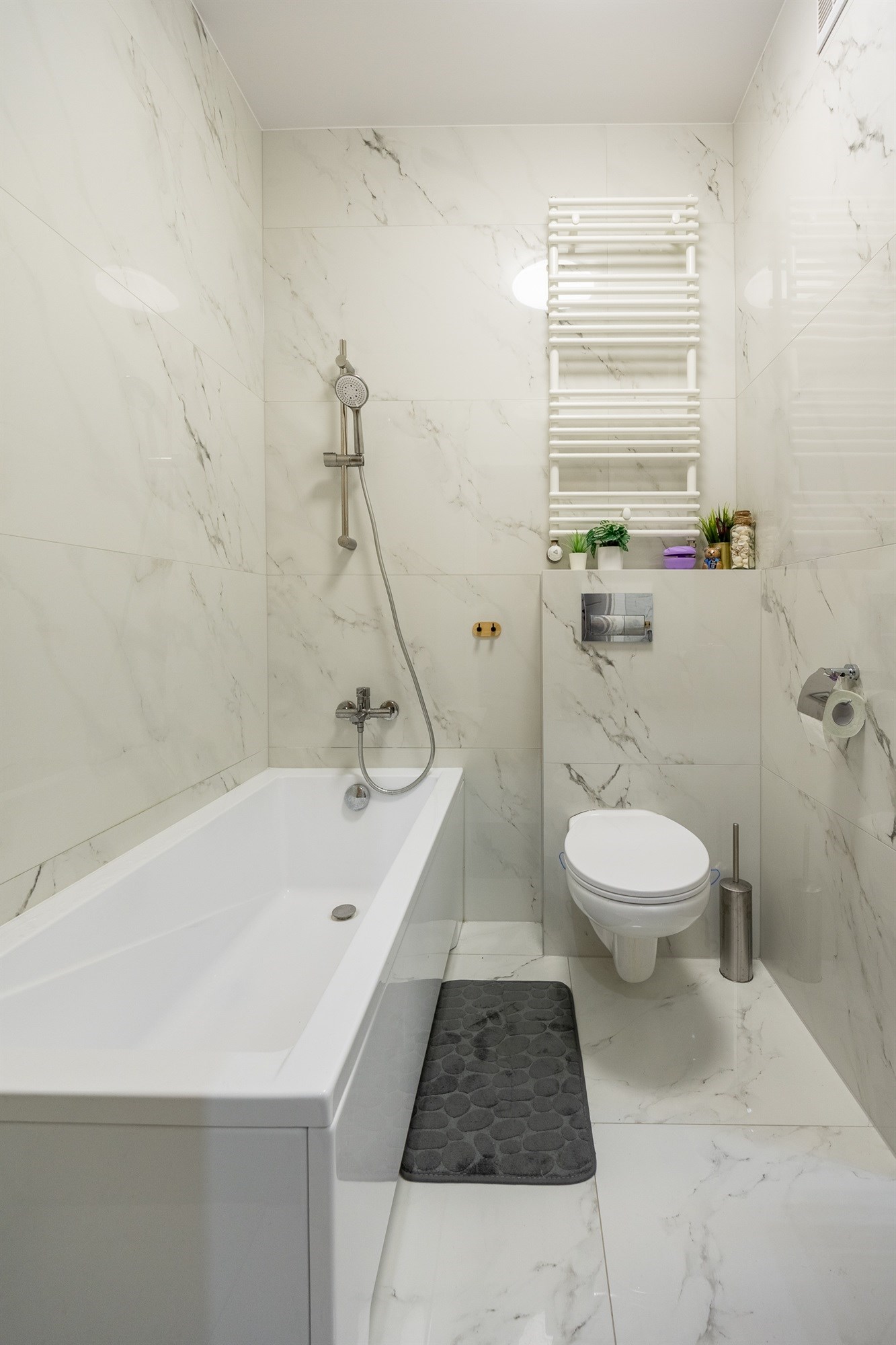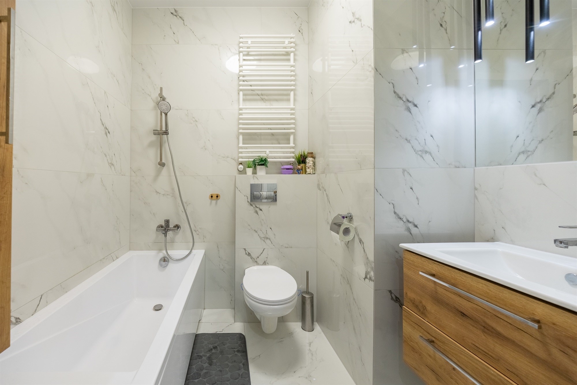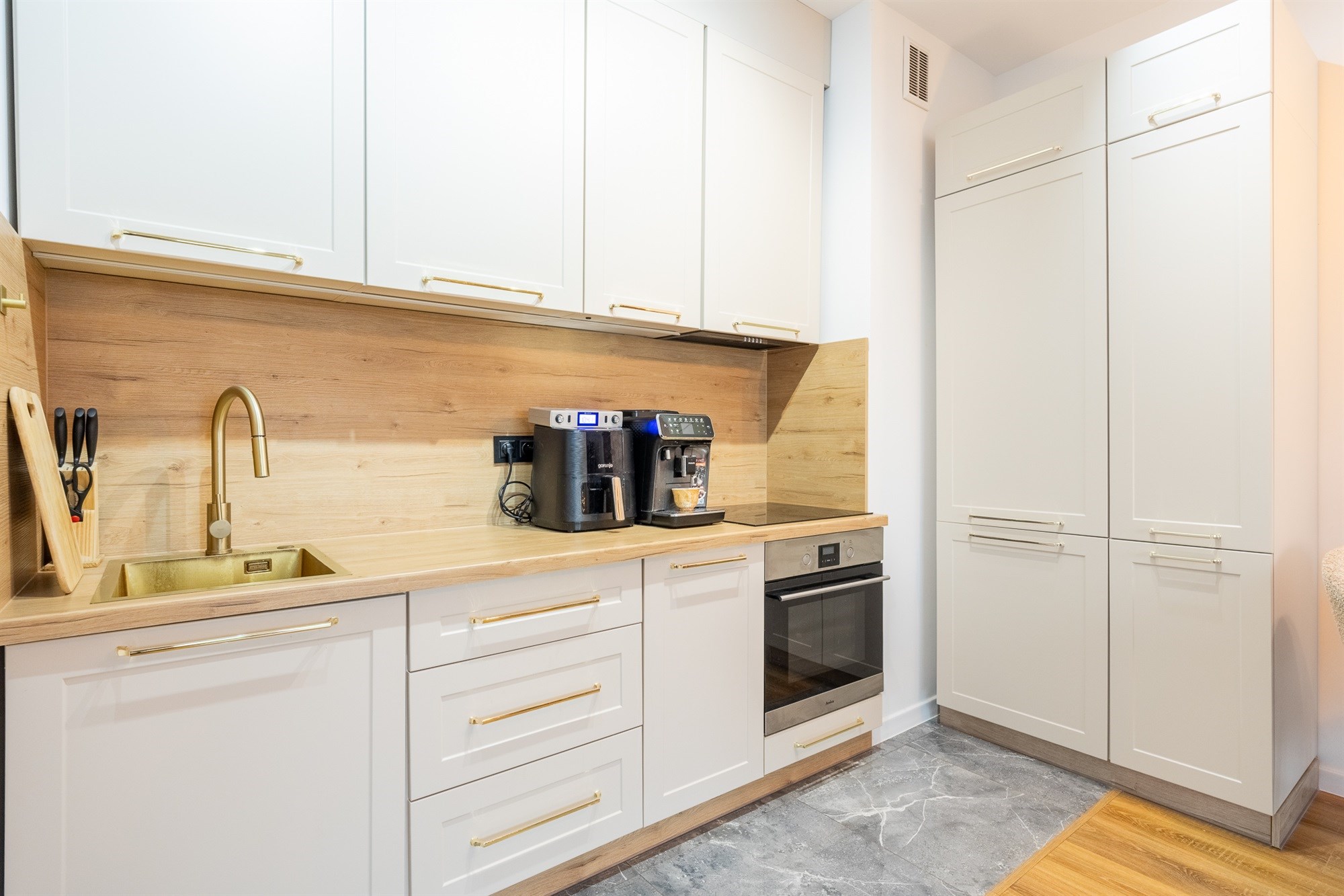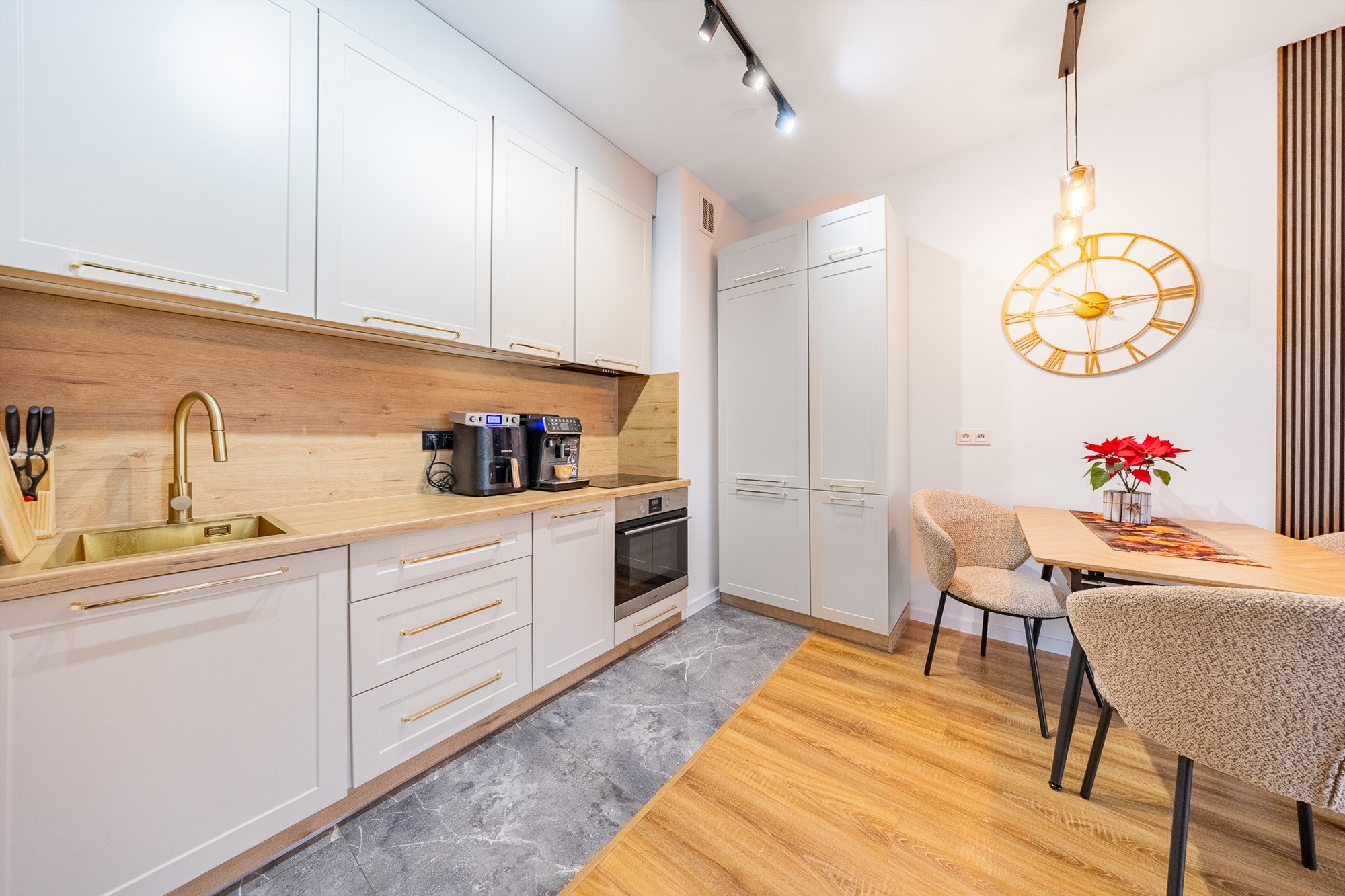 Kuchnia została wykończona wysokiej klasy zabudową na wymiar wraz z kompletnym sprzętem AGD, co pozwala nowemu właścicielowi wprowadzić się bez konieczności dodatkowych nakładów.