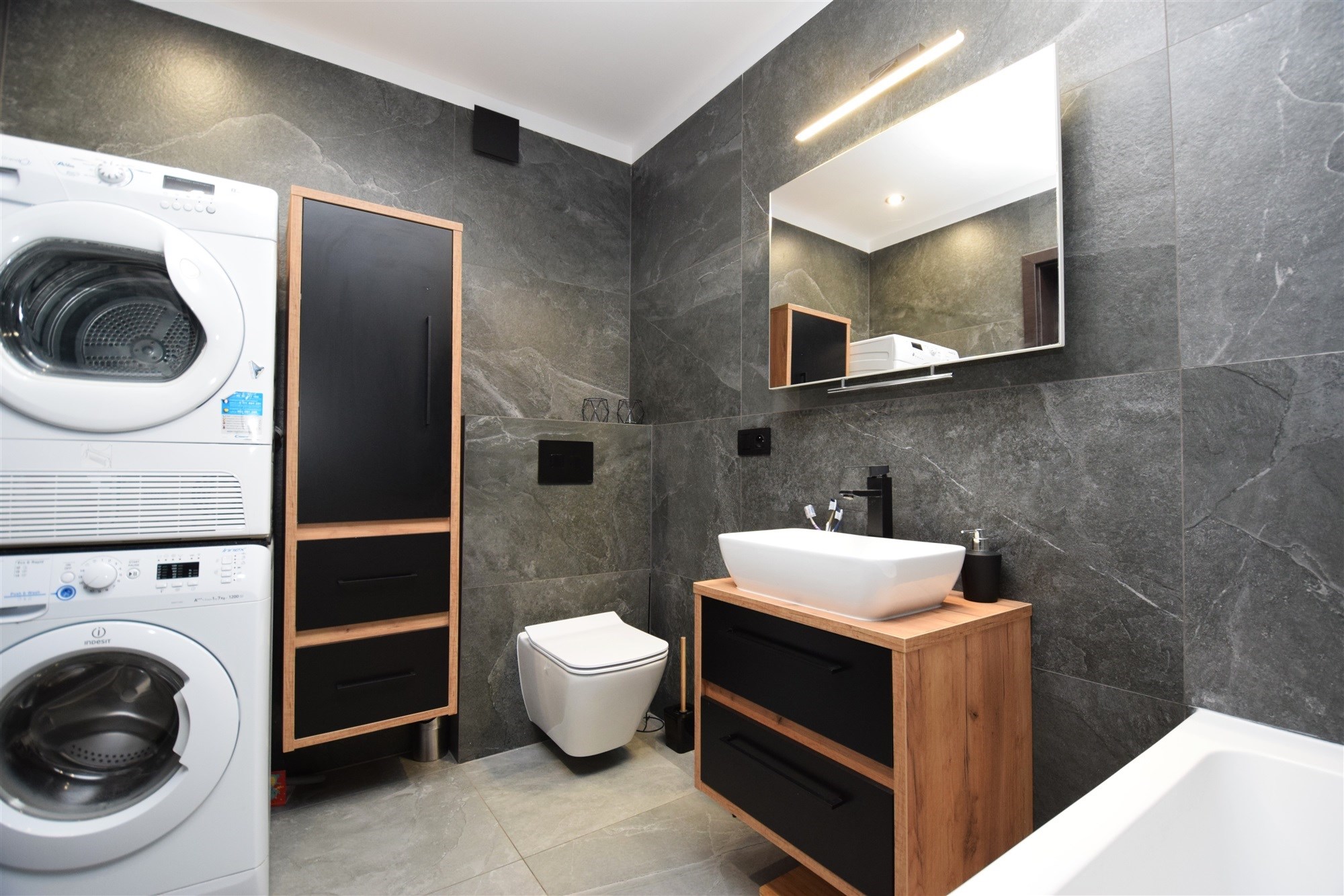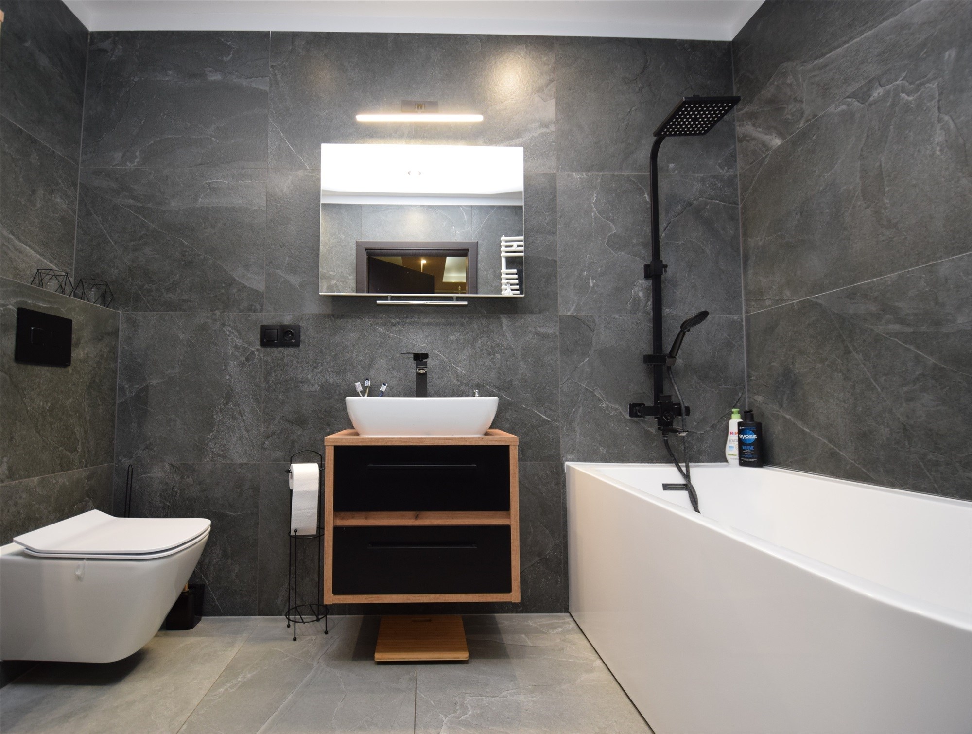 • Łazienka z wanną (5,60 m²) — miejsce relaksu po intensywnym dniu.