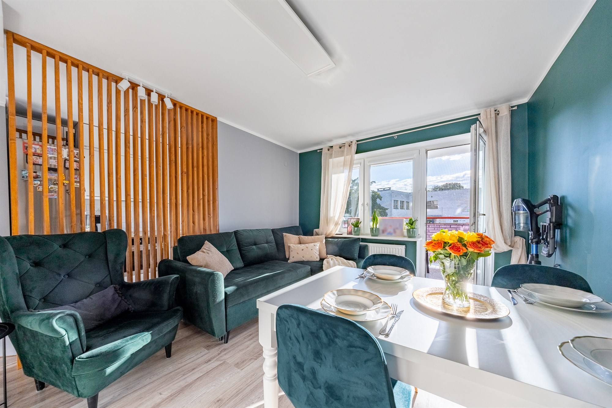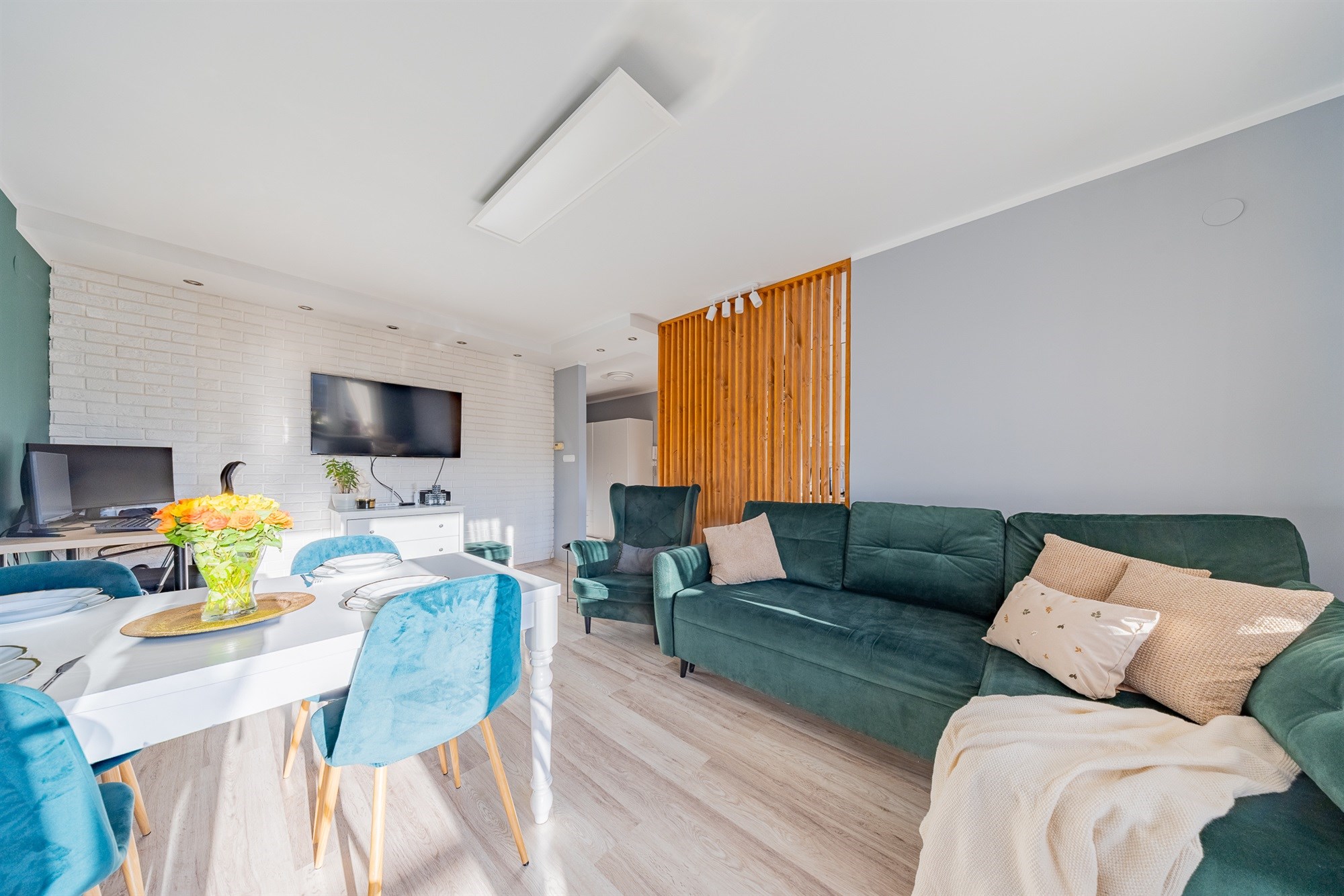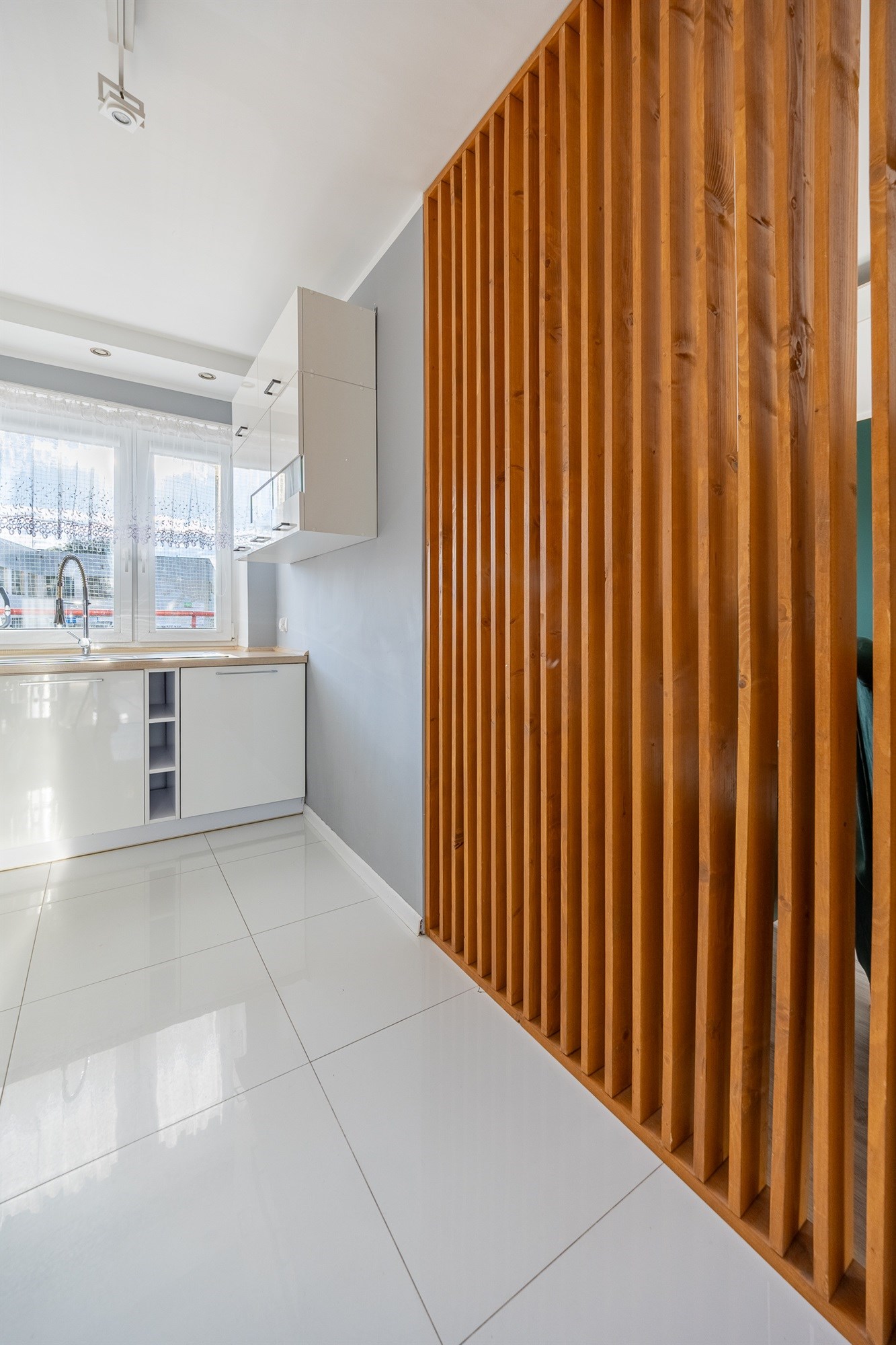 Trzy niezależne pokoje, w tym przestronny salon połączony z kuchnią i przedpokojem w sposób otwarty, ale klimatyczny – kuchnia oddzielona od części dziennej eleganckimi lamelami, które nadają wnętrzu nowoczesny charakter i subtelnie wydzielają strefy funkcjonalne.