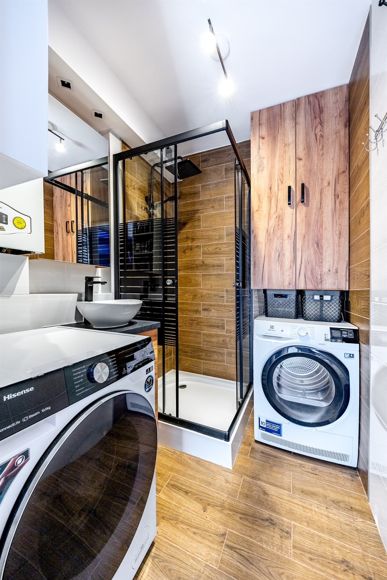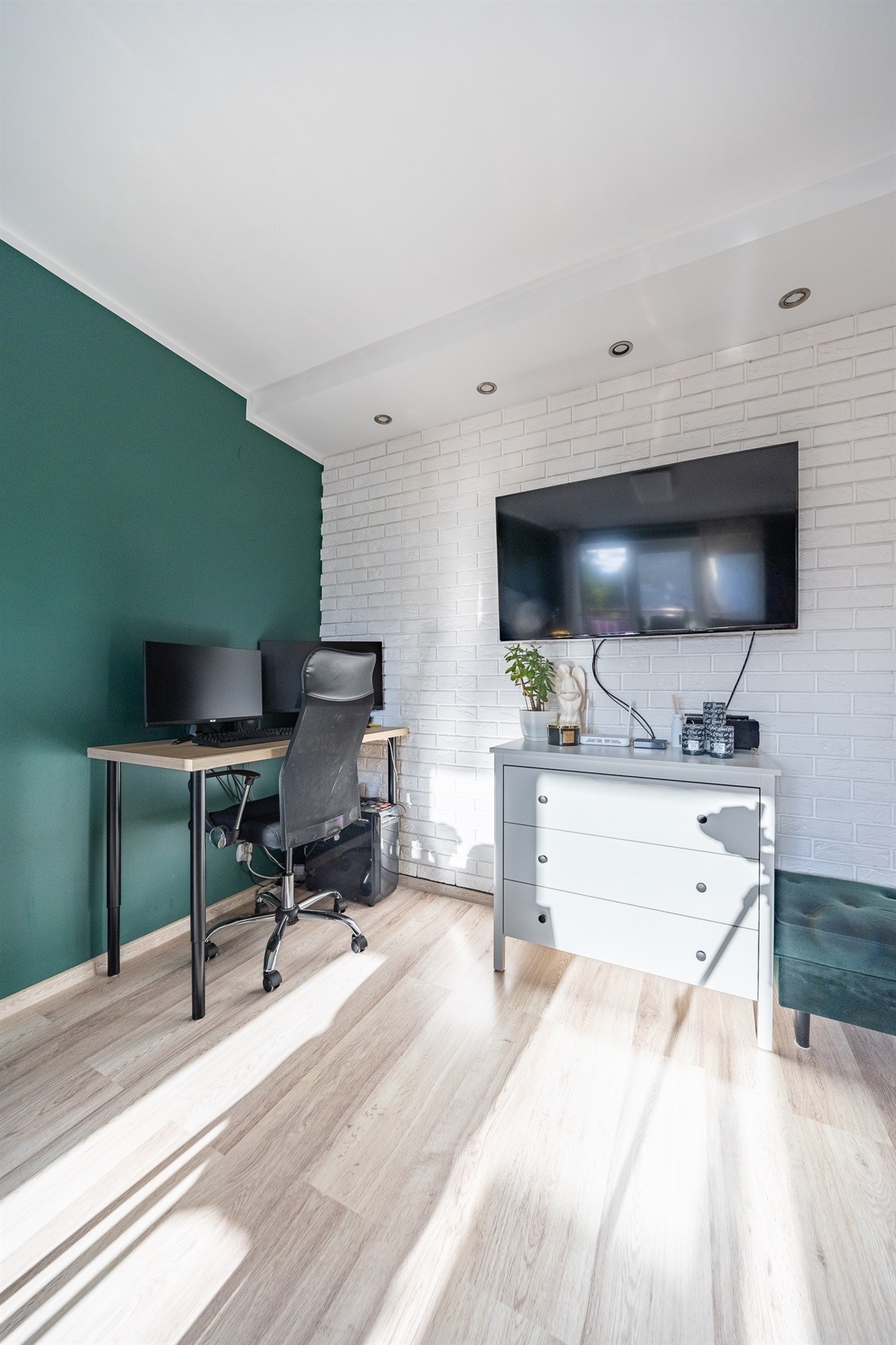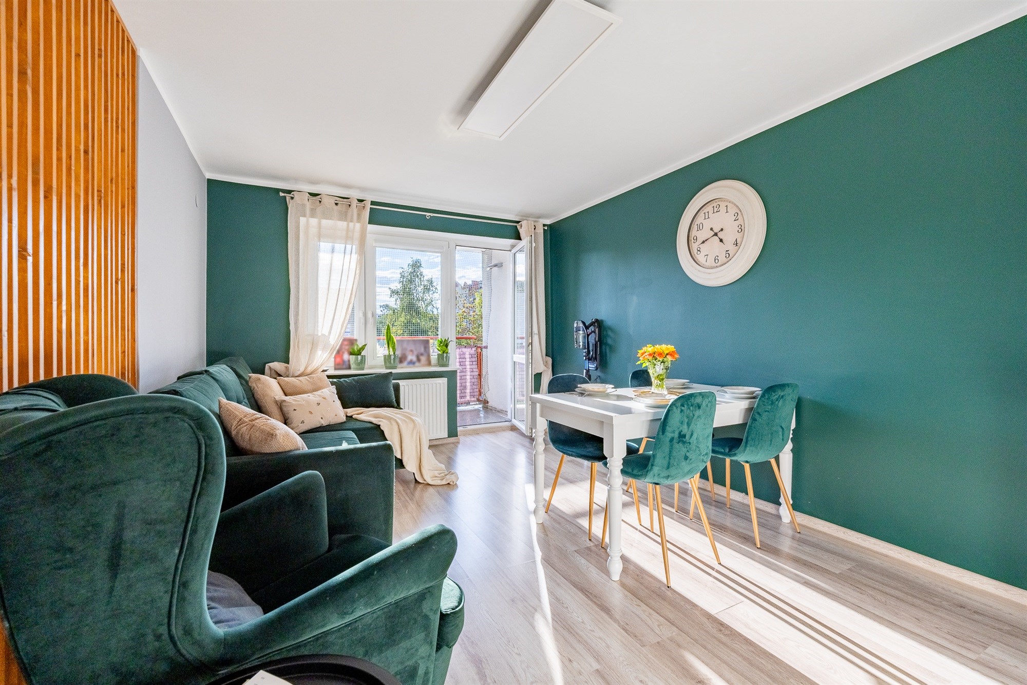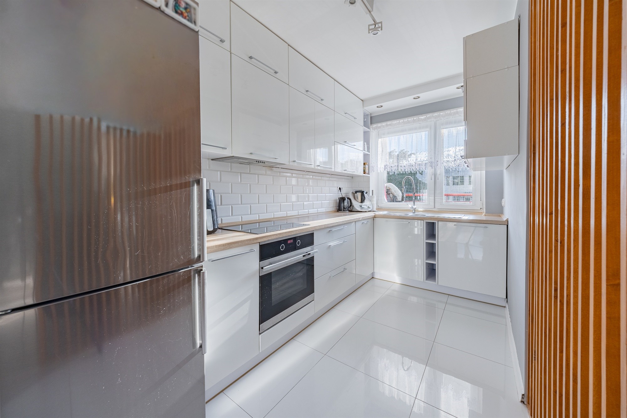Trzy niezależne pokoje, w tym przestronny salon połączony z kuchnią i przedpokojem w sposób otwarty, ale klimatyczny – kuchnia oddzielona od części dziennej eleganckimi lamelami, które nadają wnętrzu nowoczesny charakter i subtelnie wydzielają strefy funkcjonalne.