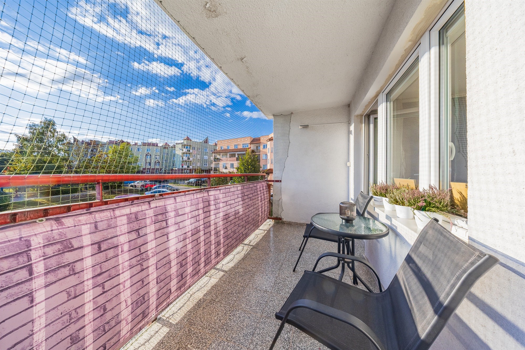 Duża loggia z widokiem na zieleń – idealna do wypoczynku, porannej kawy czy popołudniowego relaksu.