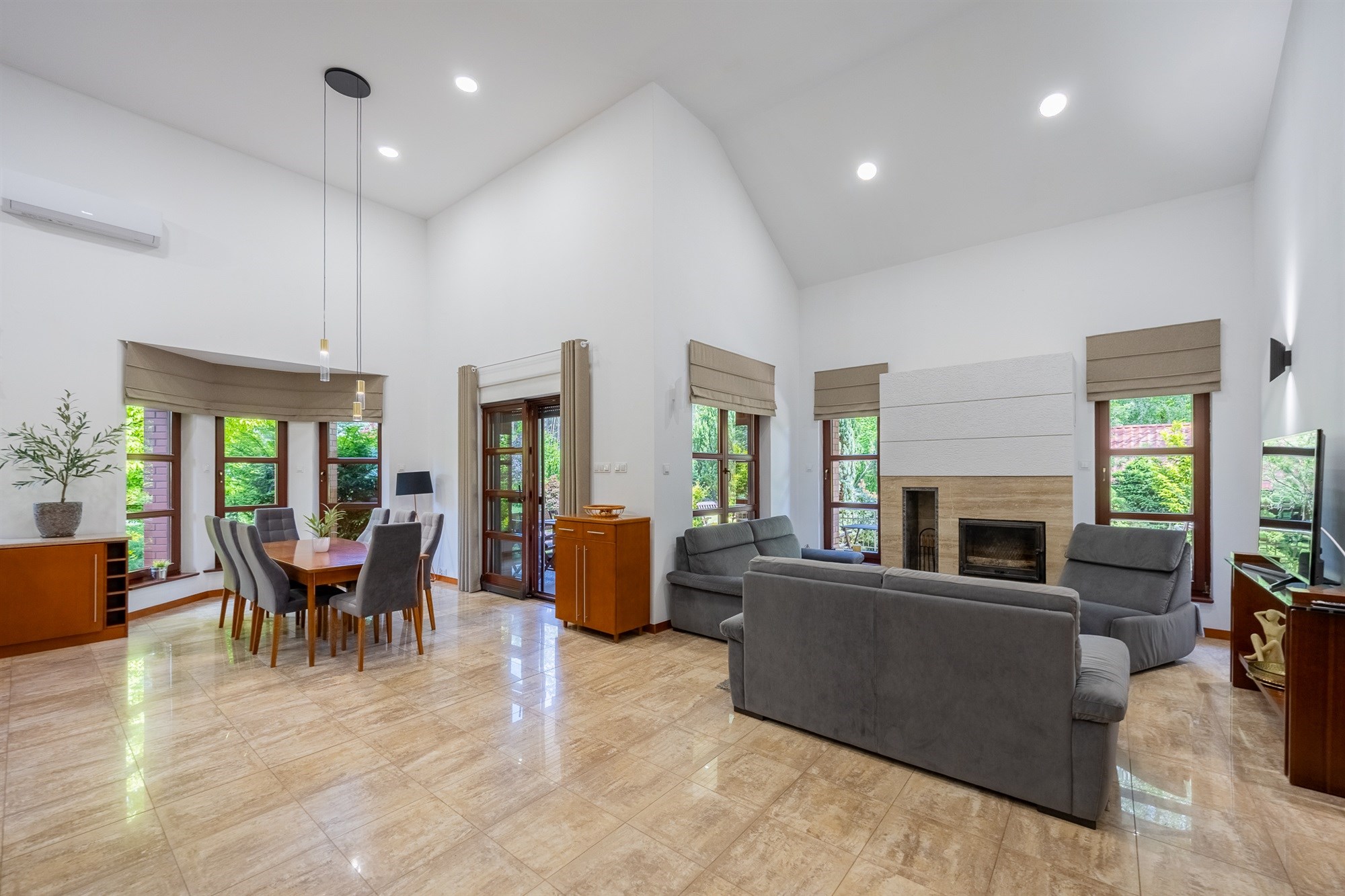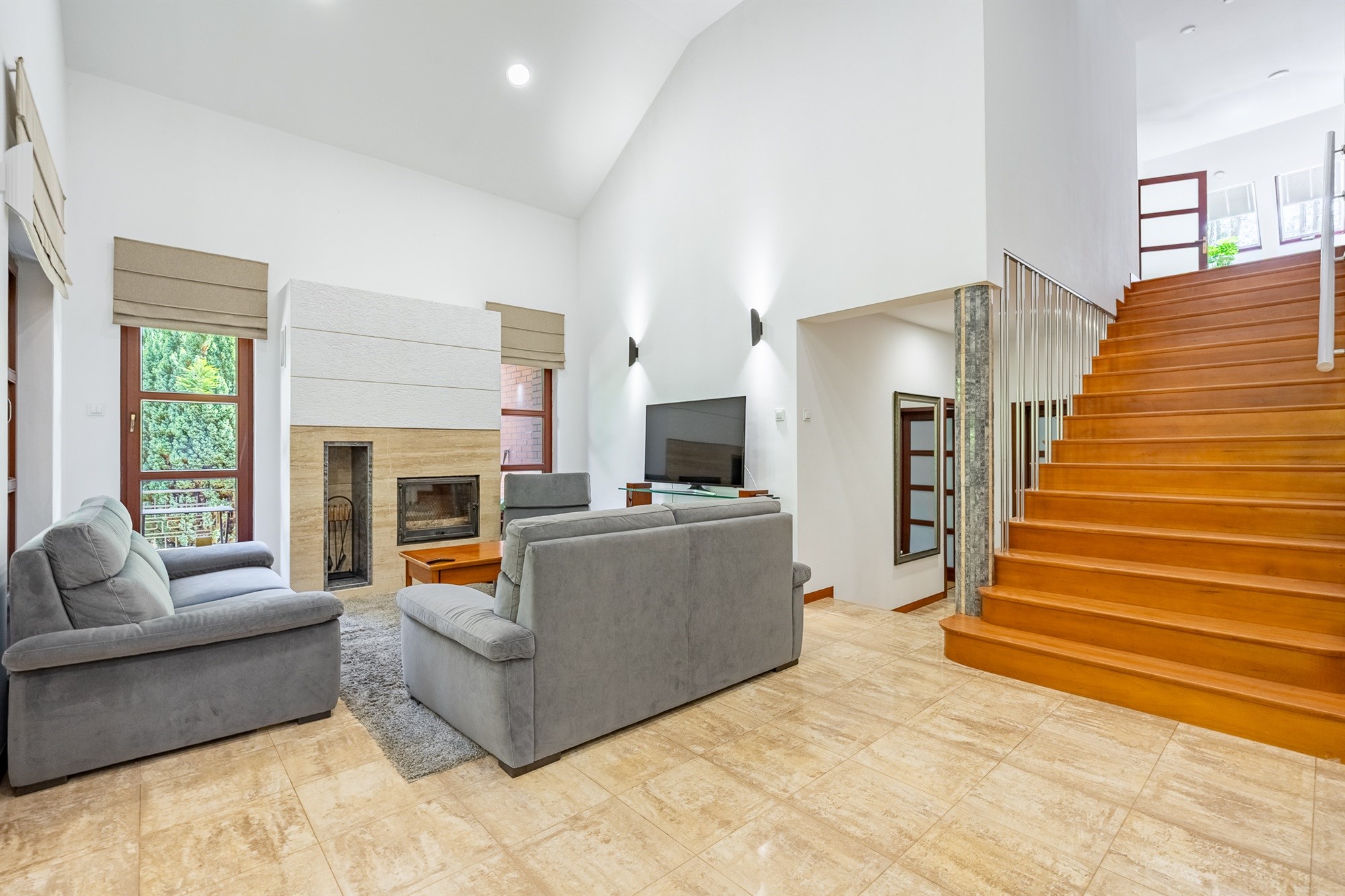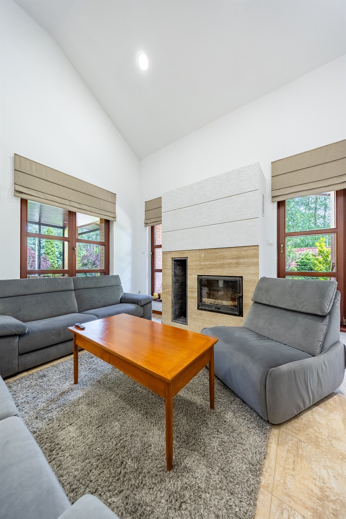 Salon z sufitem katedralnym – przestronny, pełen naturalnego światła, z kominkiem i klimatyzacją, otwarty na jadalnię i kuchnię, co sprzyja integracji i tworzy idealną przestrzeń do wypoczynku.
