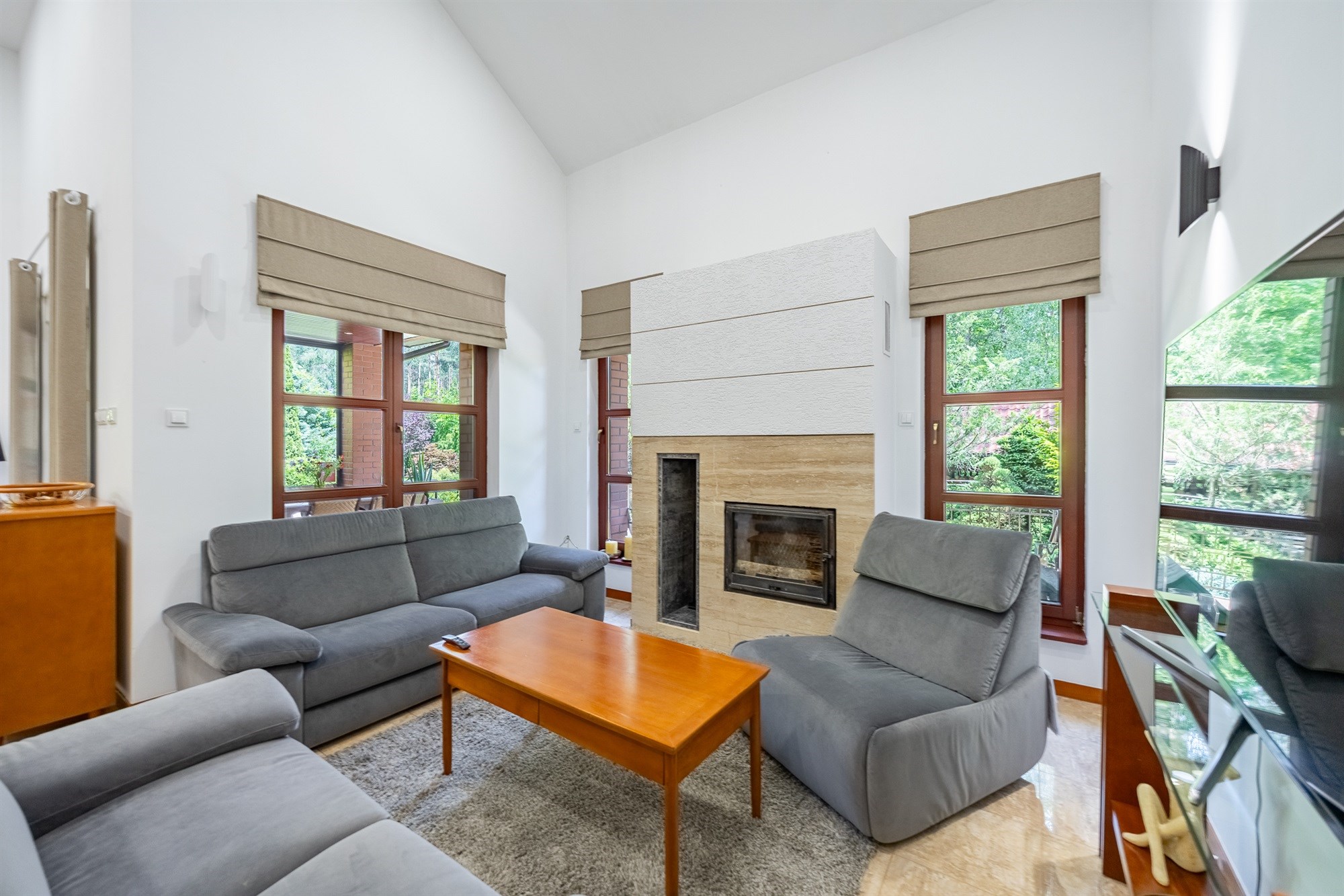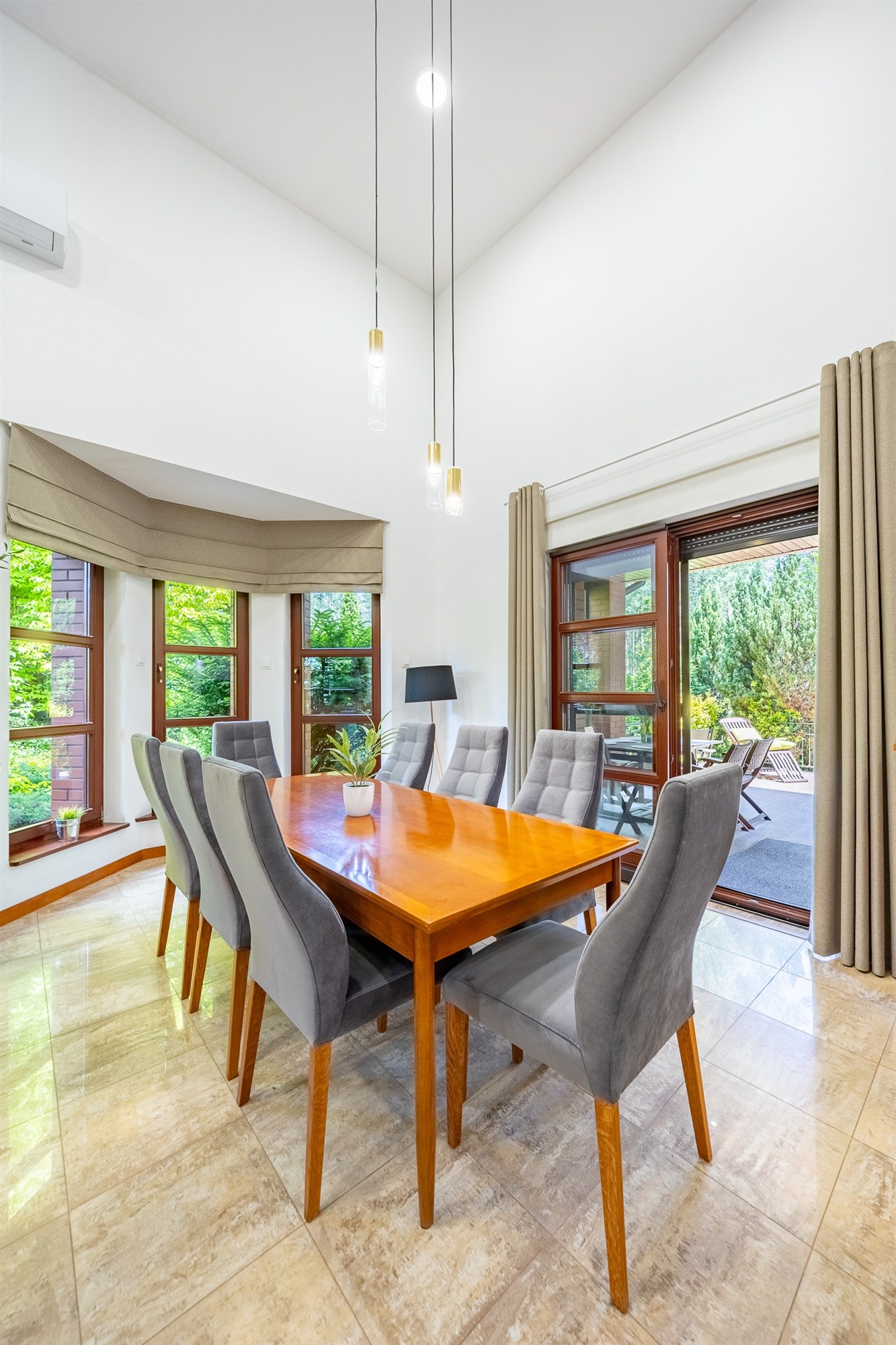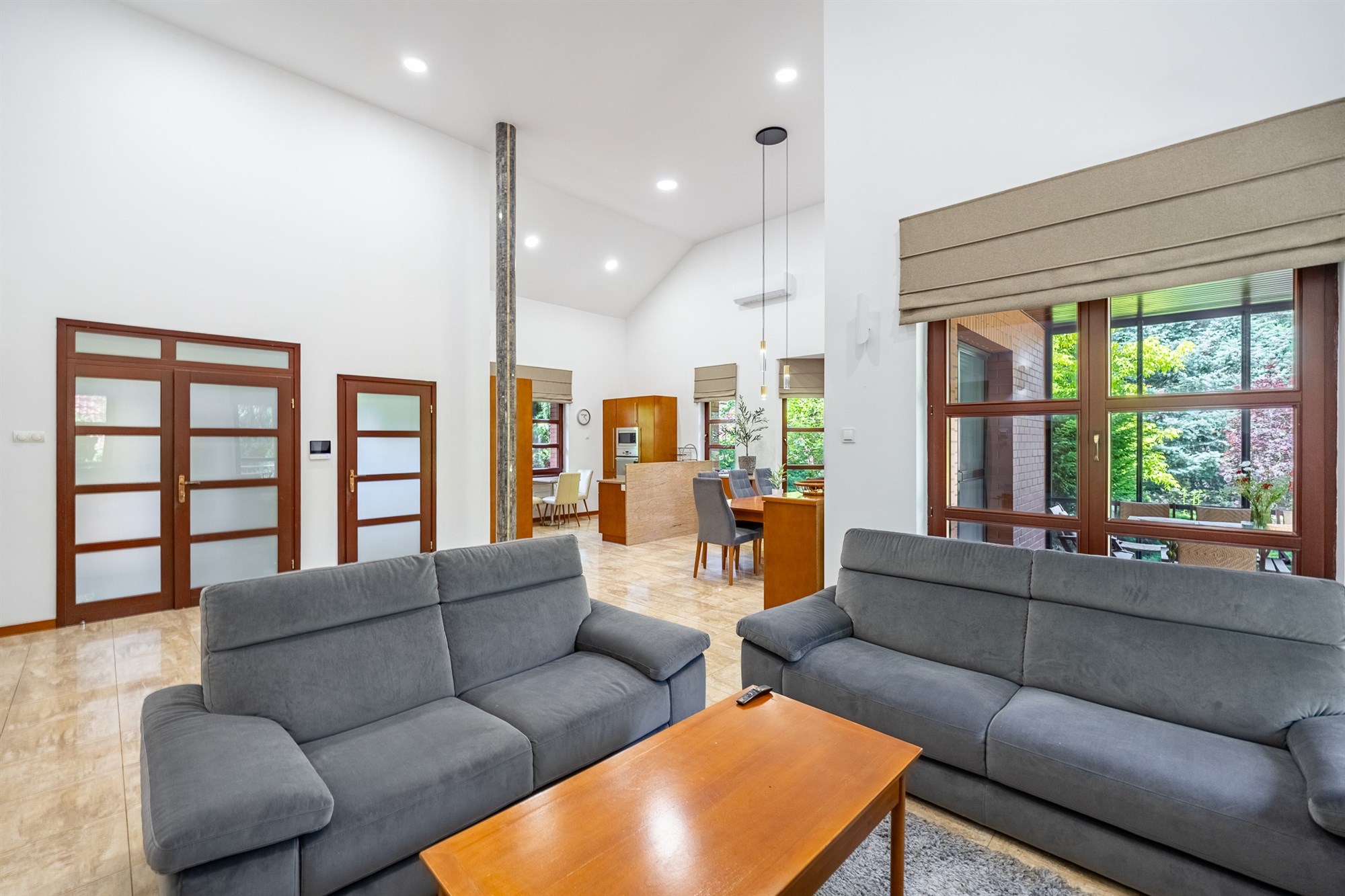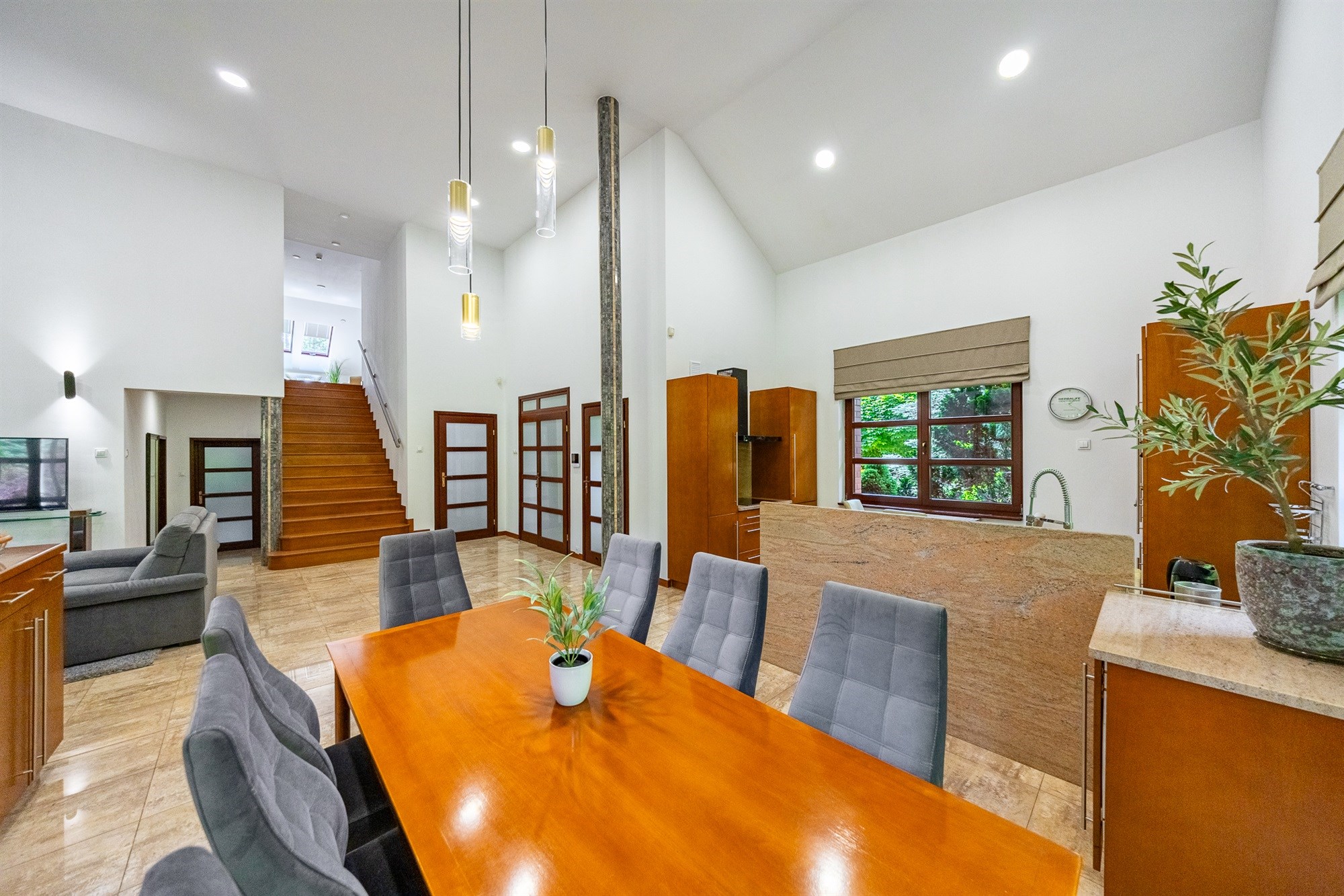 Salon z sufitem katedralnym – przestronny, pełen naturalnego światła, z kominkiem i klimatyzacją, otwarty na jadalnię i kuchnię, co sprzyja integracji i tworzy idealną przestrzeń do wypoczynku.