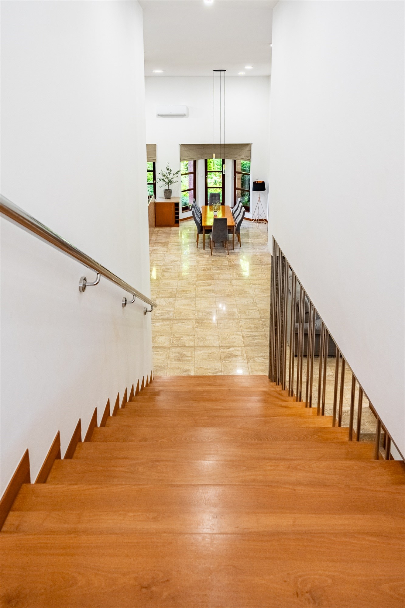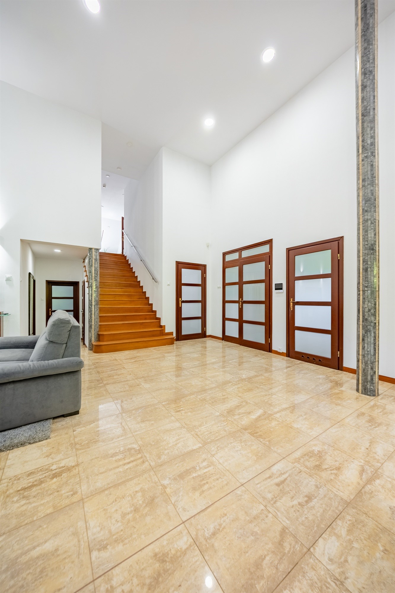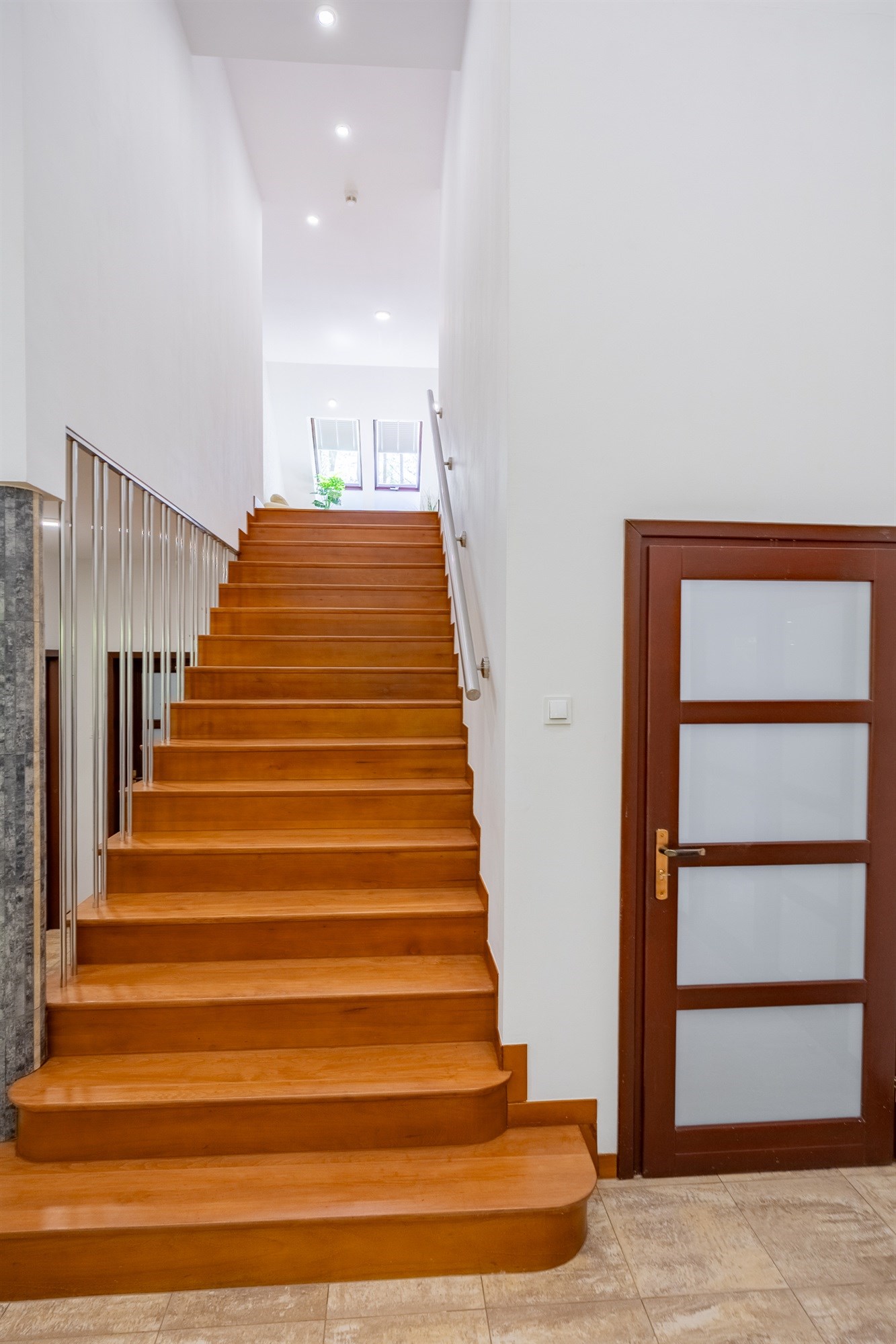 Reprezentacyjne schody prowadzące na piętro dodają całości prestiżu.