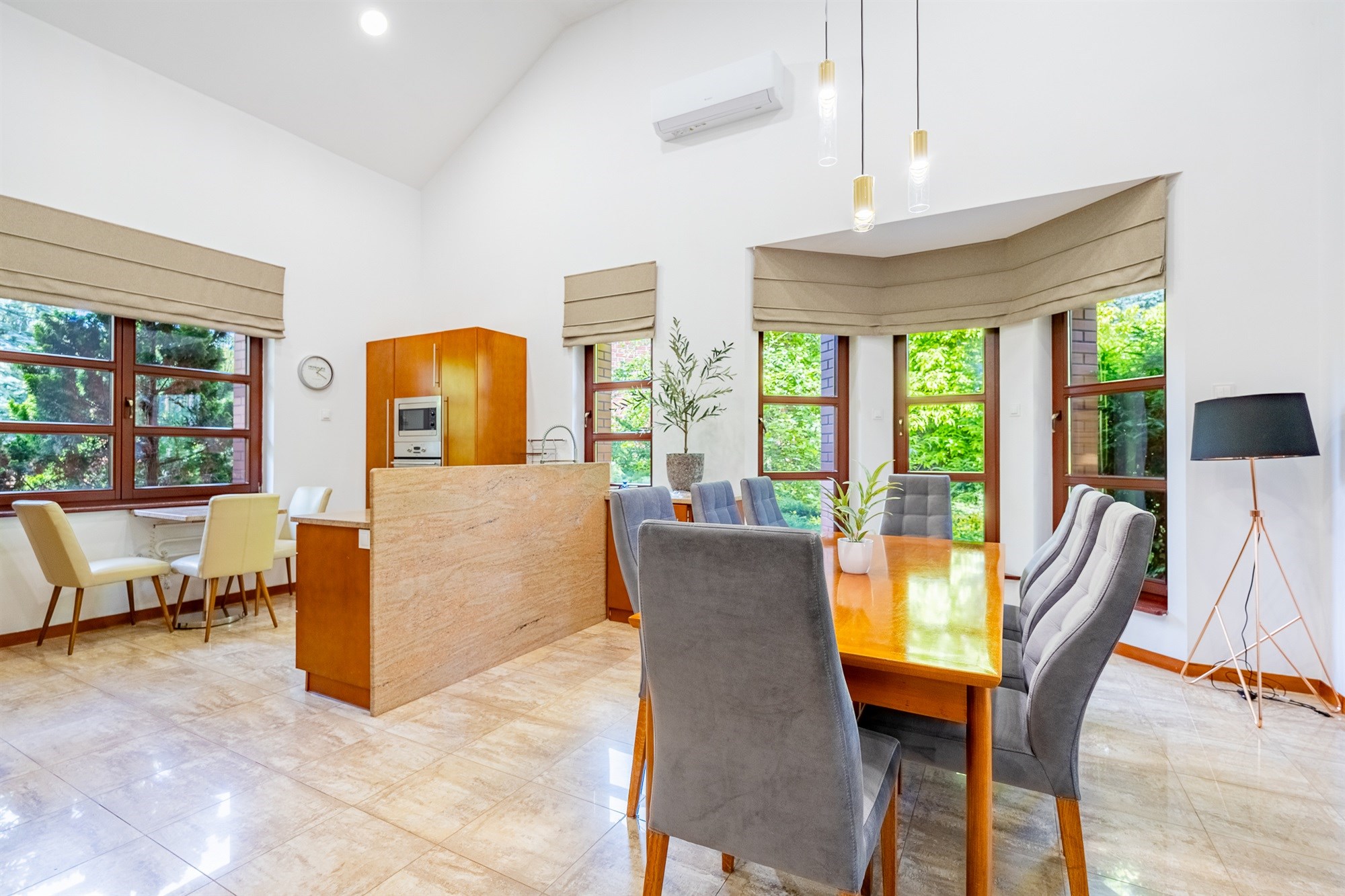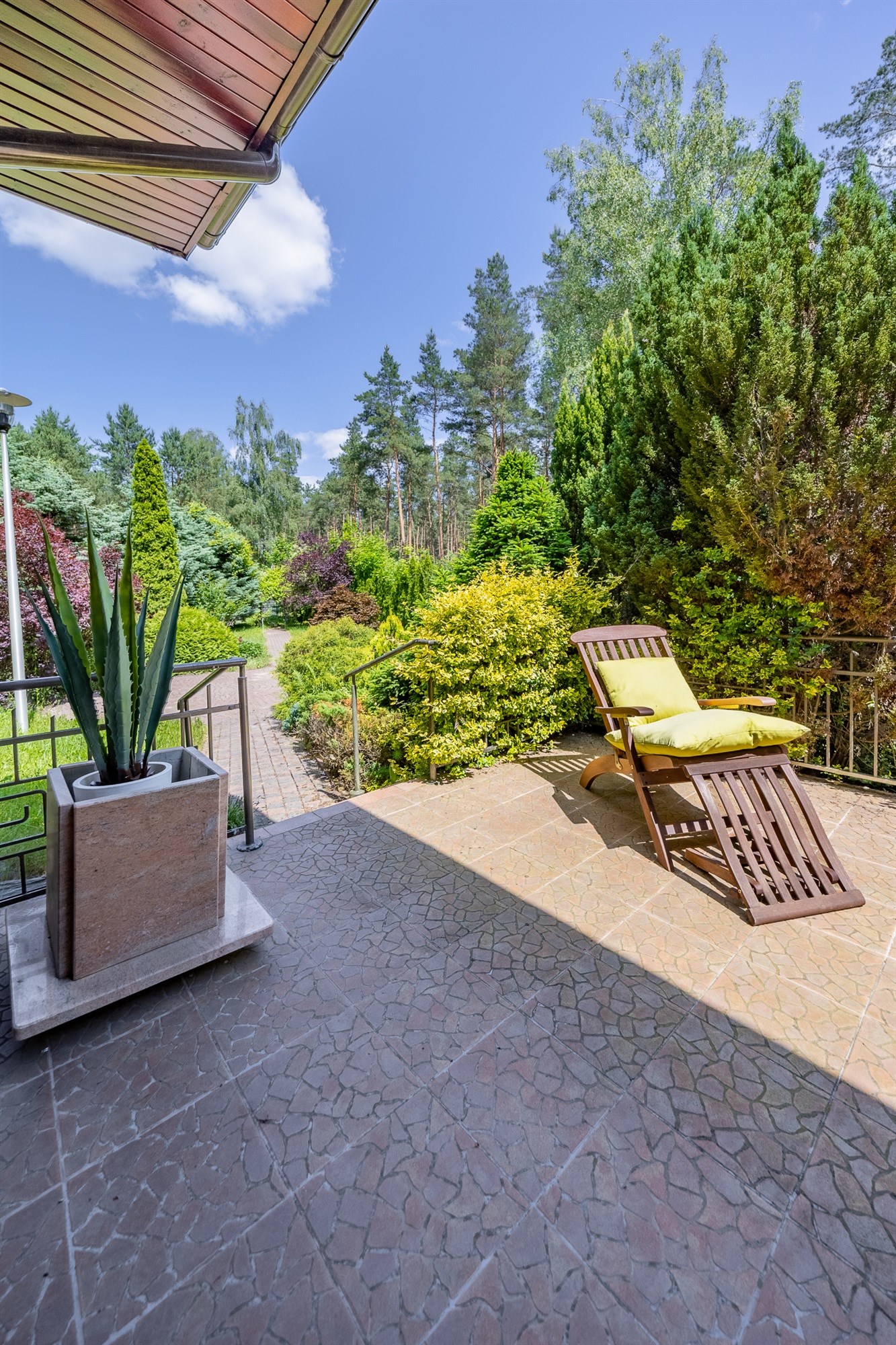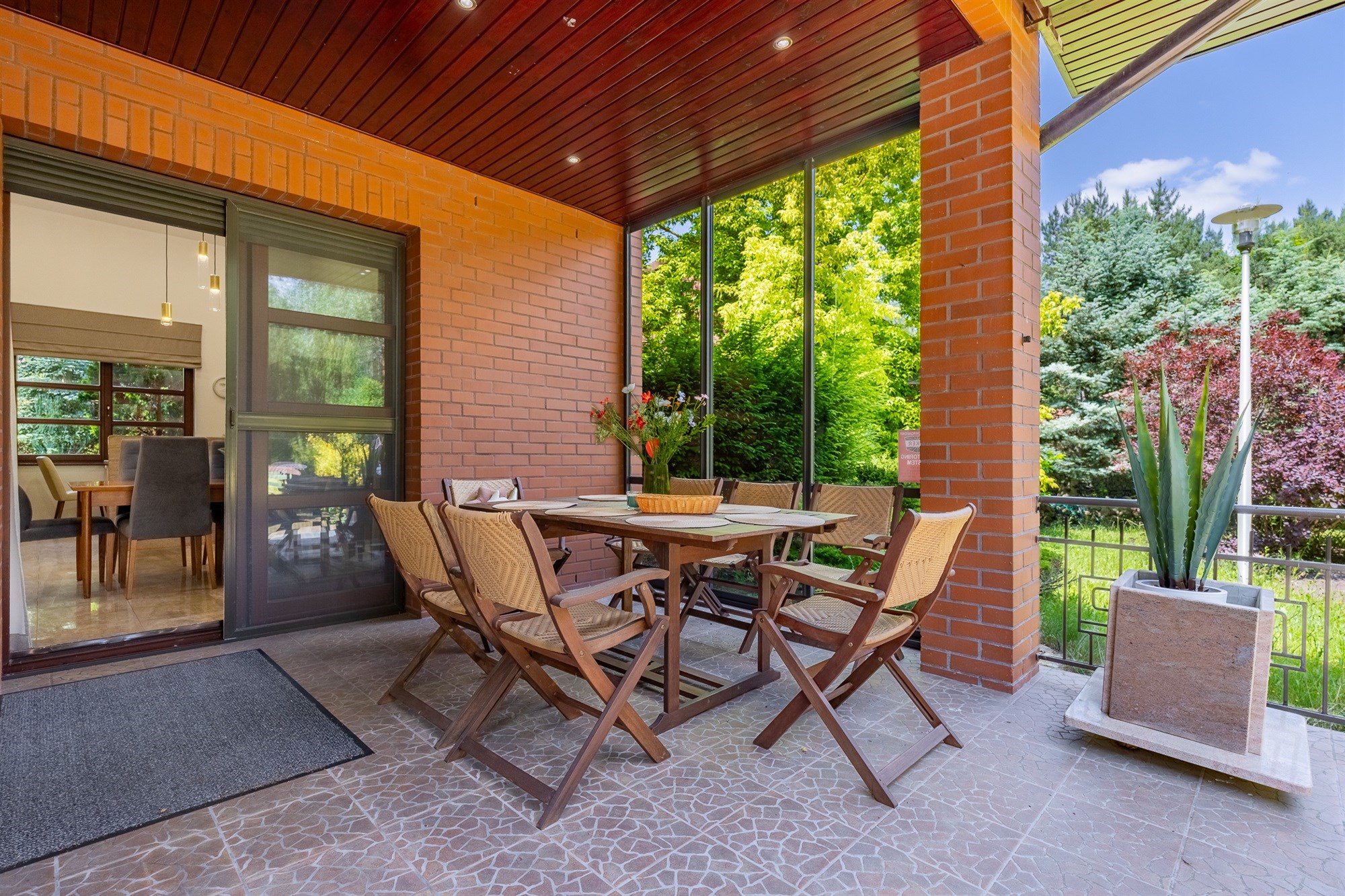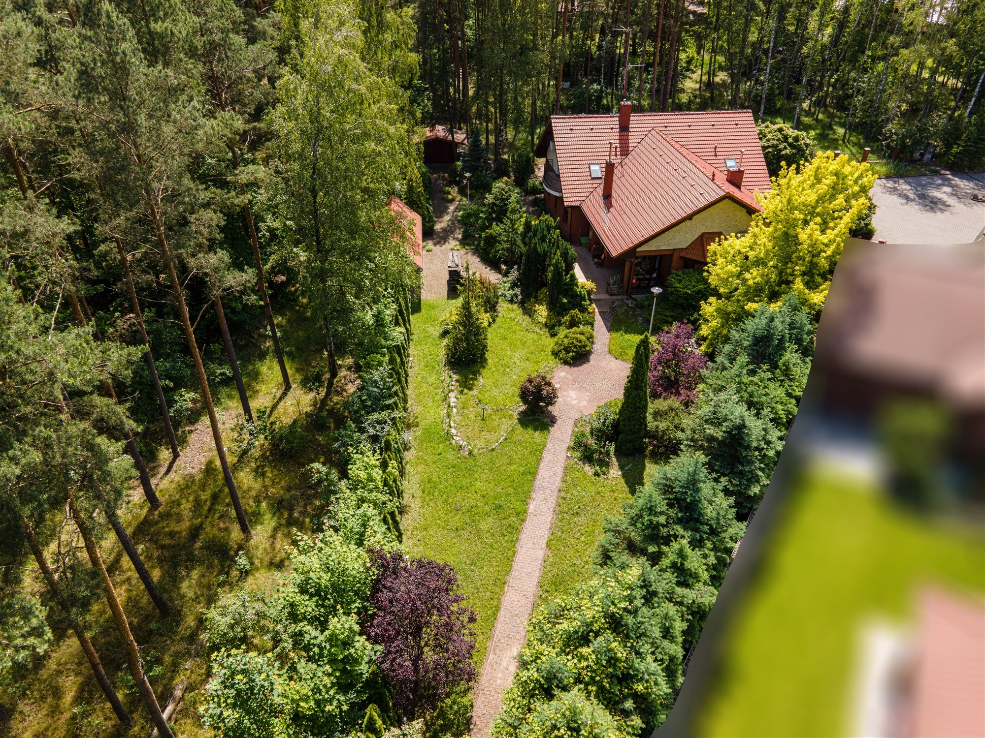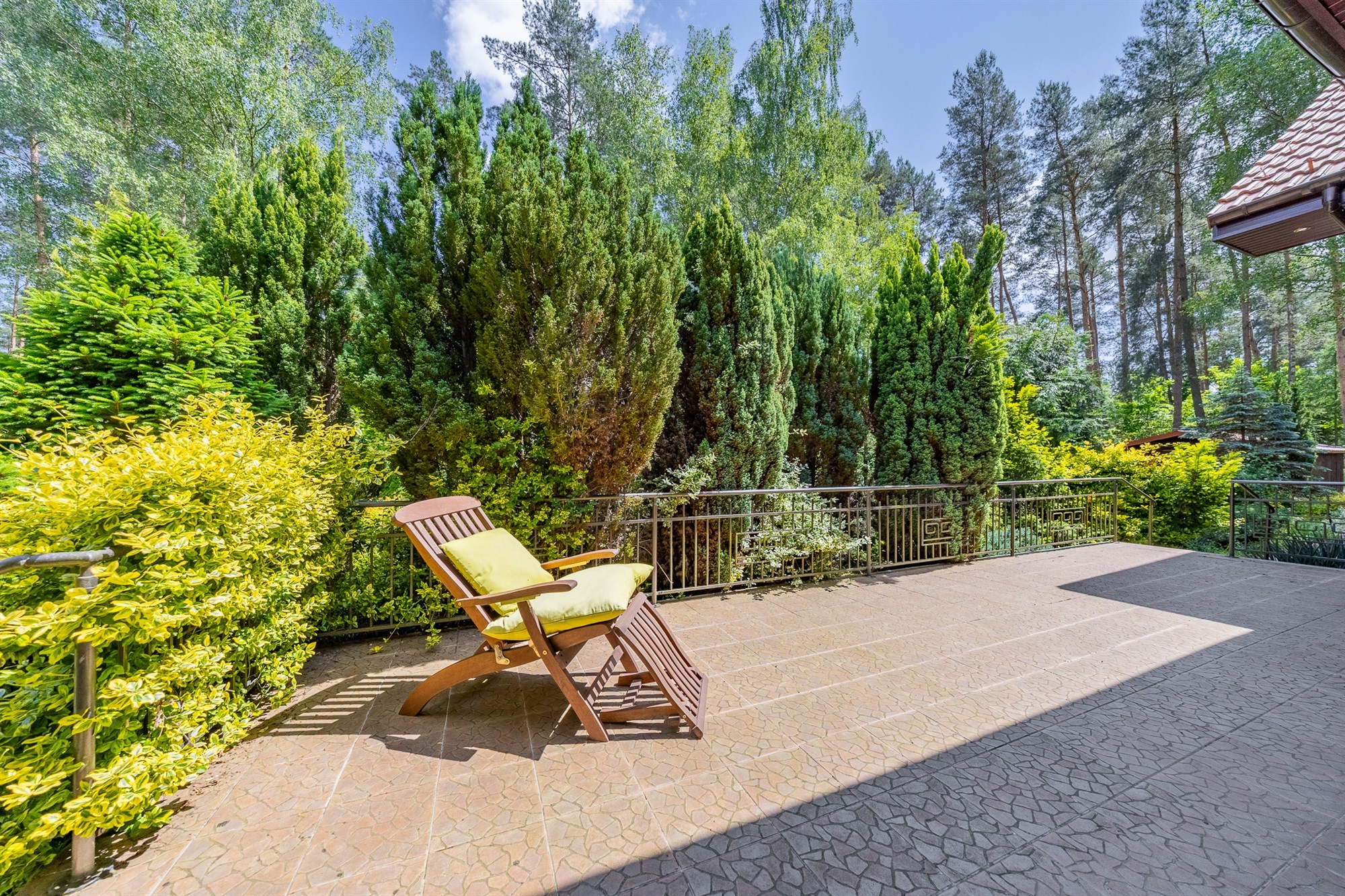 Ogród to prawdziwa perełka tej nieruchomości – starannie dobrane nasadzenia, różnorodne gatunki drzew i krzewów, kwiaty o zmiennej porze kwitnienia zapewniają piękno przez cały rok. Automatyczny system nawadniania ułatwia pielęgnację, a graniczący z działką las tworzy wyjątkowy mikroklimat i daje poczucie prywatności.