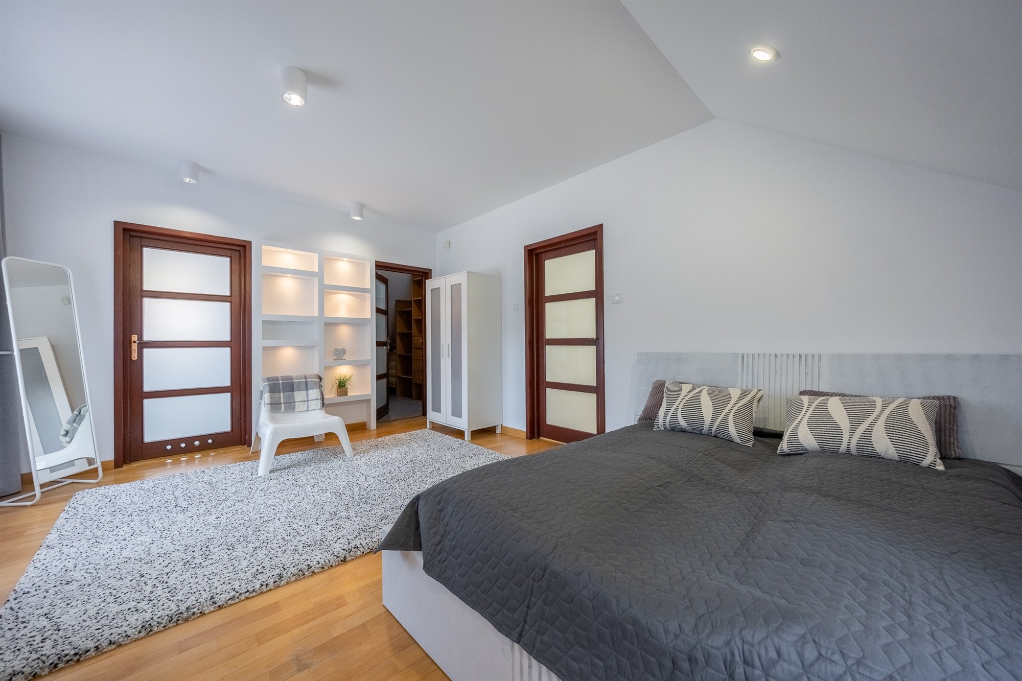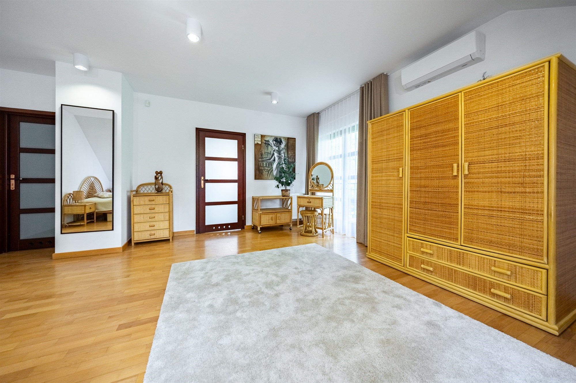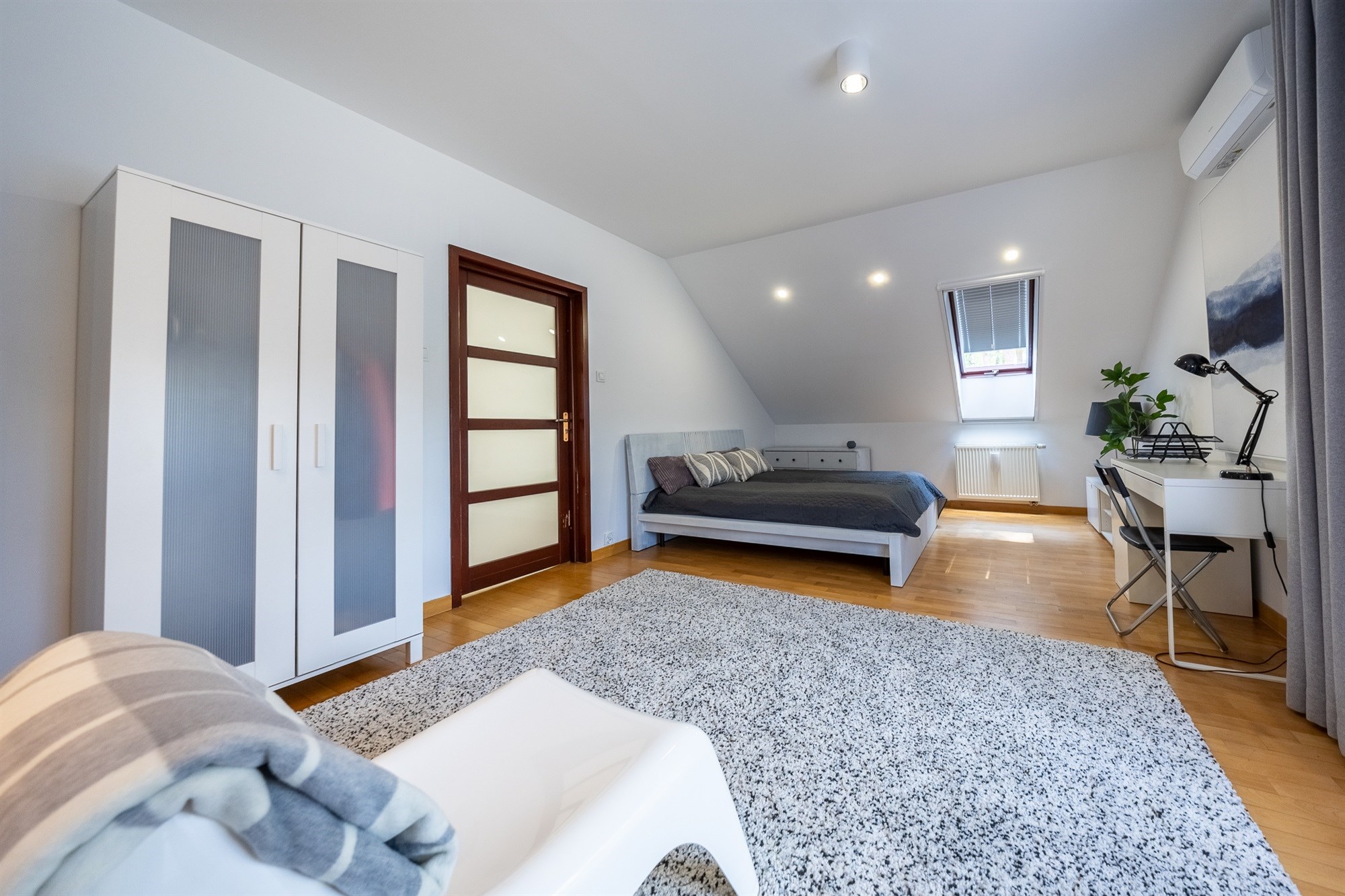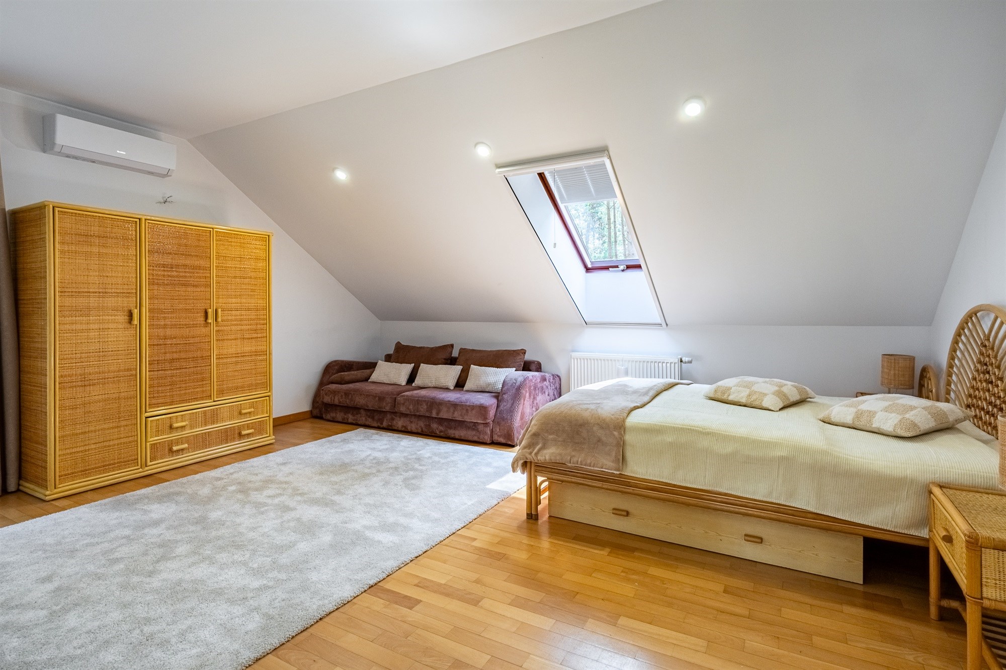 Na piętrze znajdują się dwie przestronne sypialnie, każda z własną garderobą i prywatną łazienką – idealne rozwiązanie dla dzieci, gości lub jako pokoje gościnne. Dodatkowy komfort zapewnia klimatyzacja, moskitiery w oknach oraz rolety typu plisy w oknach dachowych.