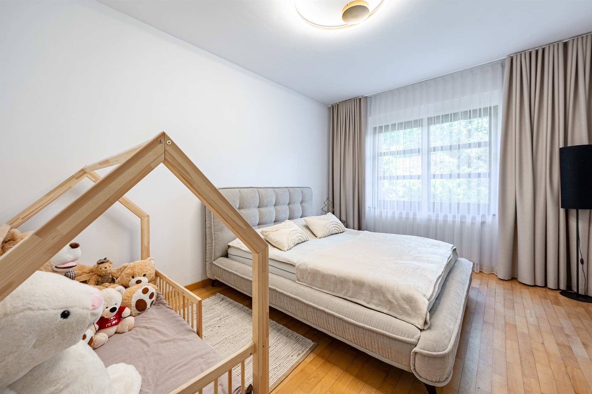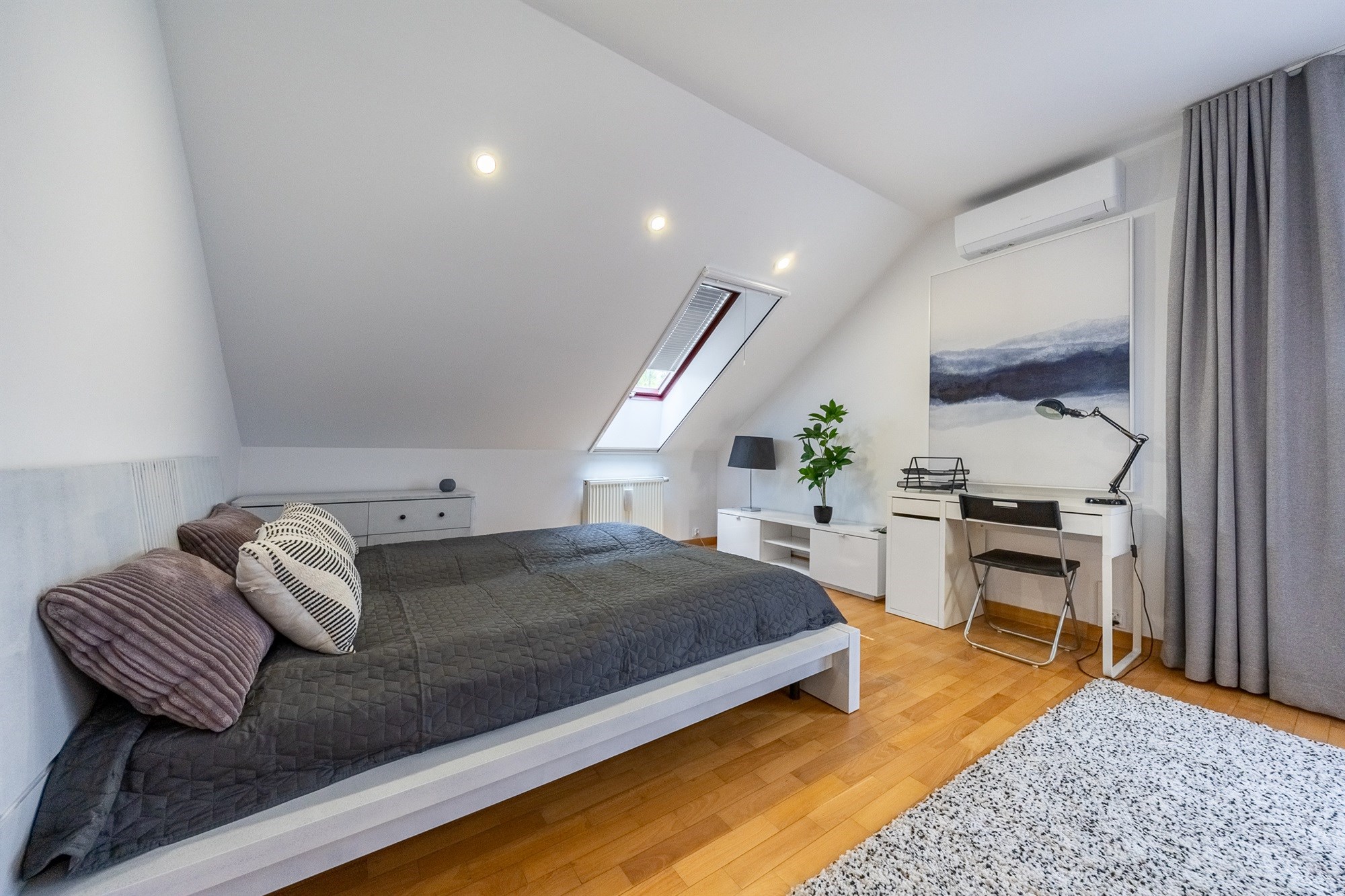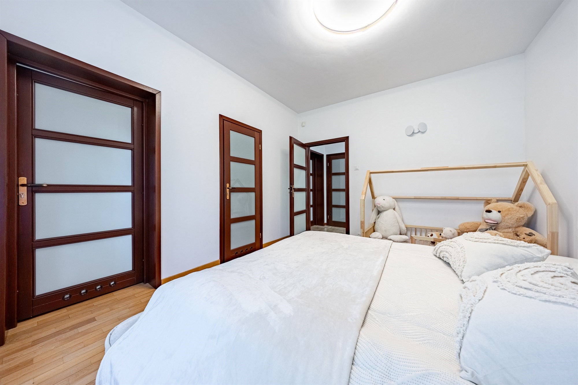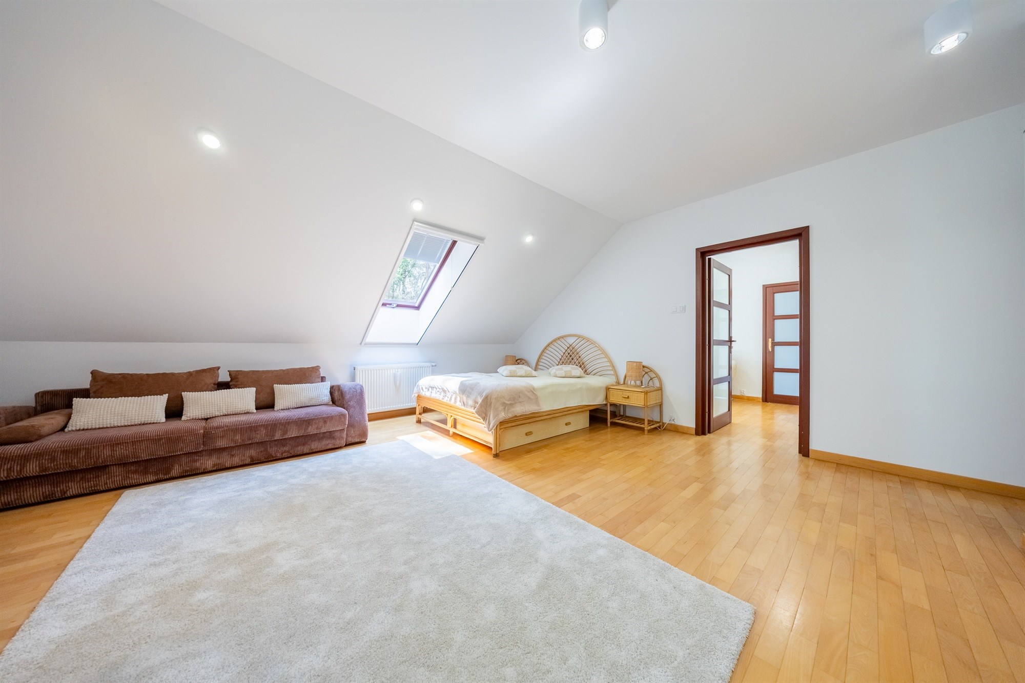 Na piętrze znajdują się dwie przestronne sypialnie, każda z własną garderobą i prywatną łazienką – idealne rozwiązanie dla dzieci, gości lub jako pokoje gościnne. Dodatkowy komfort zapewnia klimatyzacja, moskitiery w oknach oraz rolety typu plisy w oknach dachowych.