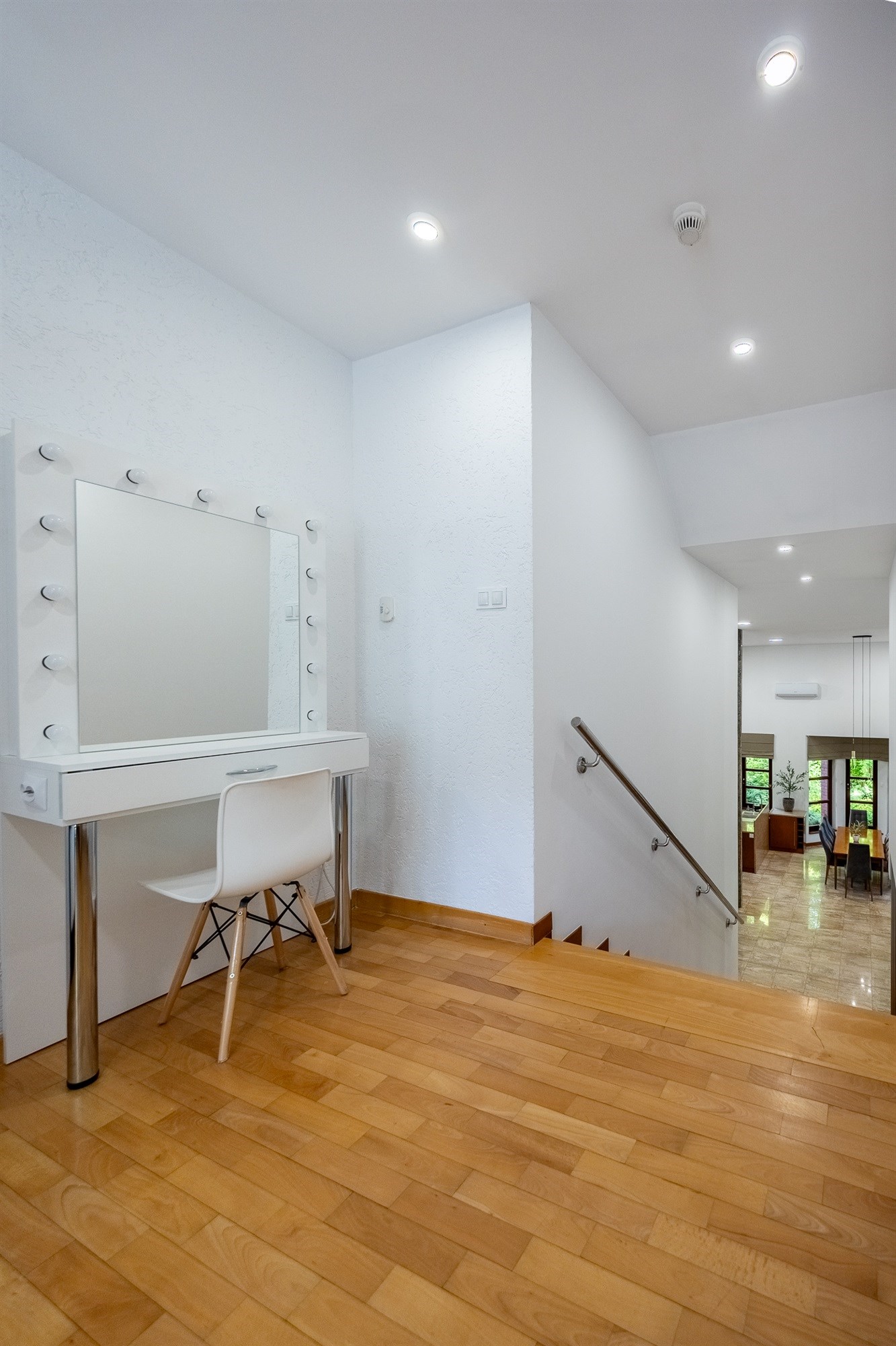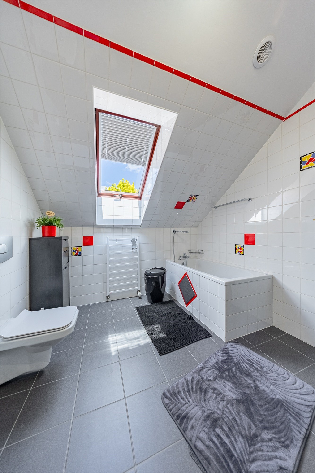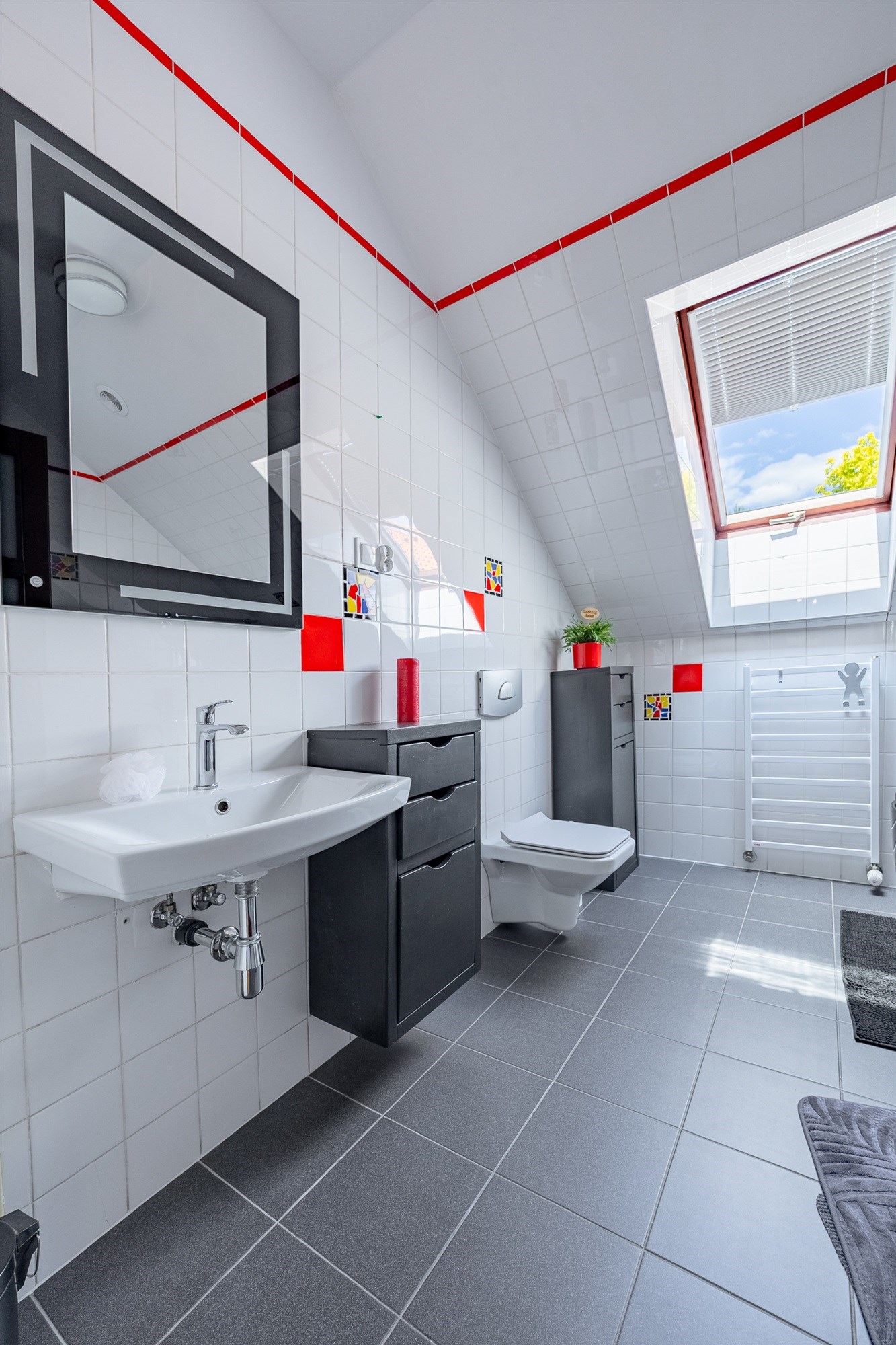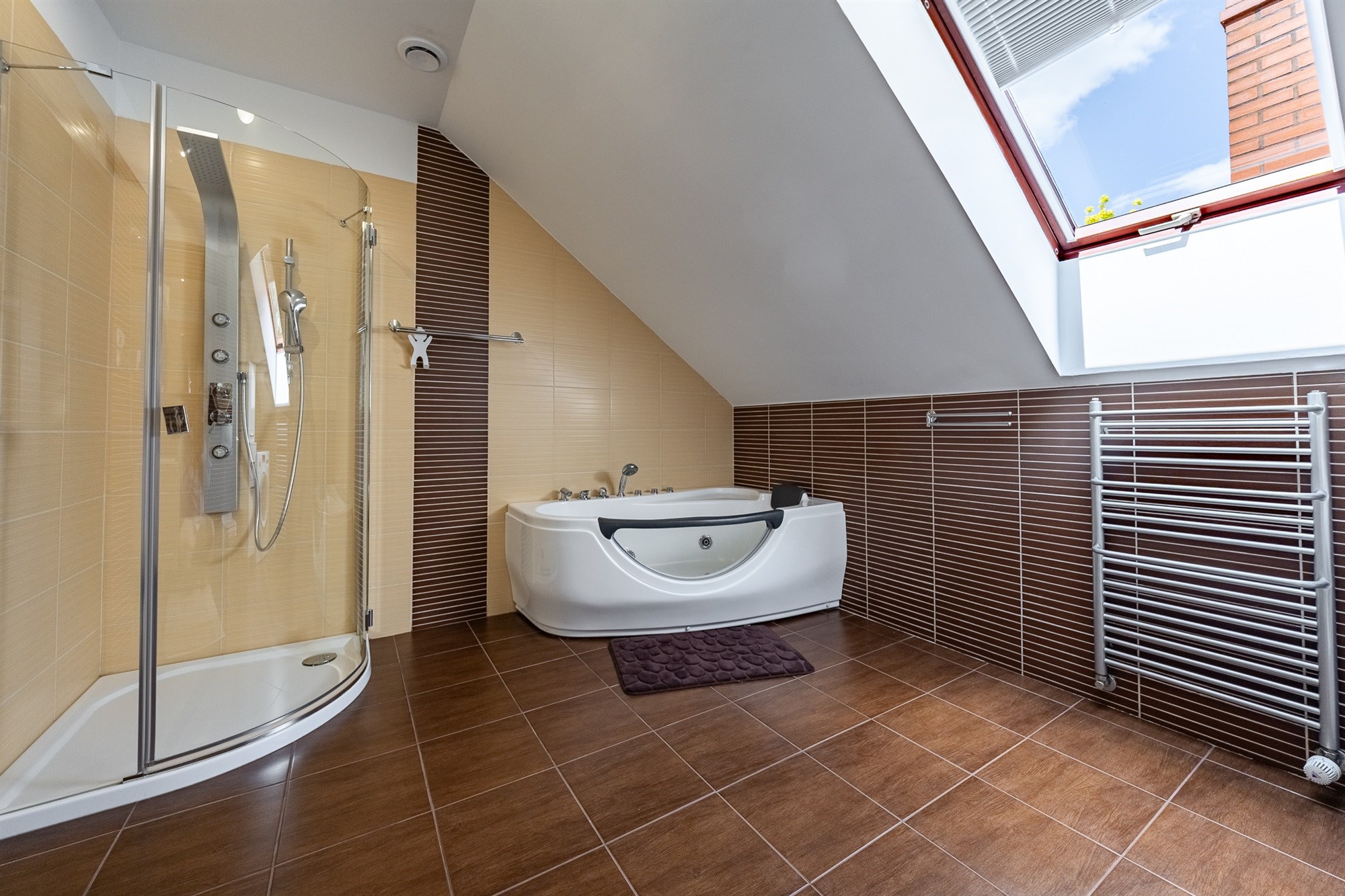 Na piętrze znajdują się dwie przestronne sypialnie, każda z własną garderobą i prywatną łazienką – idealne rozwiązanie dla dzieci, gości lub jako pokoje gościnne. Dodatkowy komfort zapewnia klimatyzacja, moskitiery w oknach oraz rolety typu plisy w oknach dachowych.