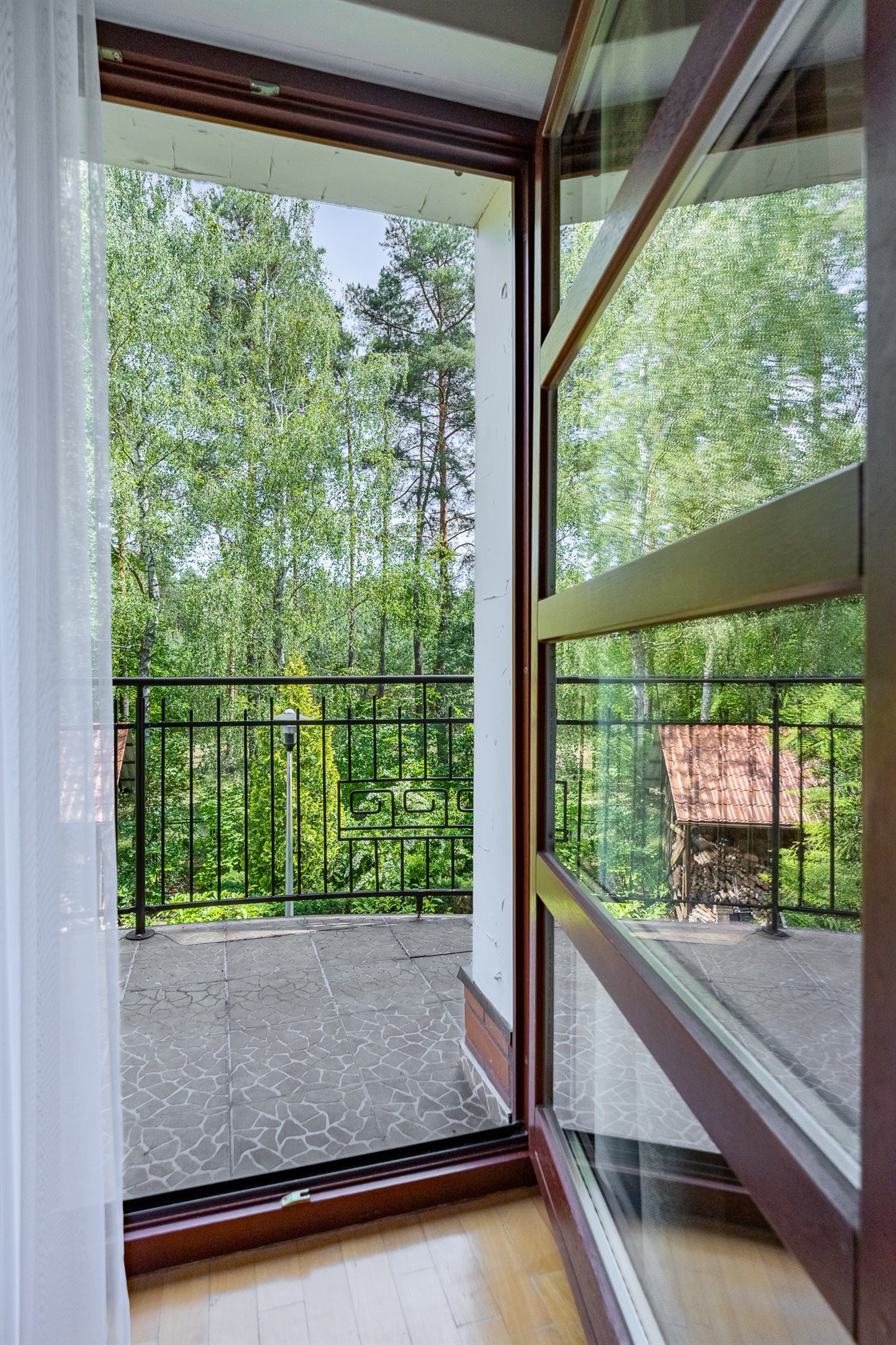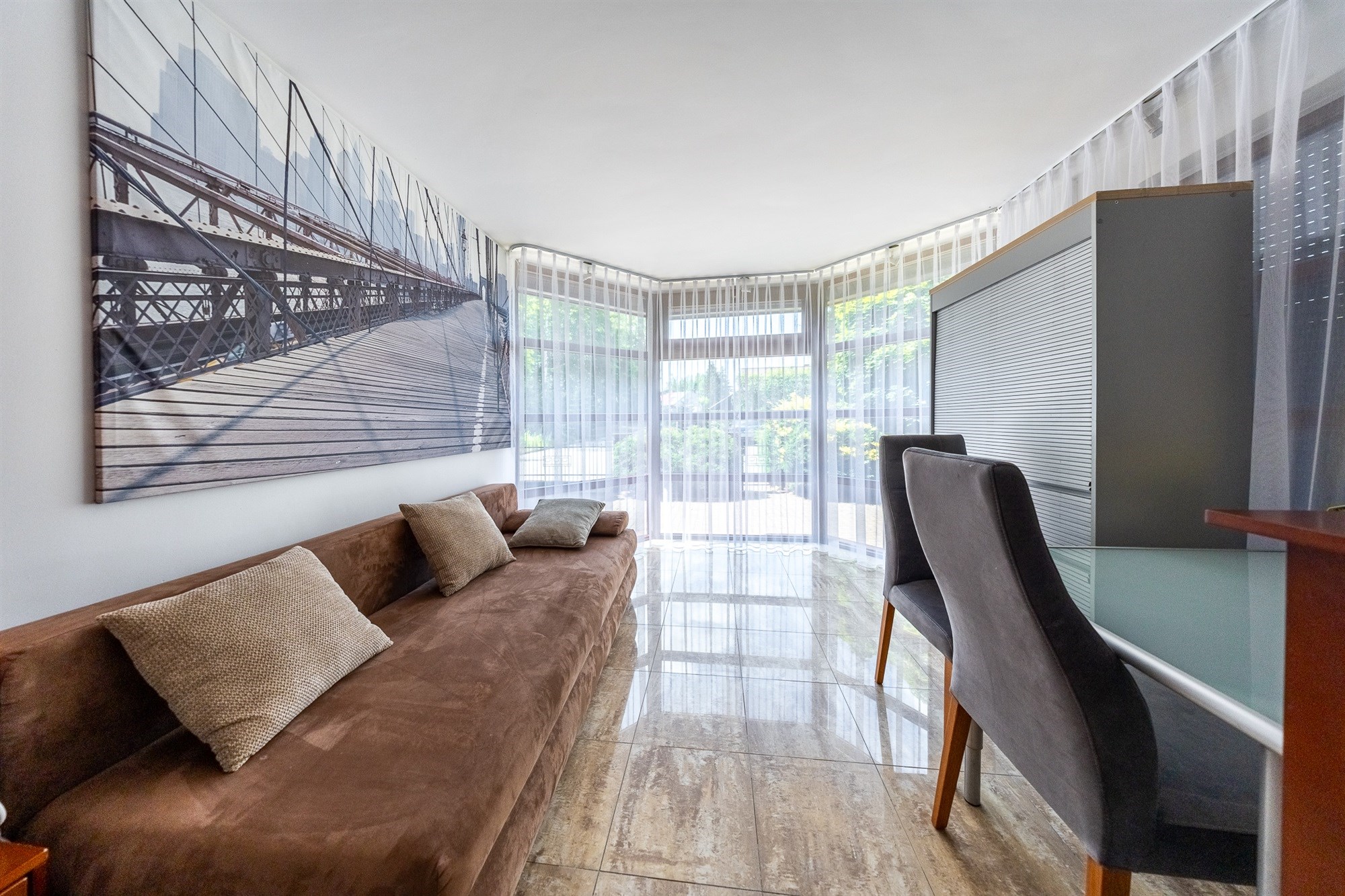 Gabinet z dużym, przeszklonym oknem – idealne miejsce do pracy zdalnej lub prywatnego biura.