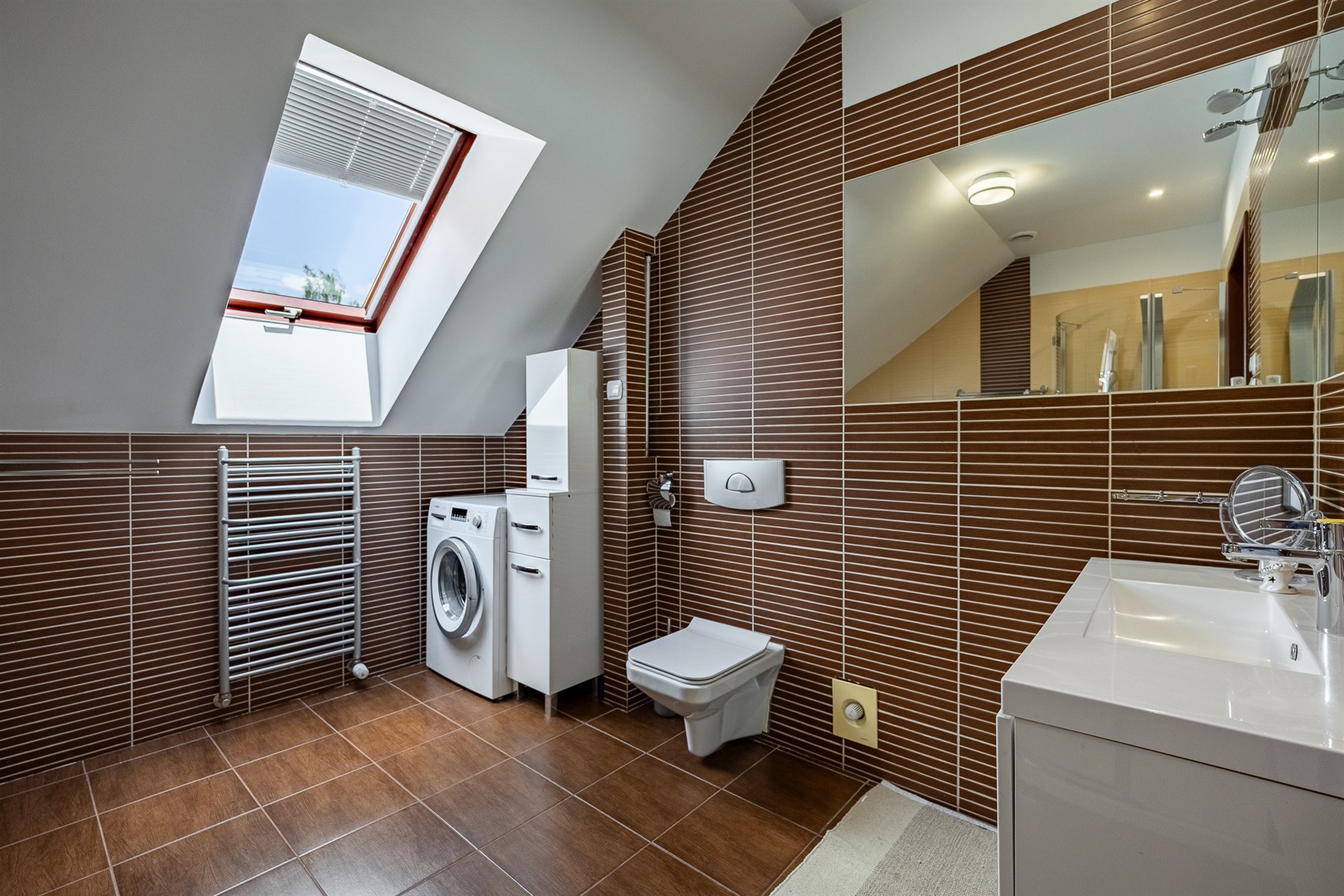 Toaleta dla gości oraz pomieszczenie techniczne z wyjściem do dwustanowiskowego garażu i letniej kuchni, z którego można wygodnie przenieść zakupy prosto do domu.