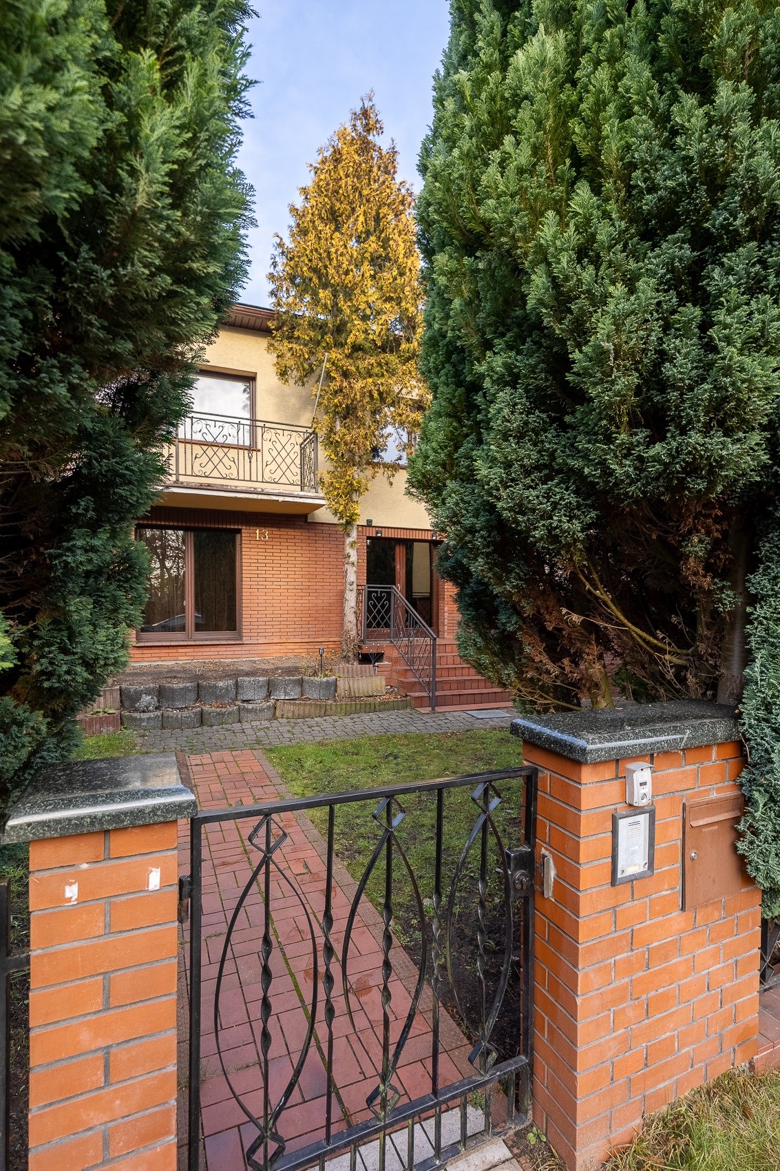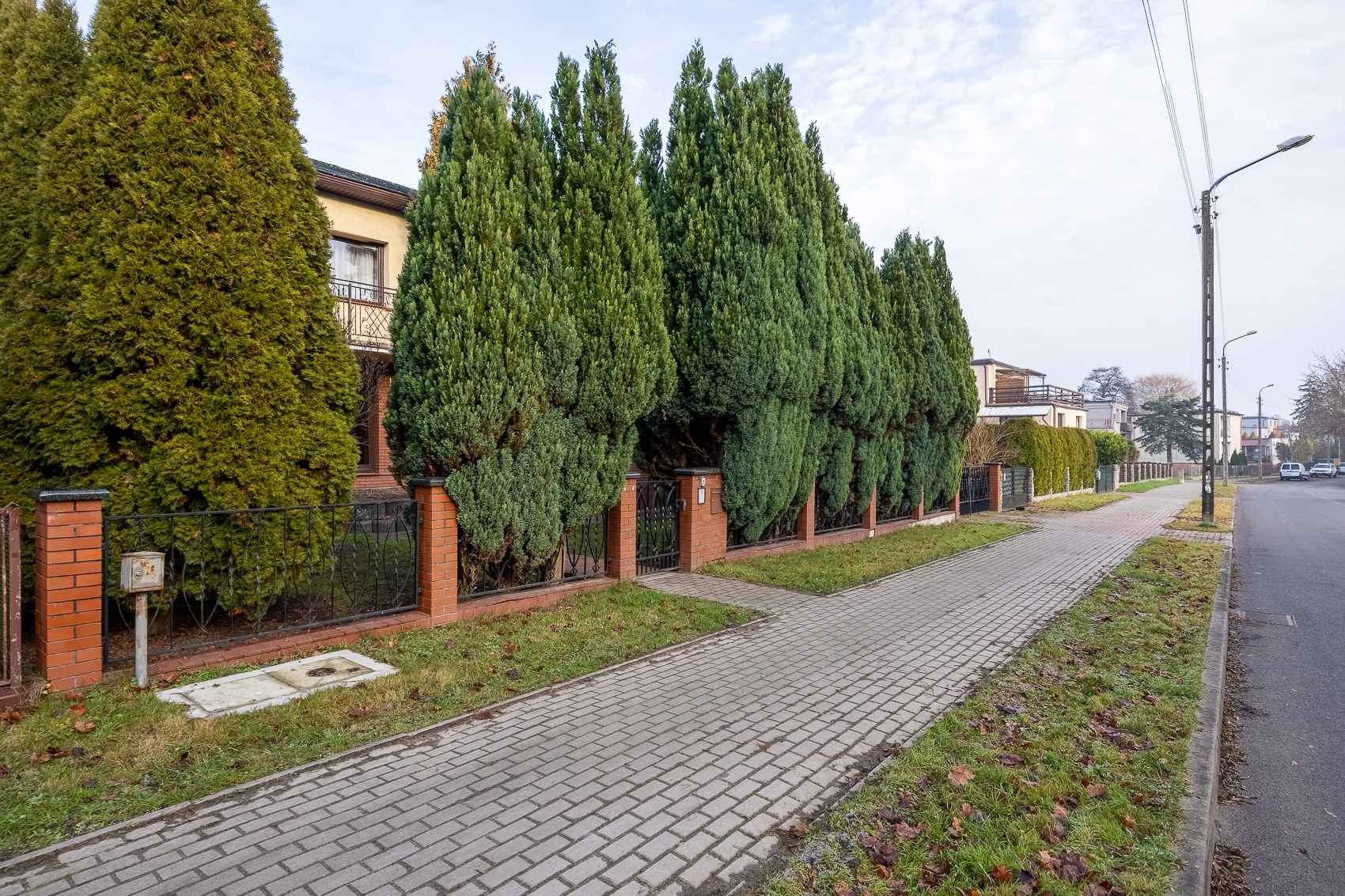 - Ogrodzenie: ozdobne kute na klinkierowej podmurówce, wzdłuż działki tuje