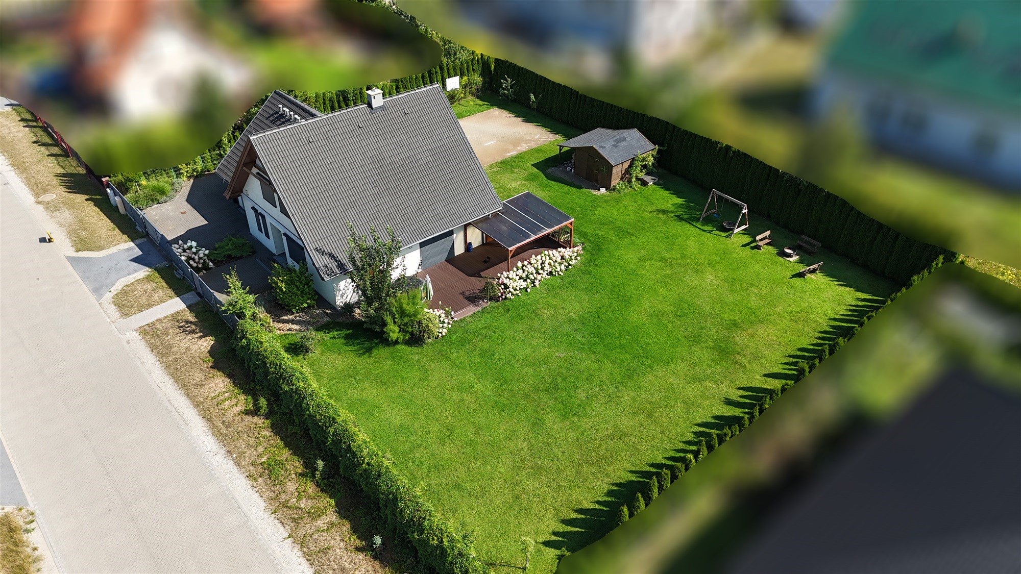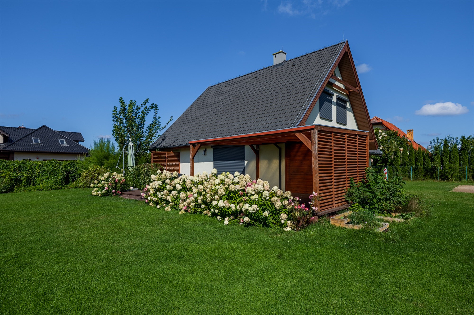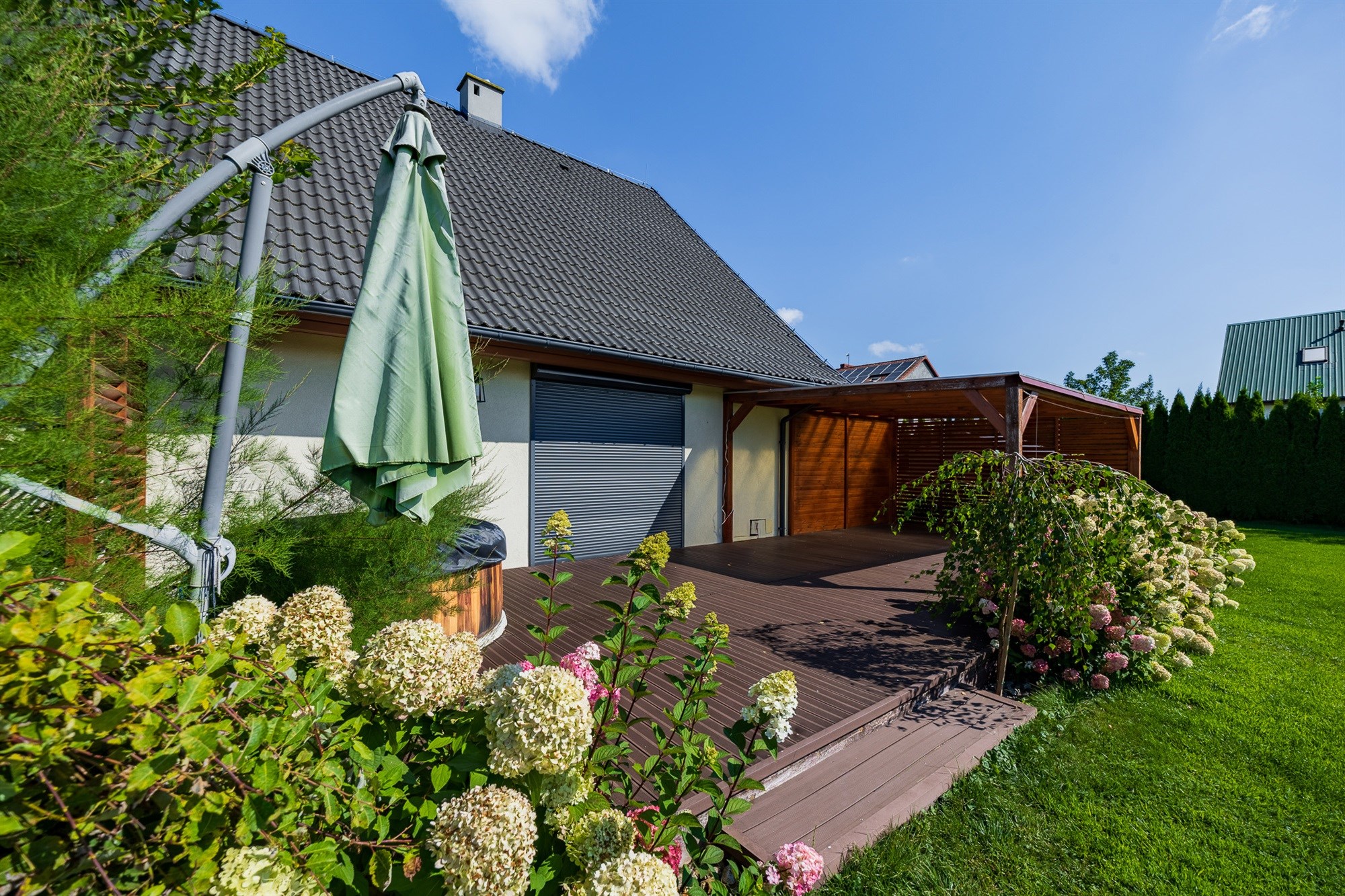 - całkowicie zagospodarowana działka 1327 m² z zadbanym ogrodem i dużym tarasem otoczonym kwiatami i krzewami,