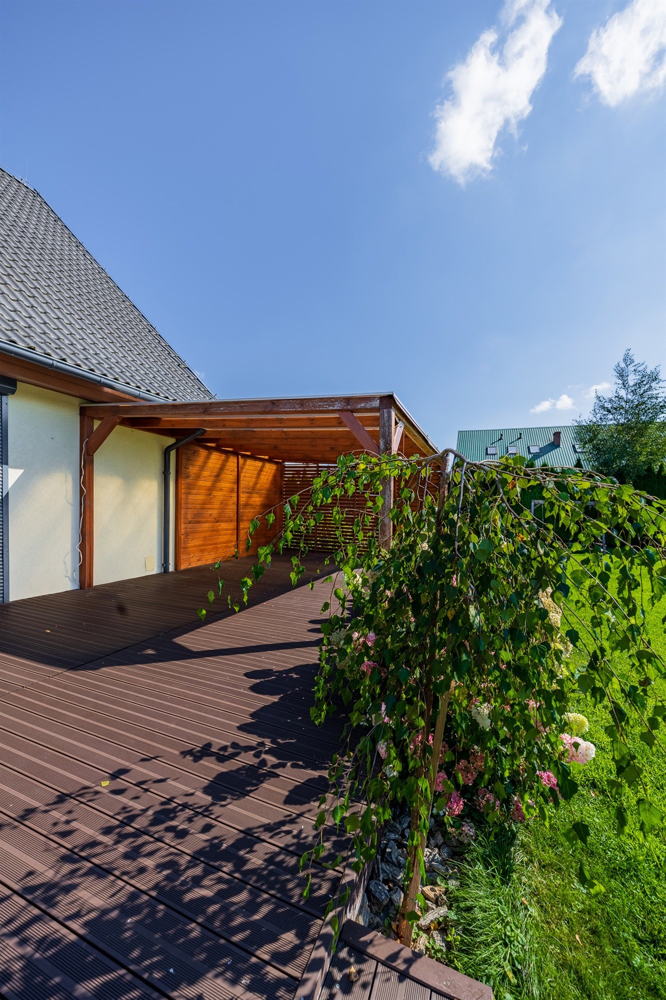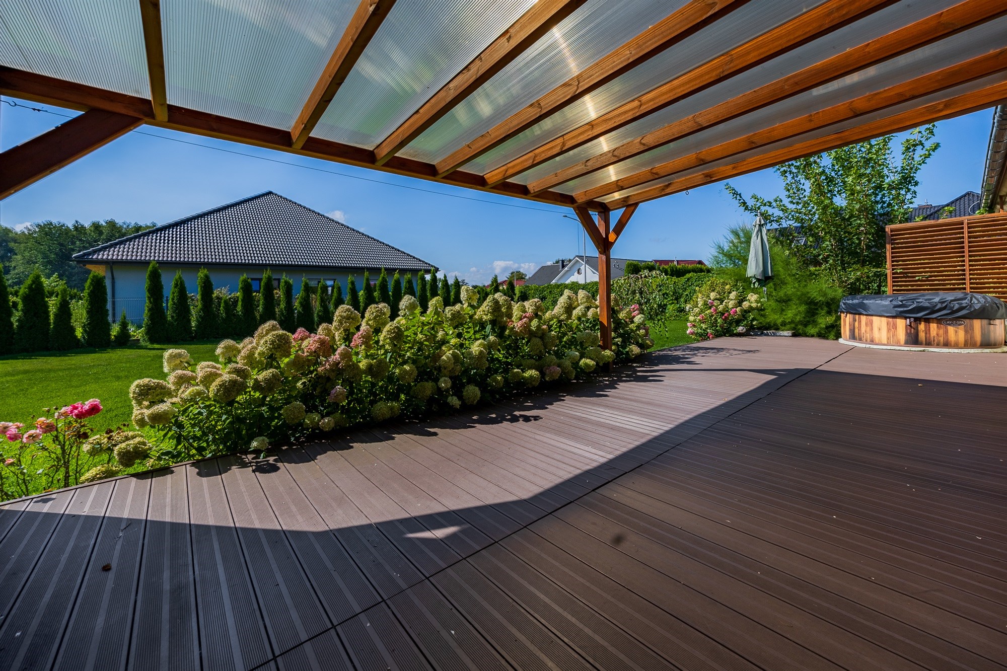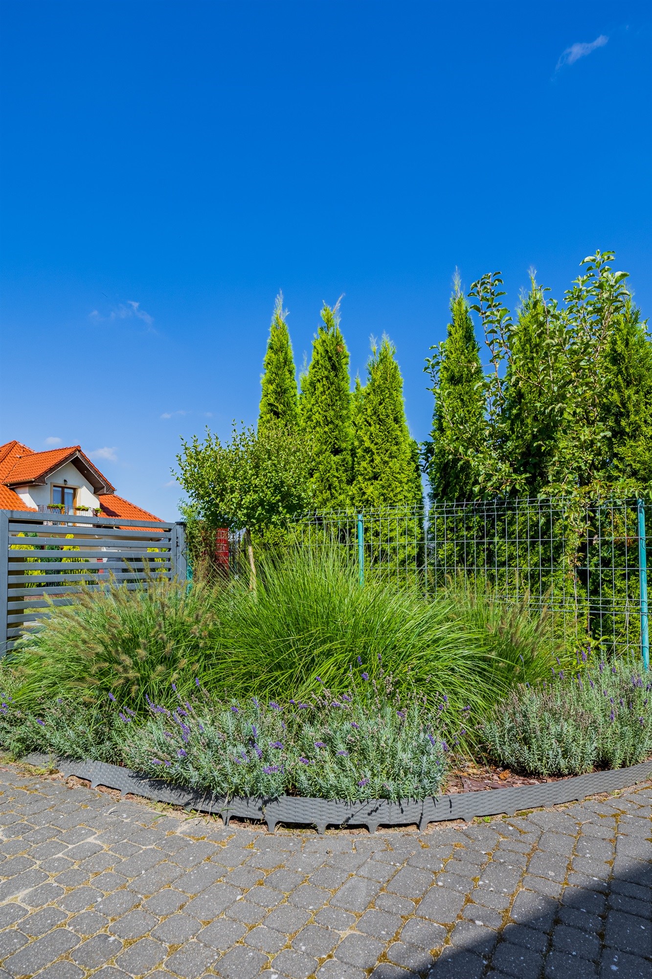 - całkowicie zagospodarowana działka 1327 m² z zadbanym ogrodem i dużym tarasem otoczonym kwiatami i krzewami,