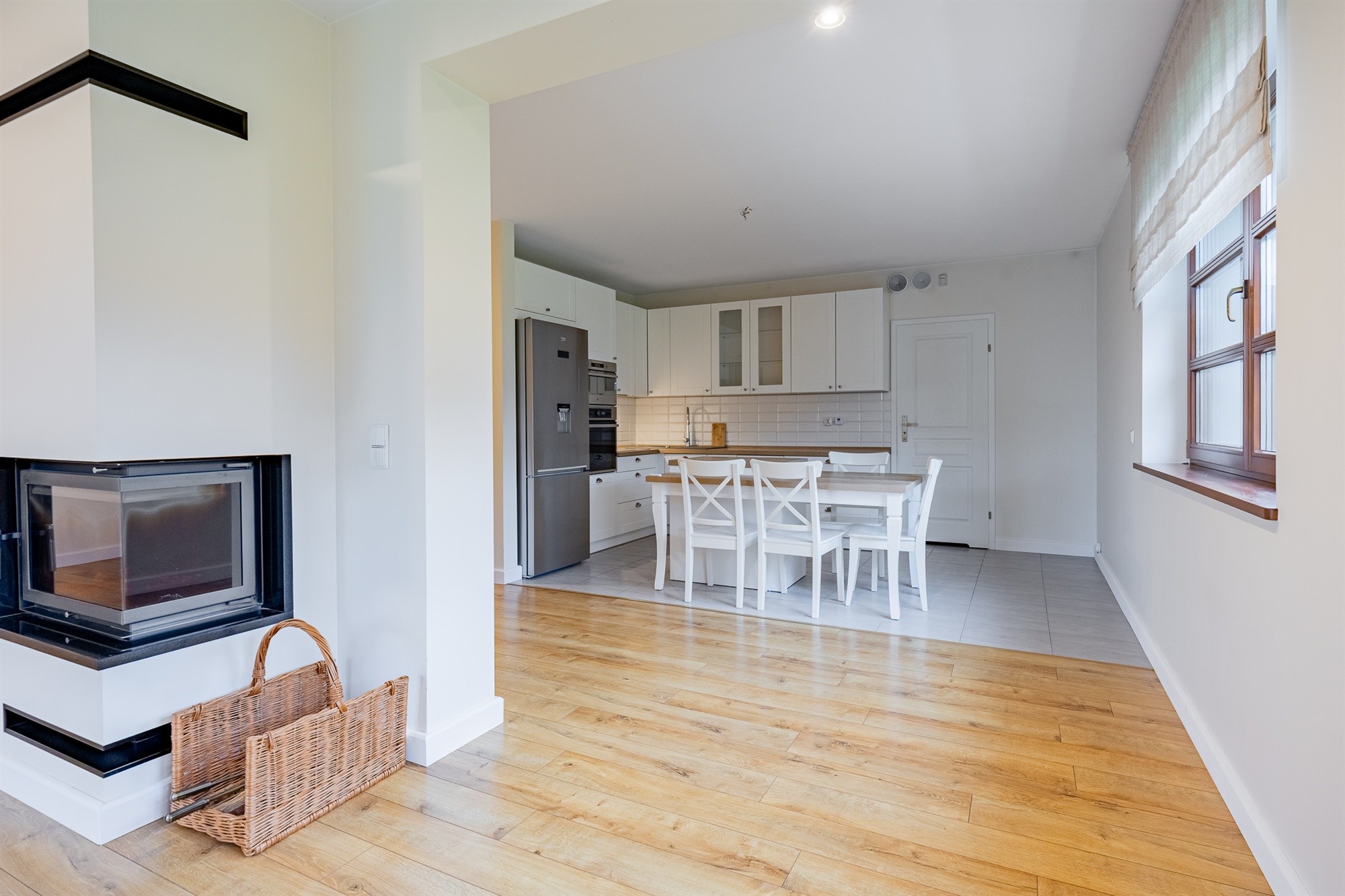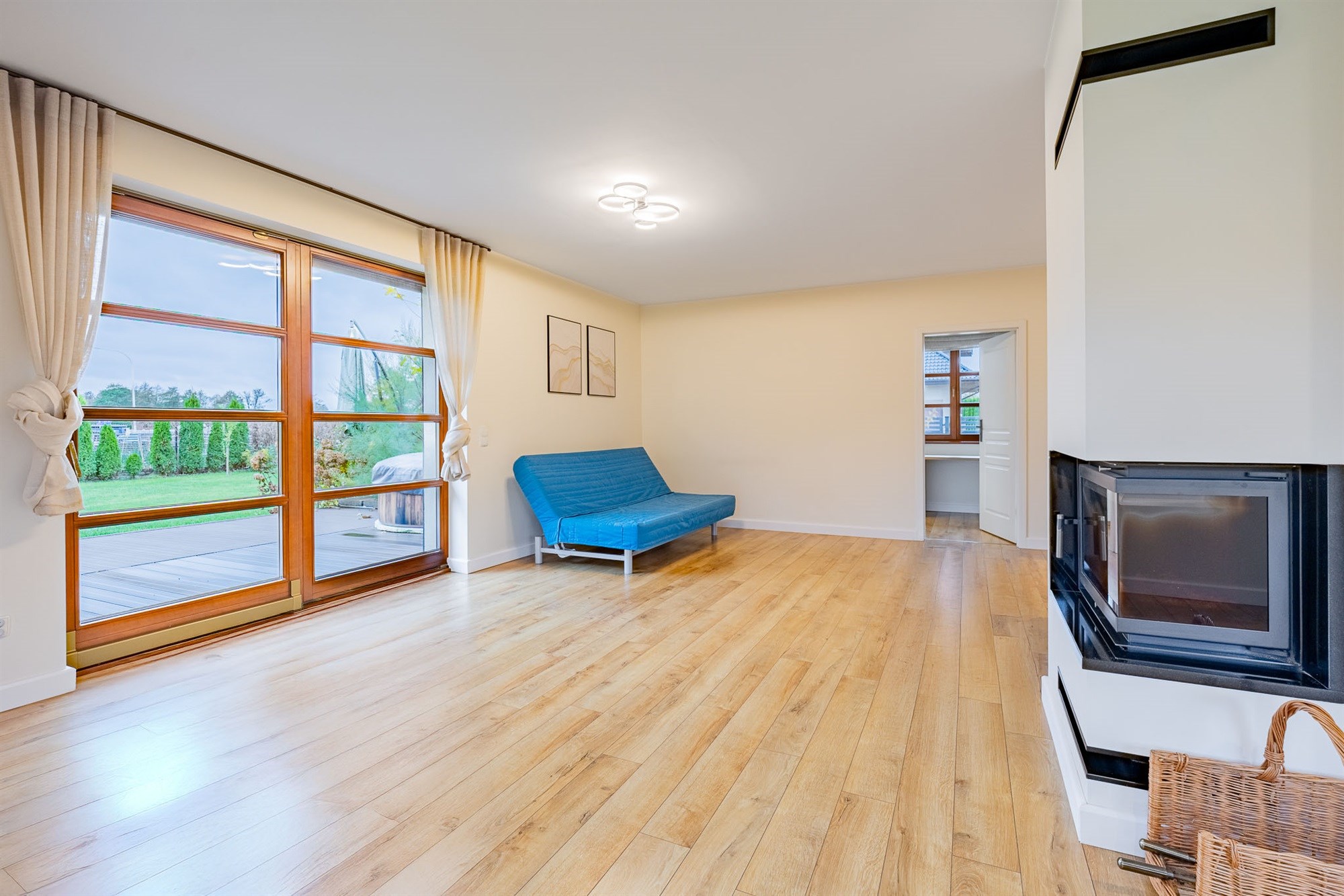 - Pokój dzienny (30,11 m²) – serce domu z kominkiem, miejscem na duży stół i część wypoczynkową; z wyjściem na taras.