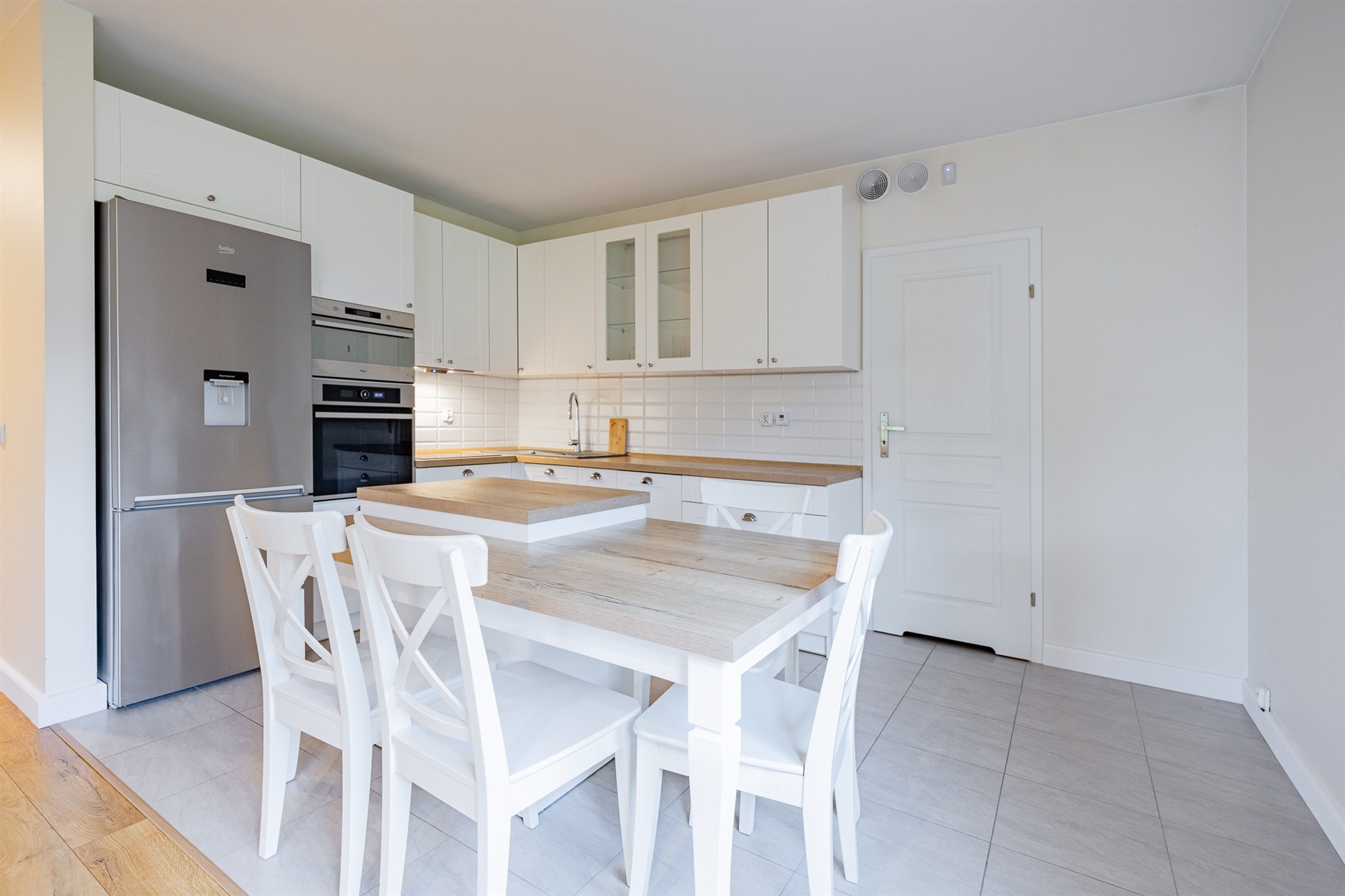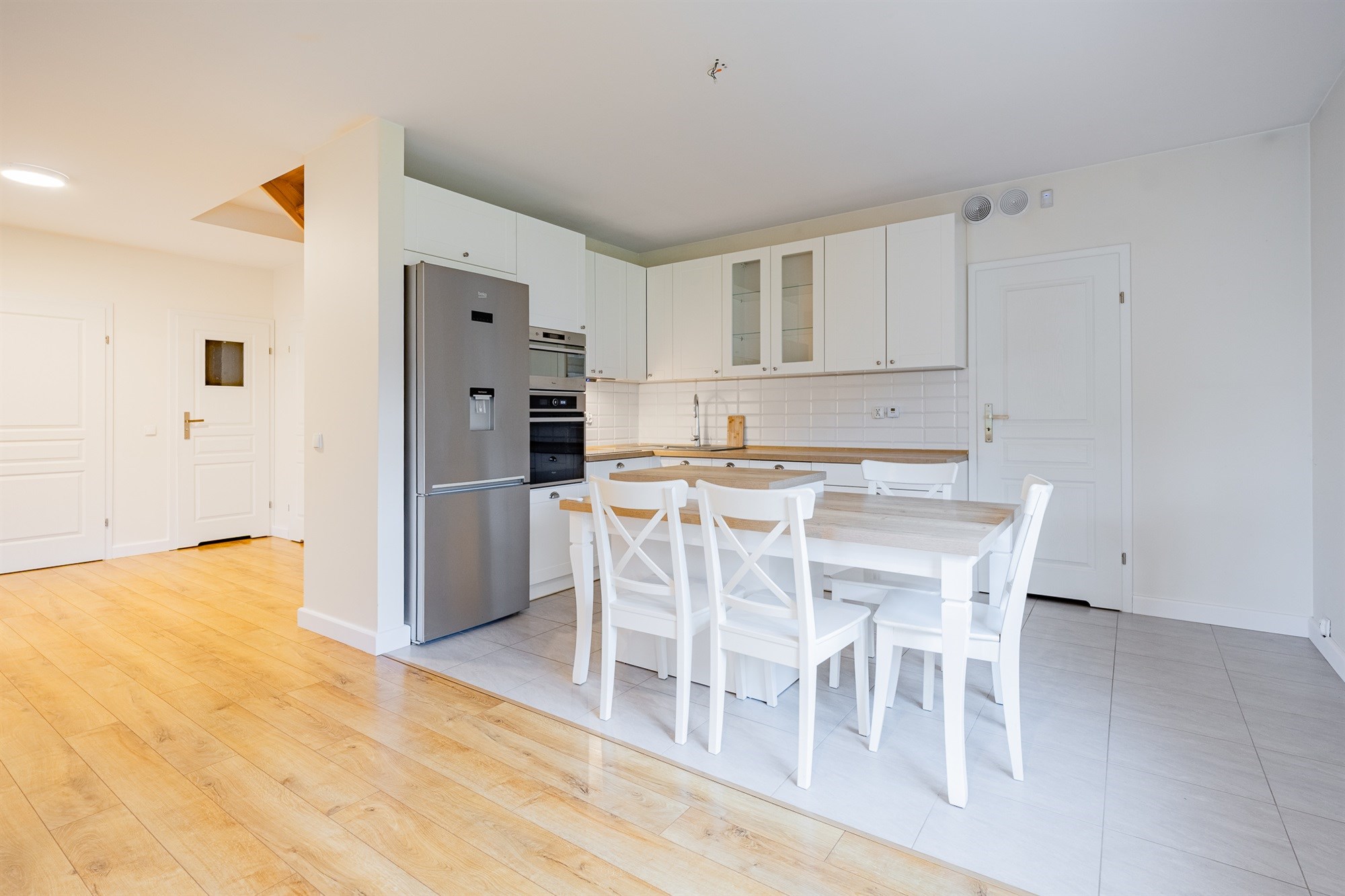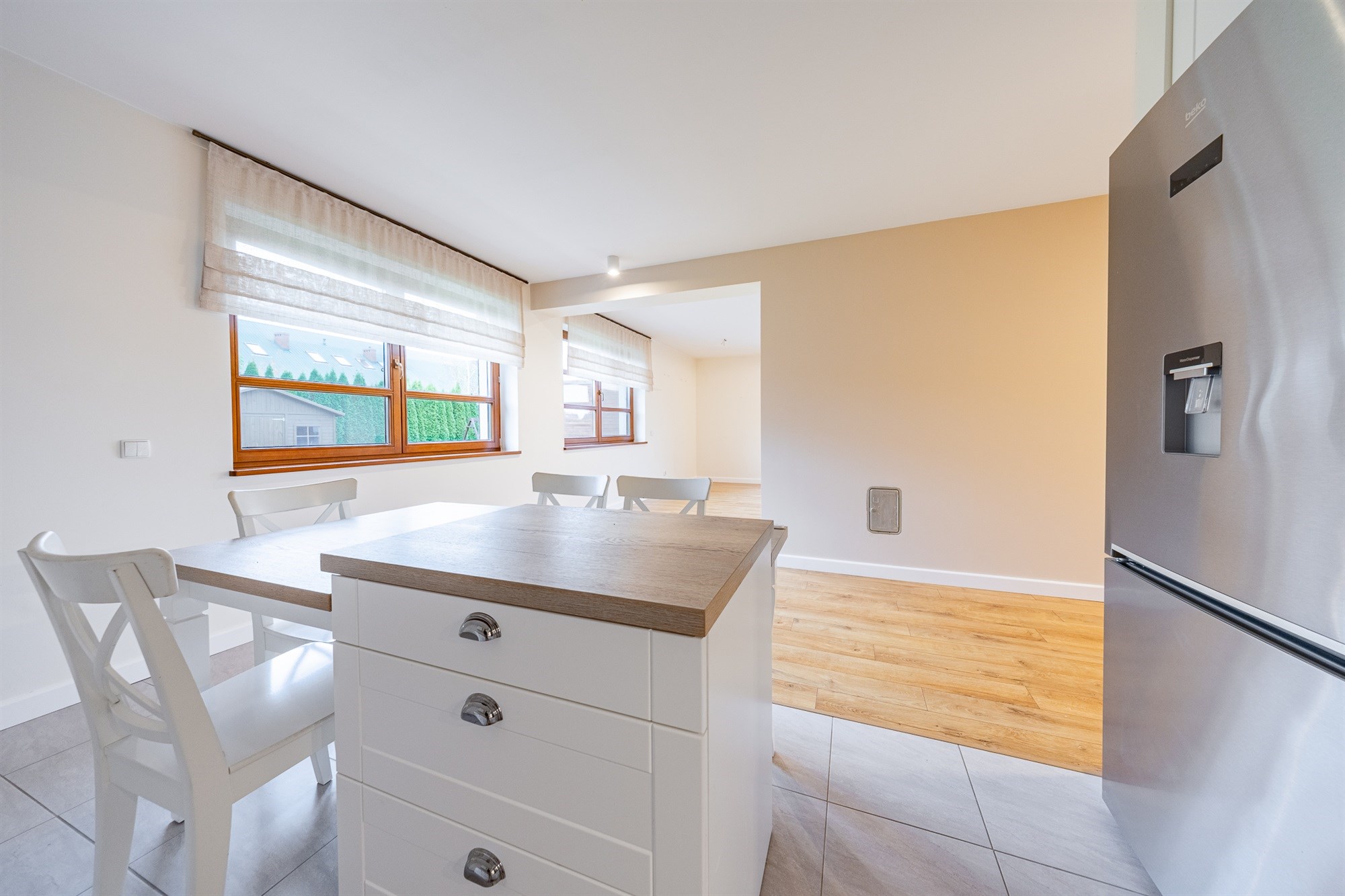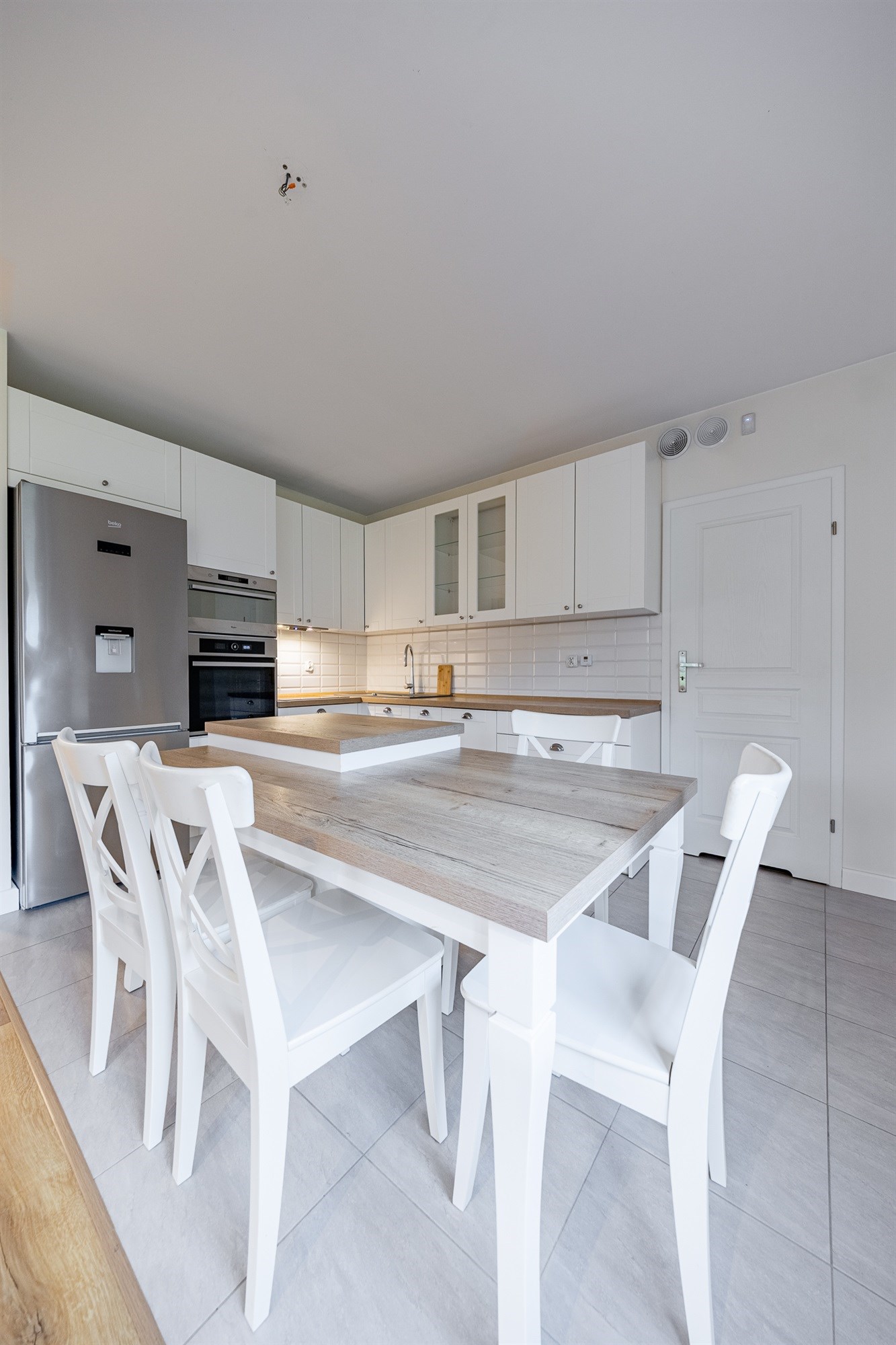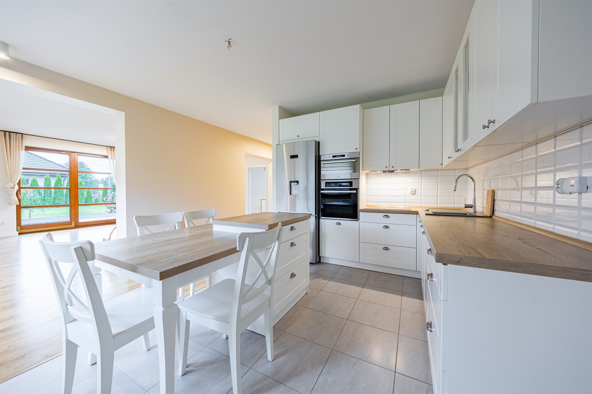 - Kuchnia (18,77 m²) – w pełni wyposażona, z nowoczesną zabudową i sprzętami AGD; na środku wyspa z miejscem na rodzinne posiłki.