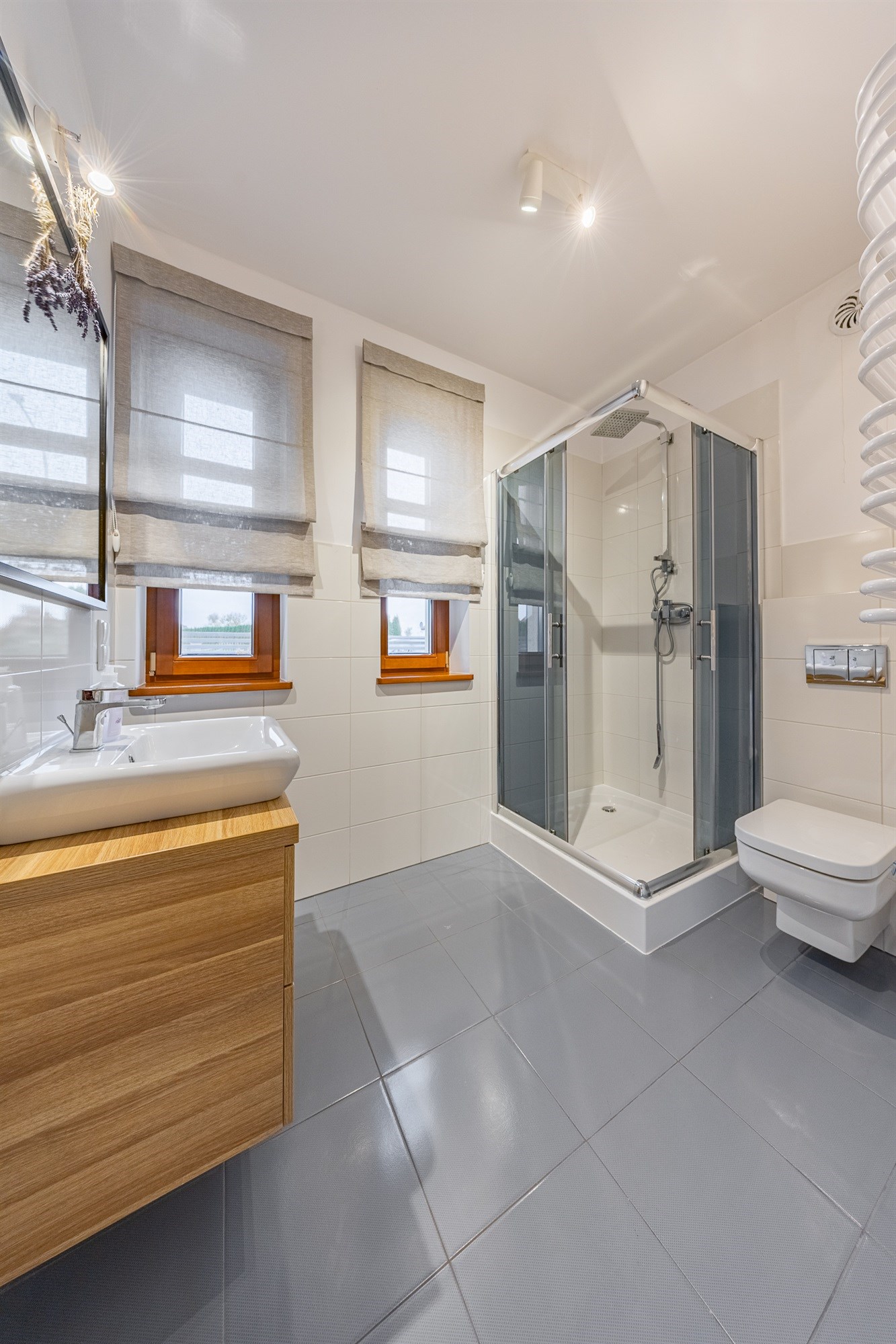 - Podłogi: panele w pokojach, terakota w kuchni, łazienkach i holach.