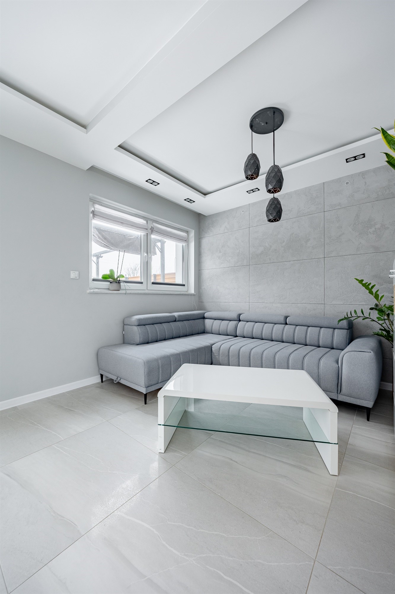 - Otwarta strefa dzienna (46,29 m²): Salon połączony z aneksem kuchennym to imponująca przestrzeń rodzinna. Podłogi wyłożone jasnymi płytkami wielkoformatowymi są nie tylko efektowne, ale i niezwykle praktyczne. Sufit podwieszany obwodowy z nastrojowym podświetleniem oraz ściana z betonu architektonicznego w strefie wypoczynku nadają wnętrzu charakteru.