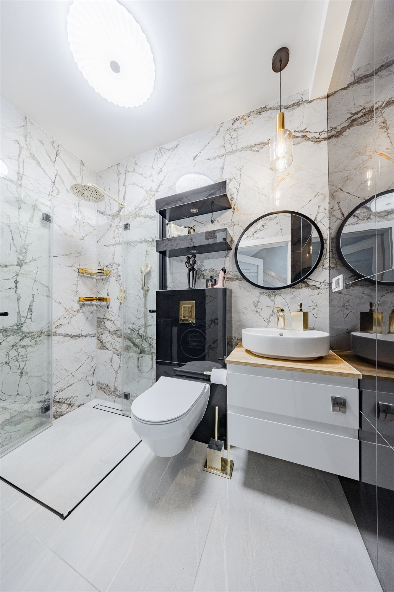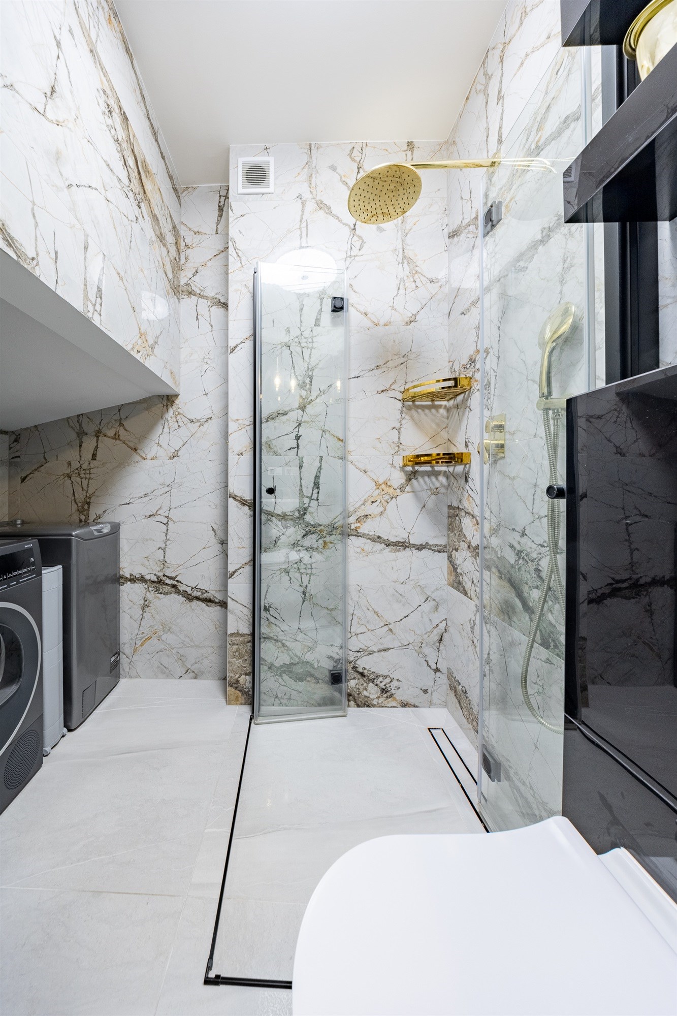 - Łazienka dolna: Nowoczesna, z prysznicem (składana kabina, odpływ liniowy), płytkami z efektem marmuru oraz wydzielonym miejscem na pralkę i suszarkę.