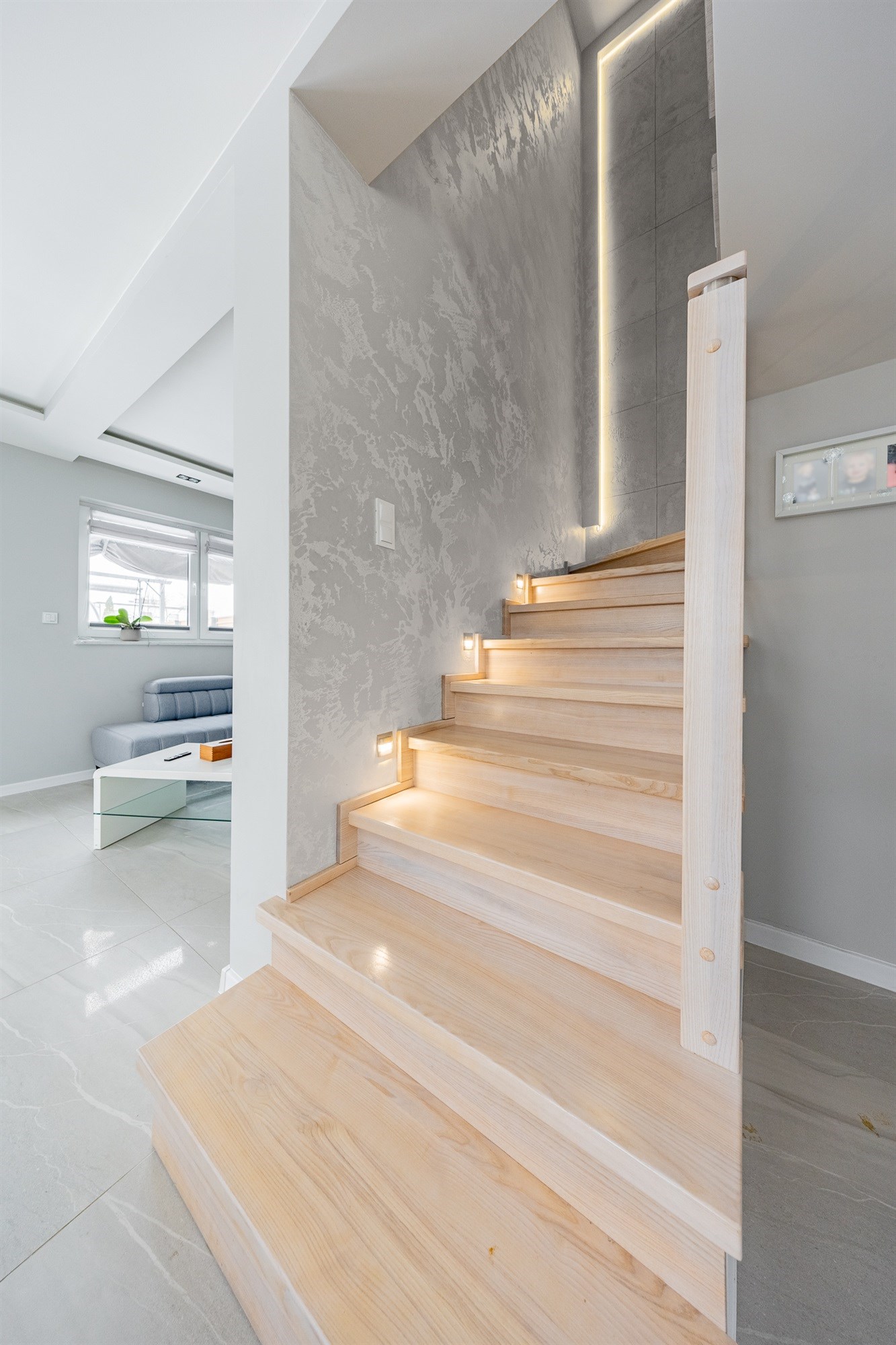 - Na górę prowadzą schody jesionowe z podświetlanymi stopniami oraz efektownym podświetleniem LED ściany z betonem architektonicznym.
