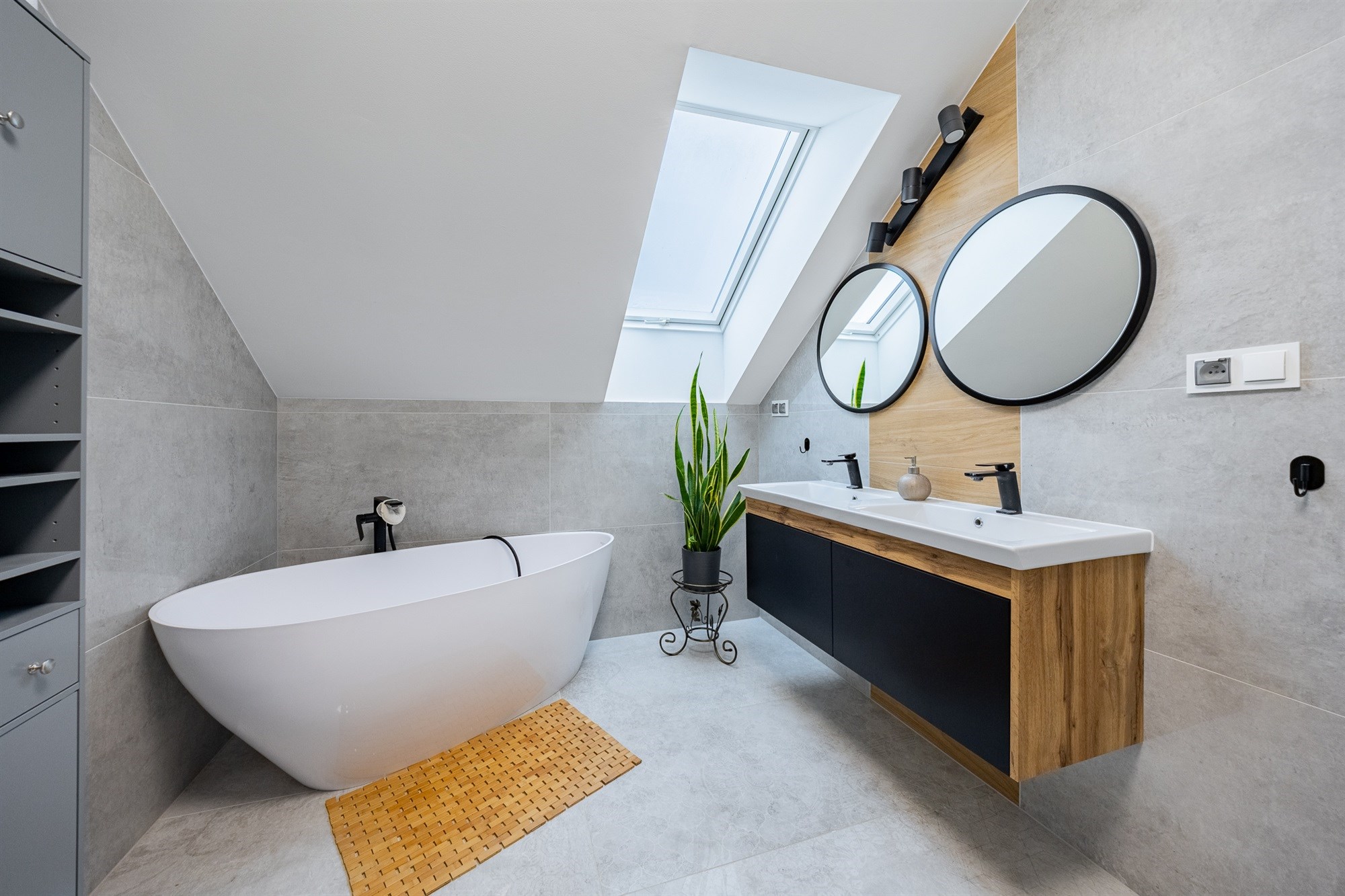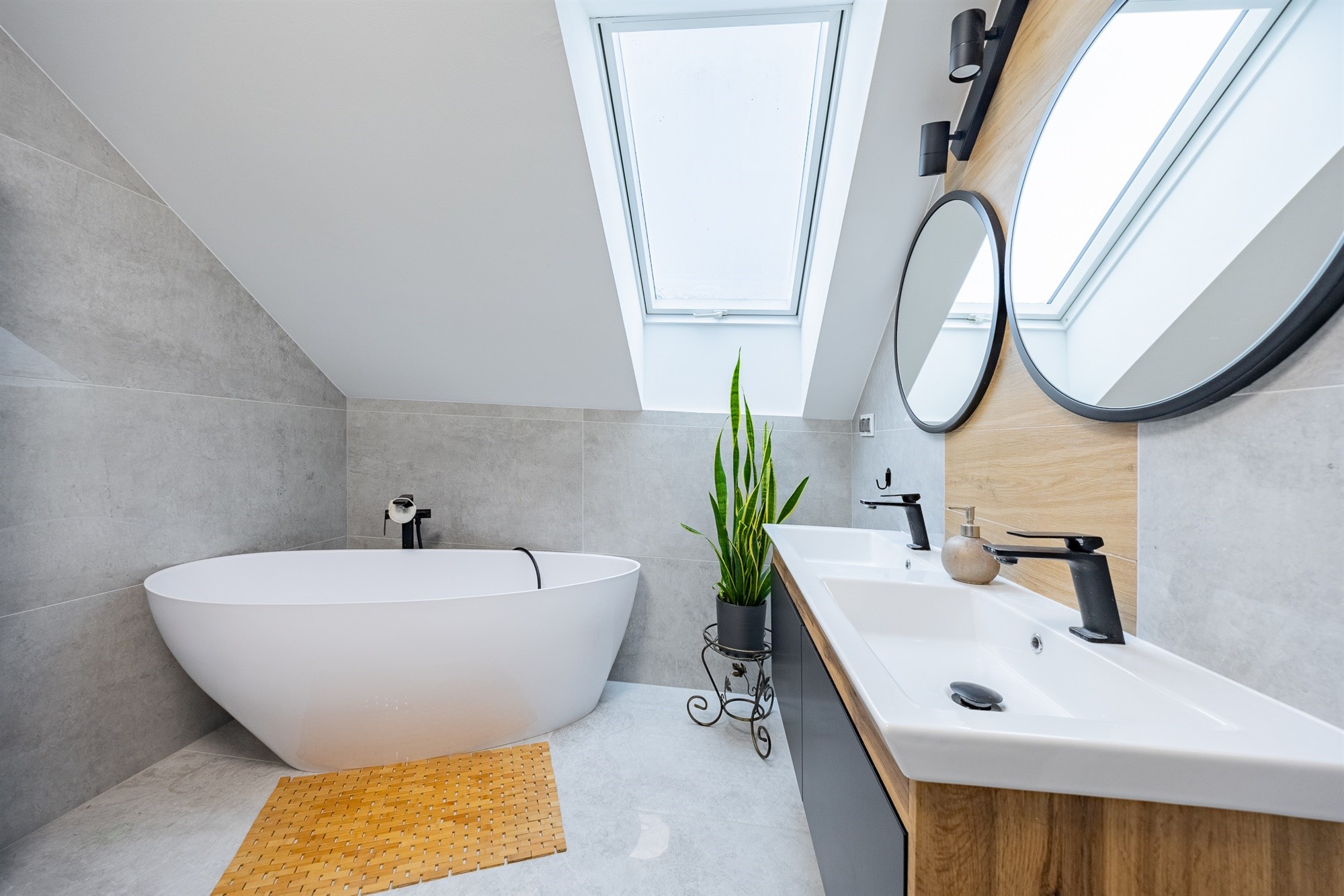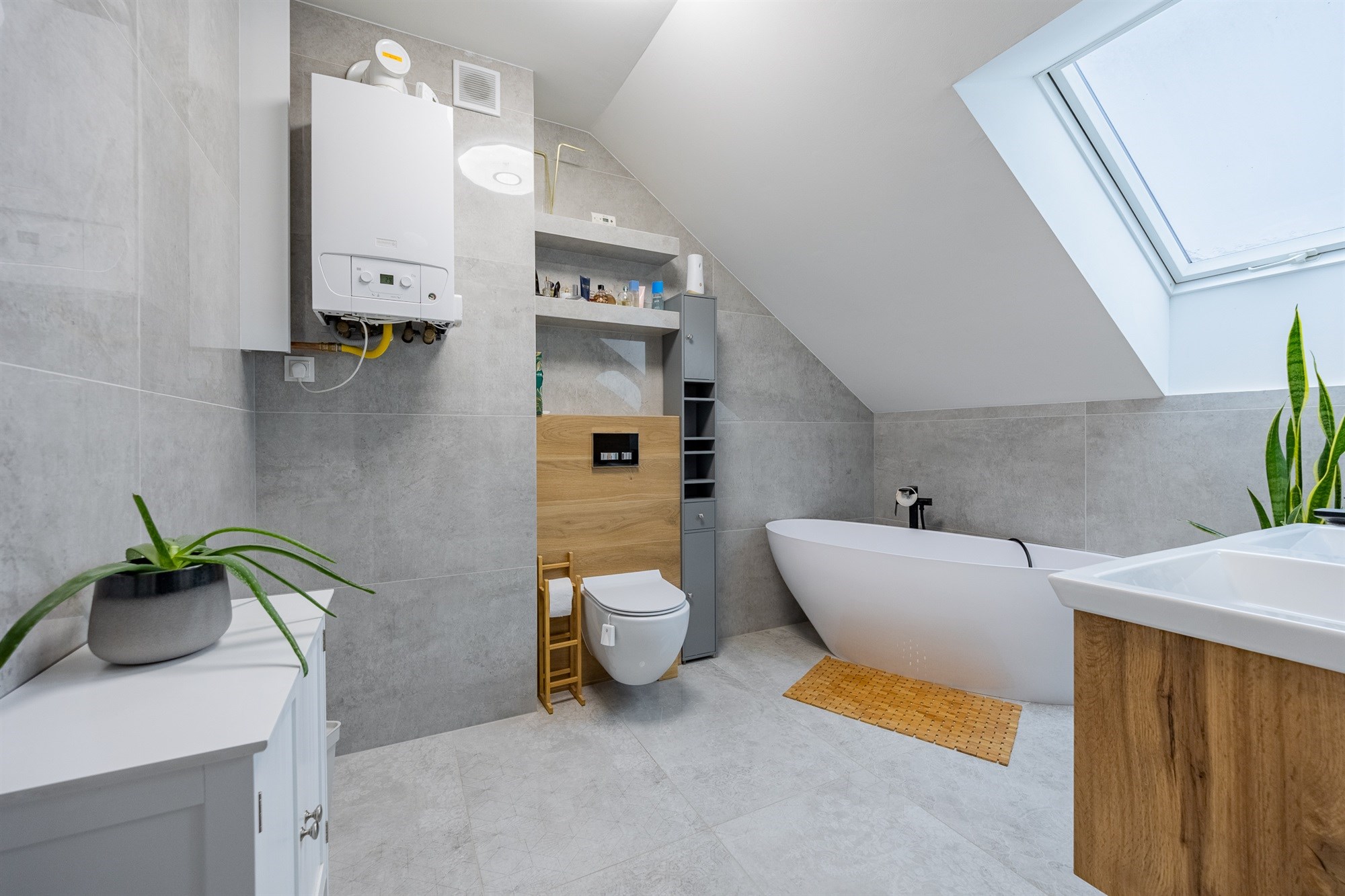 - Łazienka górna: duża z oknem, wyposażona w wannę, podwójną umywalkę i WC.
