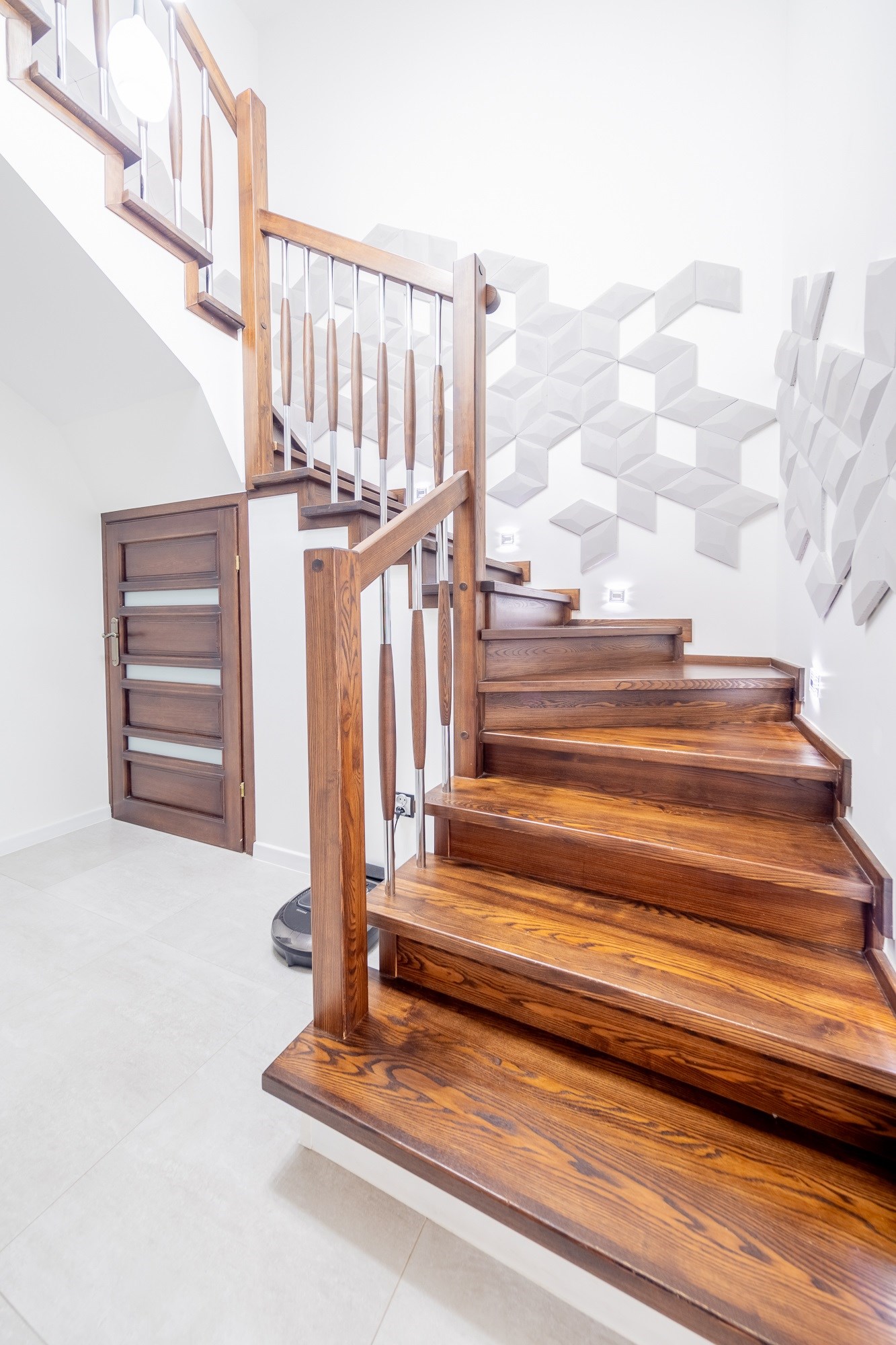 - Drewniane Detale: Piękne, jesionowe schody to przykład dbałości o detale, które nadają wnętrzom elegancji.