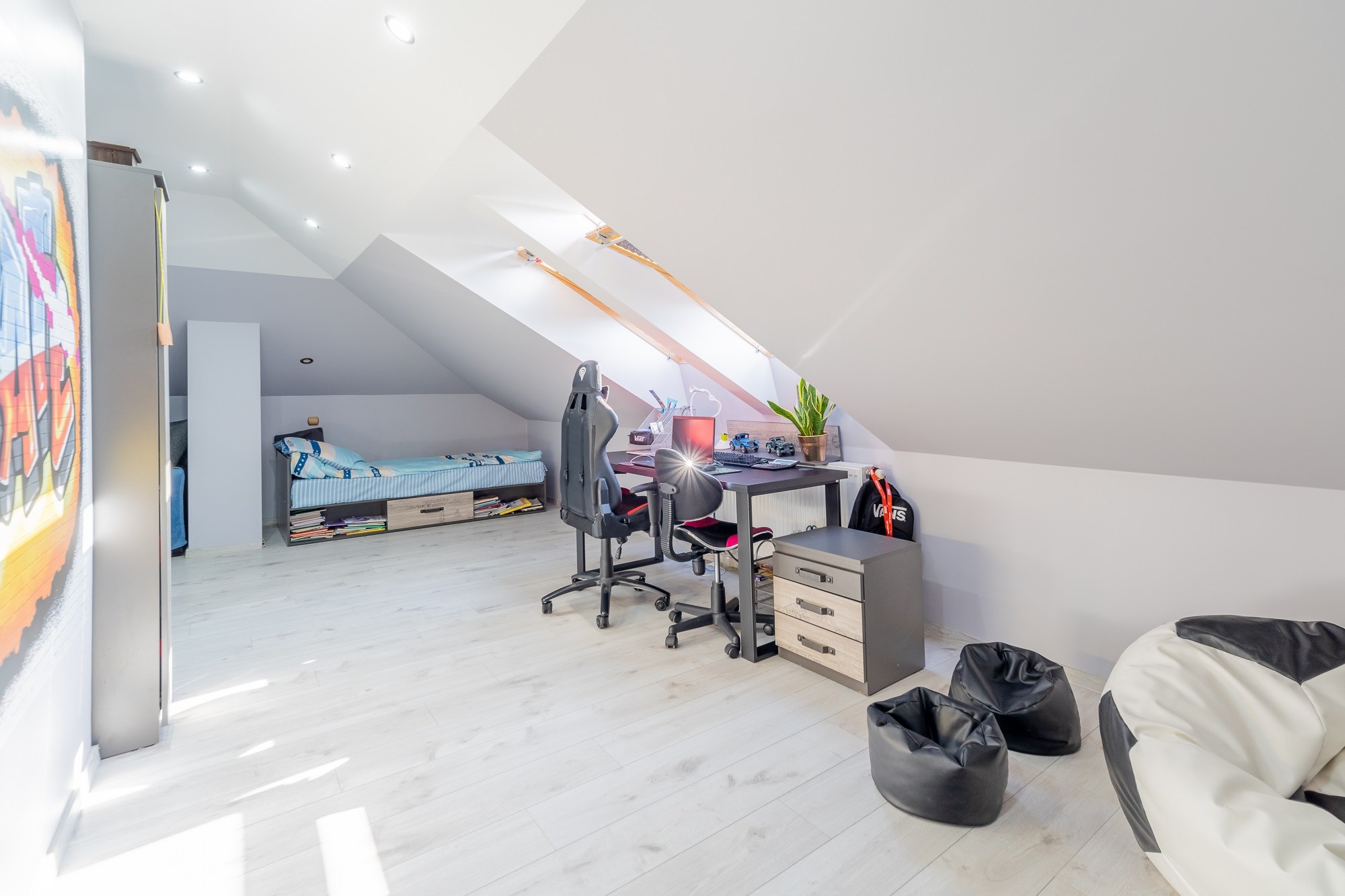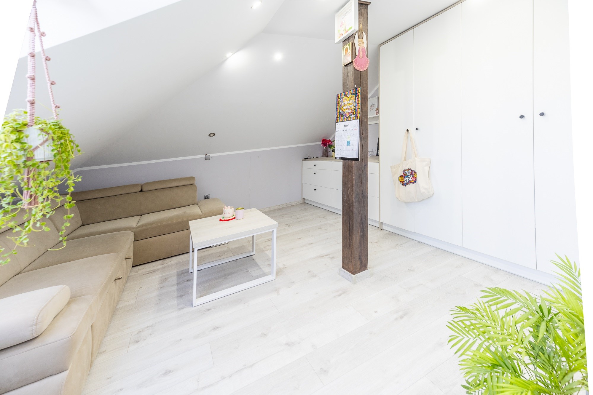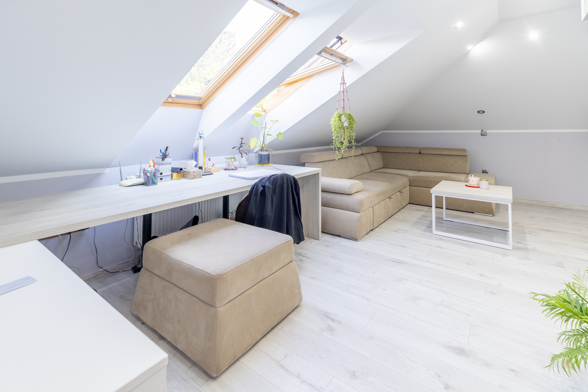 - Stylowe Okna: Połączenie okien PCV z drewnianymi oknami połaciowymi, które wpuszczają mnóstwo naturalnego światła i tworzą przytulną atmosferę.