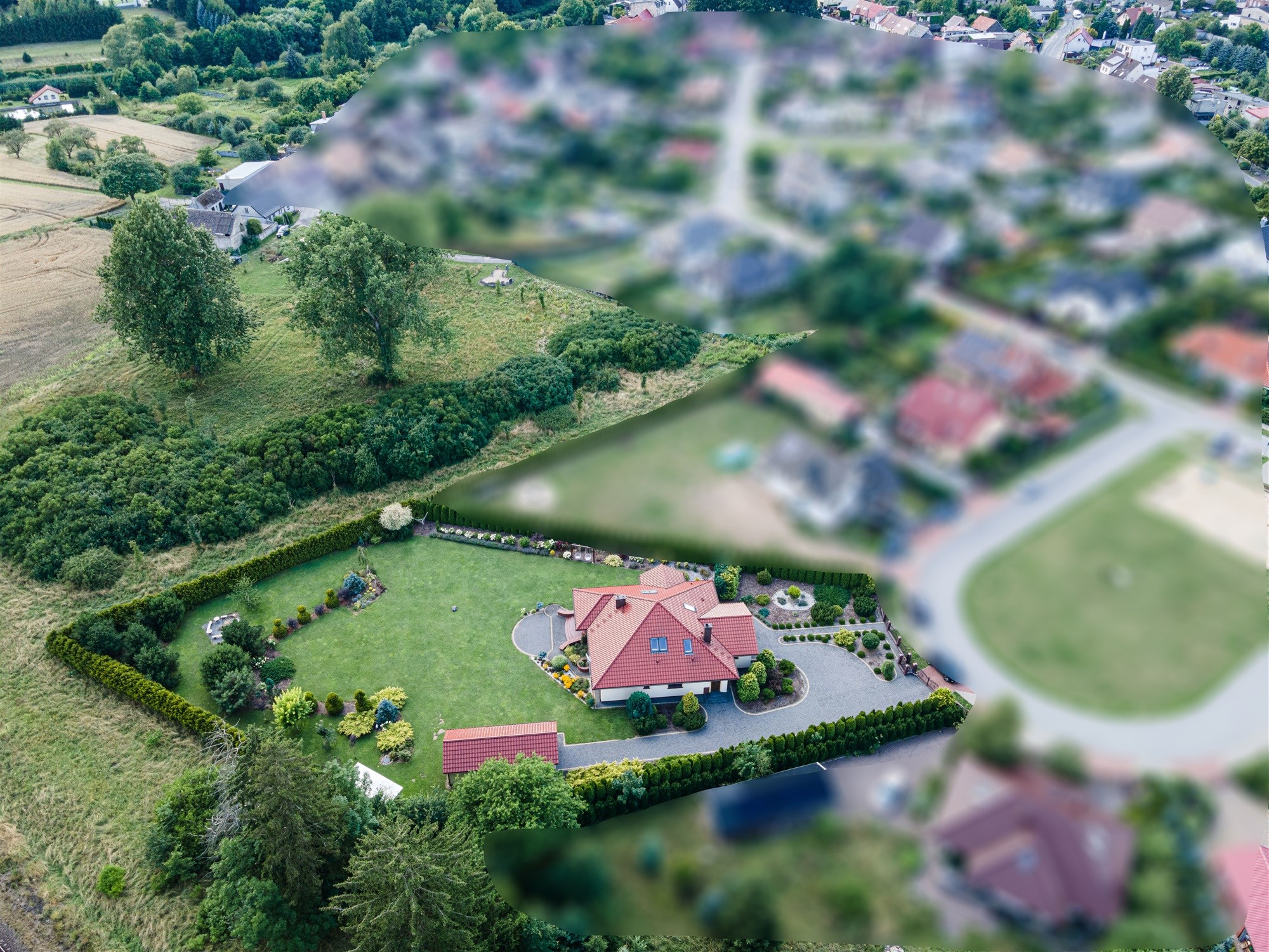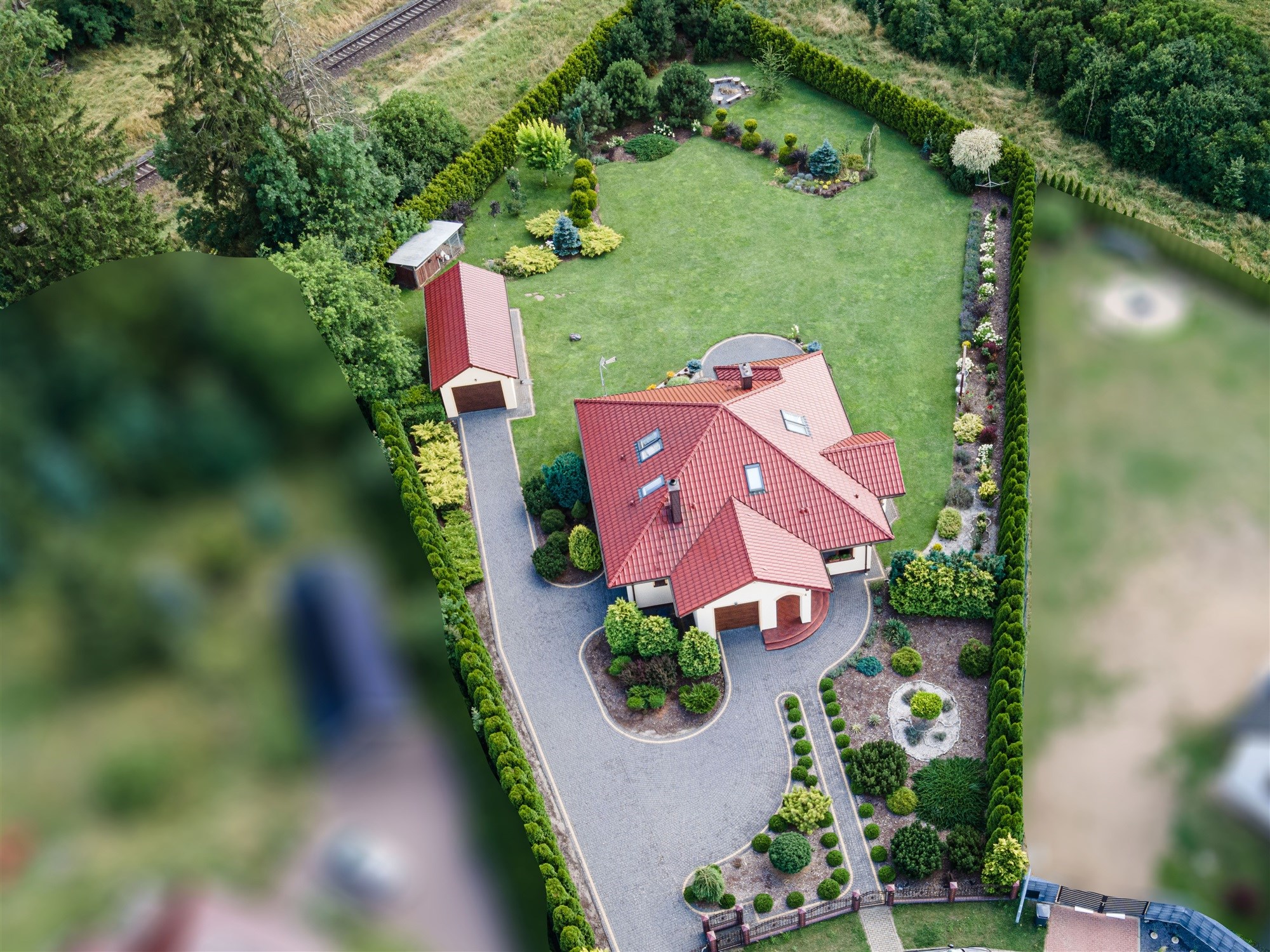 Z dużym pięknie zagospodarowanym ogrodem, tarasem i 2 garażami.