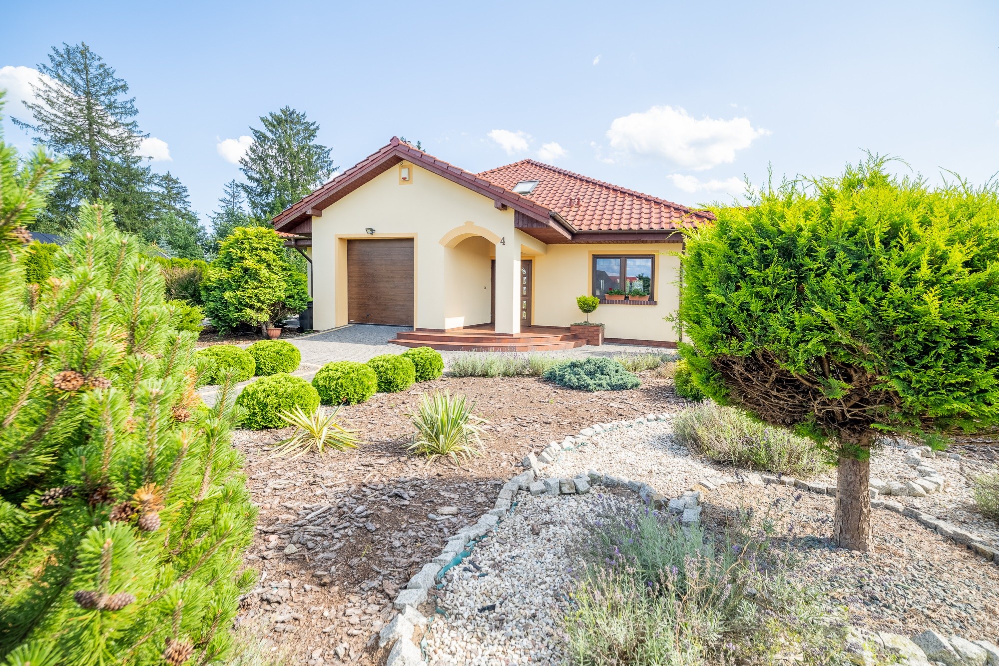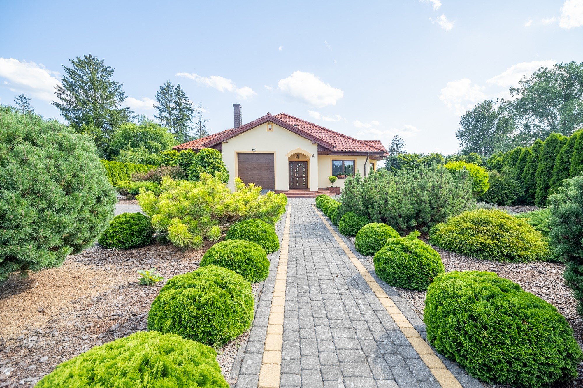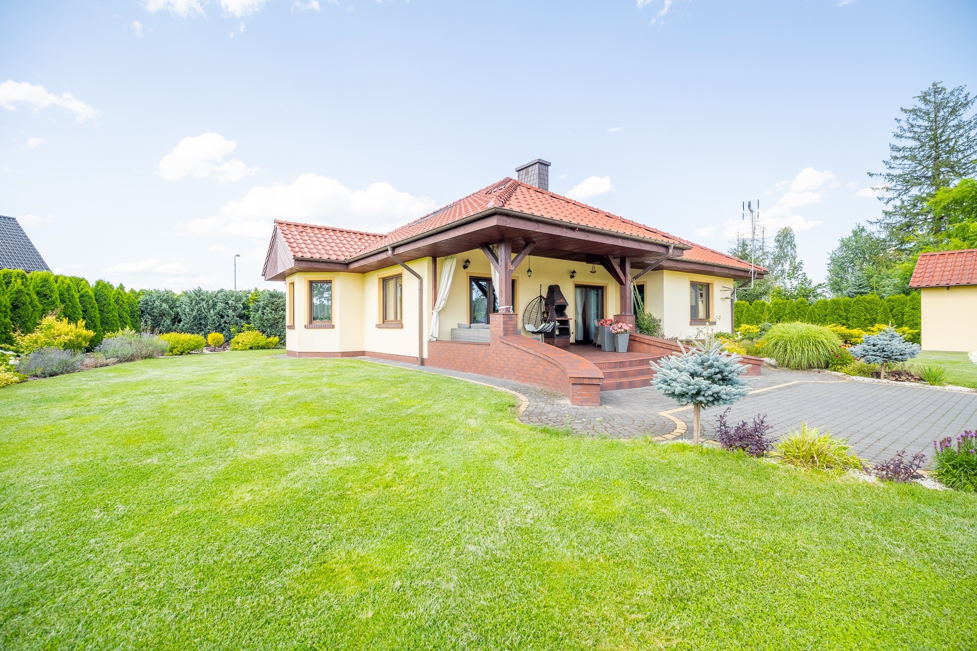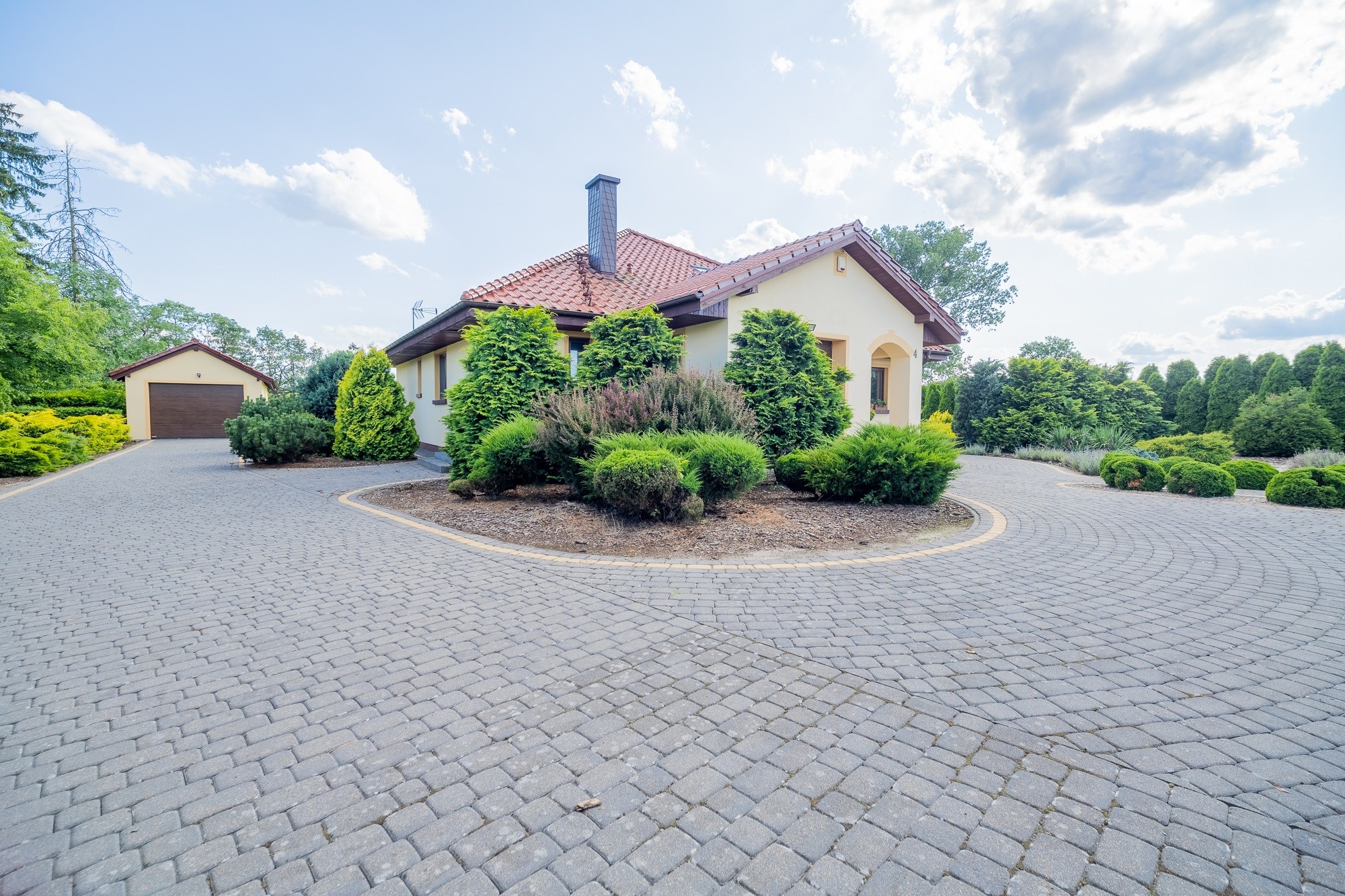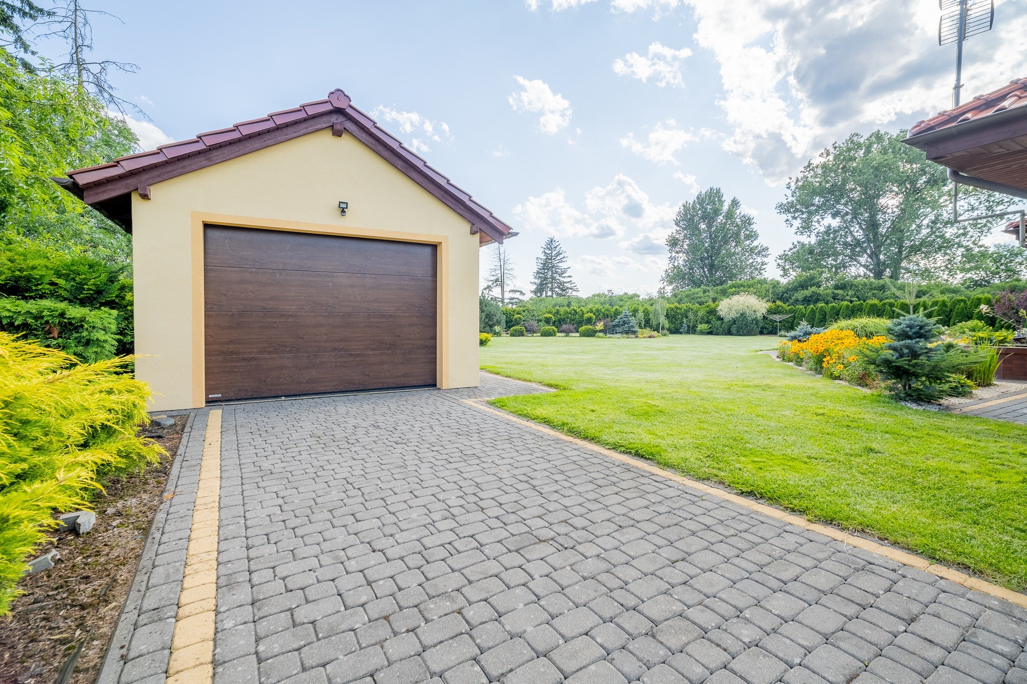 - Wygodne Podjazdy: Podjazdy i ścieżki wyłożone polbrukiem oraz brama wjazdowa i garażowa na pilota to wygoda i elegancja.