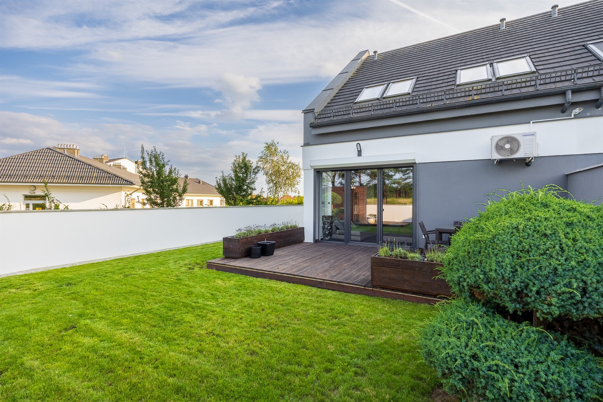 Działka o powierzchni 320 m² jest zadbana i zapewnia ciszę oraz spokój. Z salonu prowadzi wyjście na przestronny taras z widokiem na tereny zielone, gdyż za ogrodzeniem nie ma już zabudowanej działki. To idealne miejsce na relaks i odpoczynek.