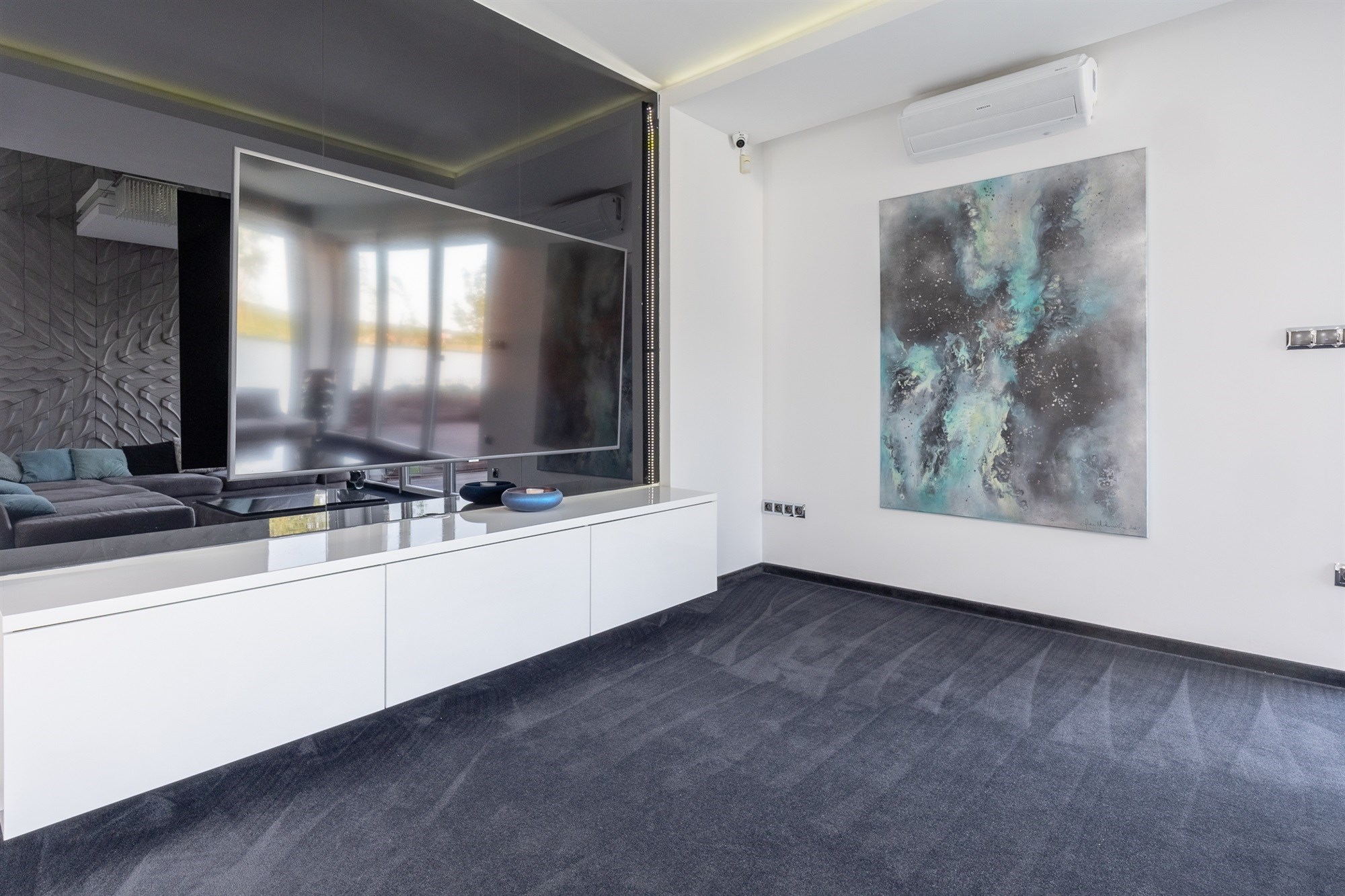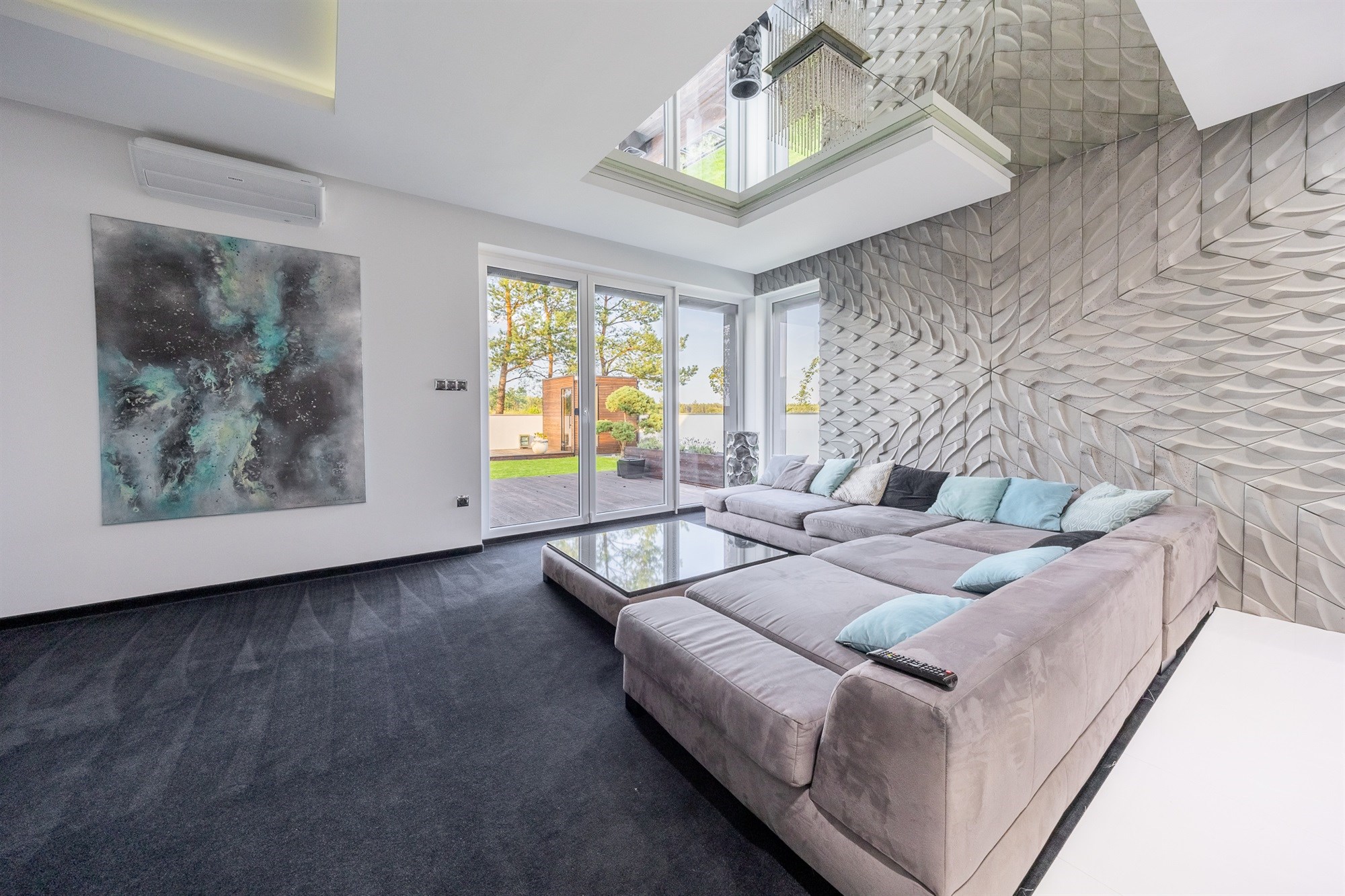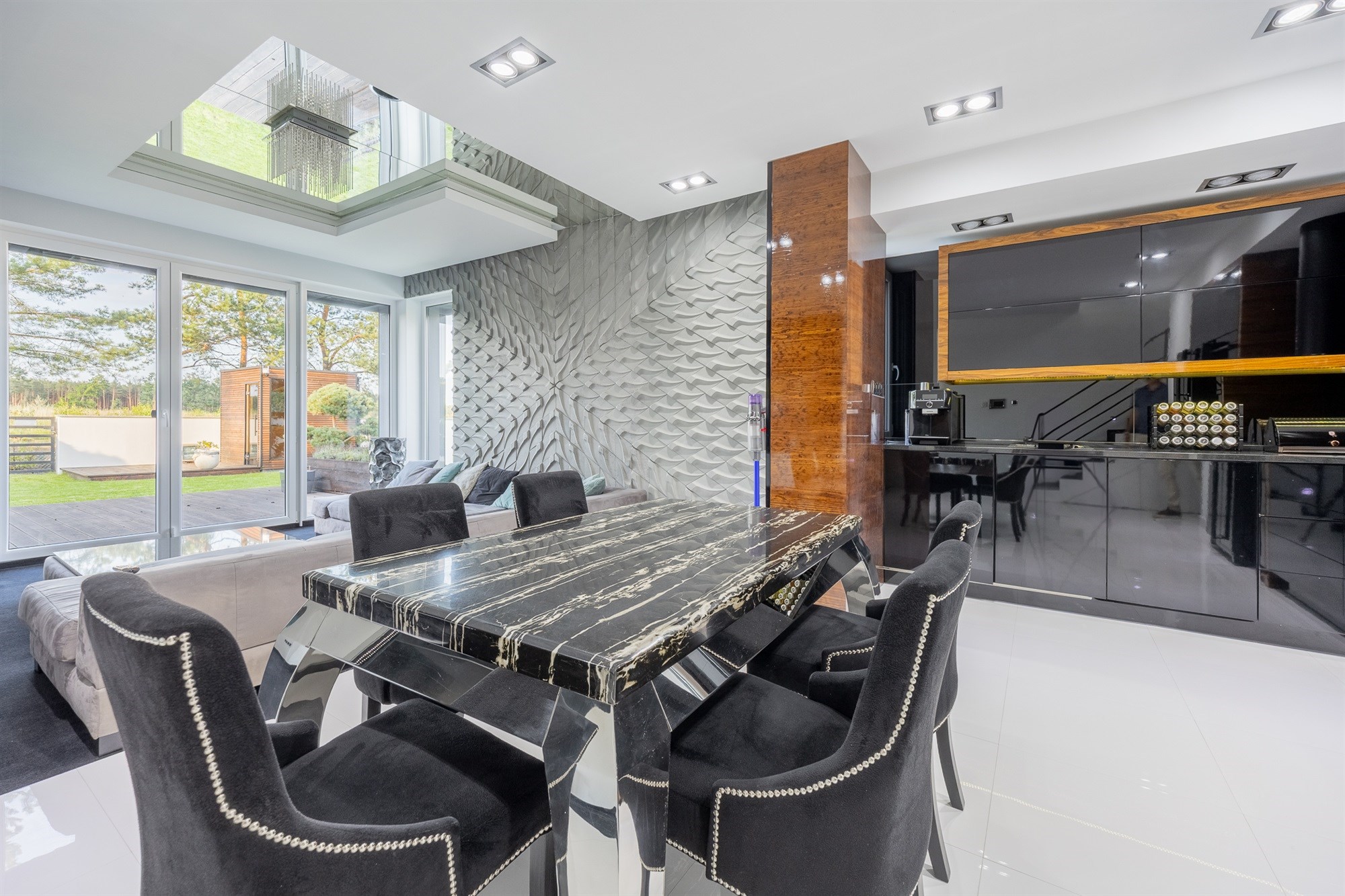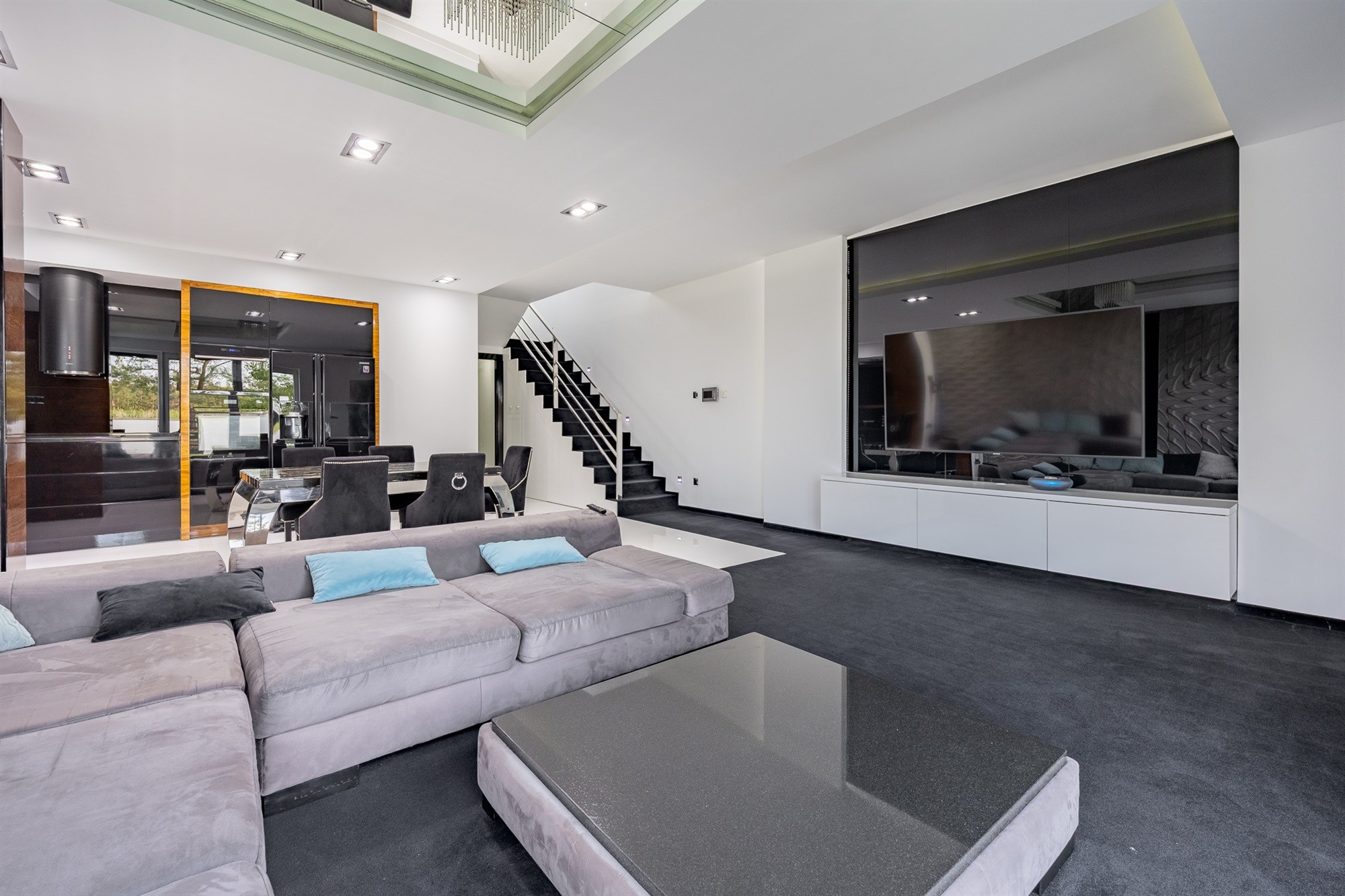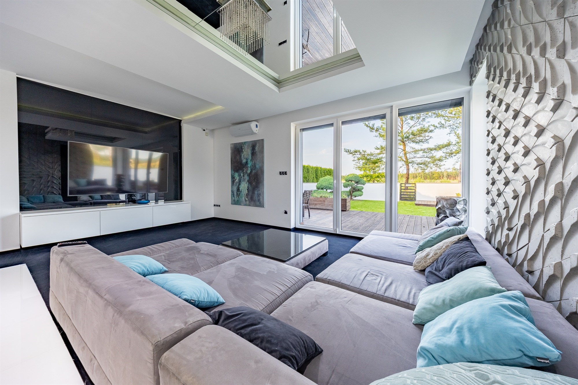 W salonie komfortowe meble, podwieszane sufity, lustra wielkopowierzchniowe, szafki na wysoki połysk i szafki dotykowe. Duże okna zapewniają naturalne światło dzienne. Oświetlenie domu nowoczesne, z wieloma strefami świetlnymi.