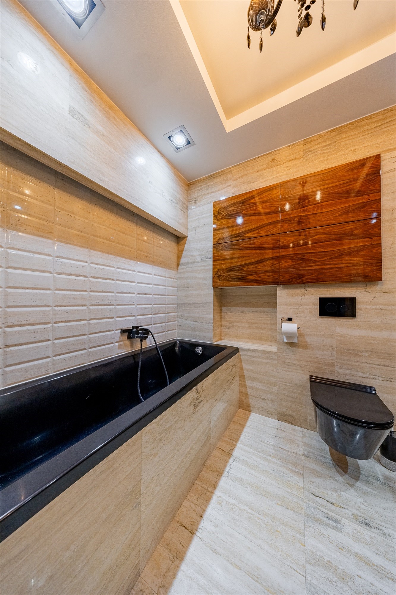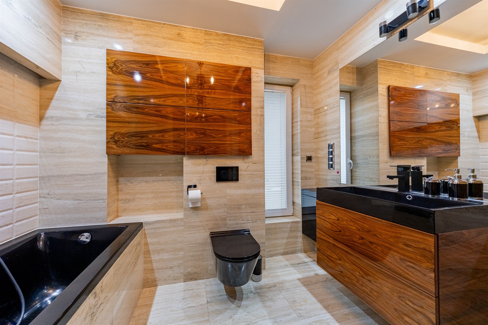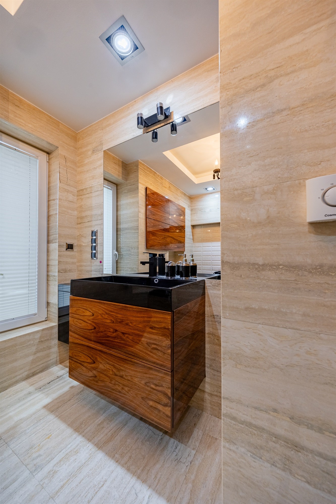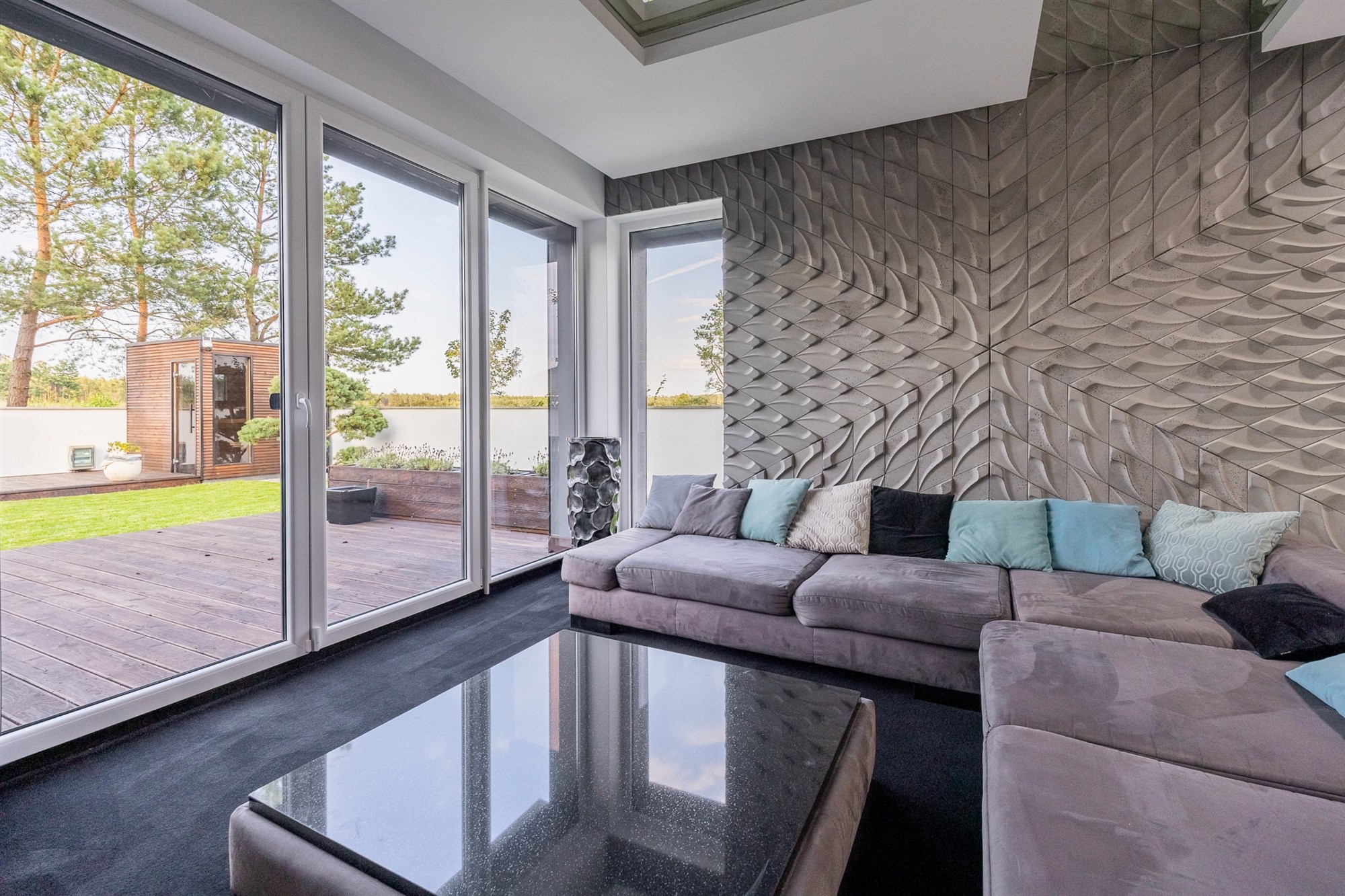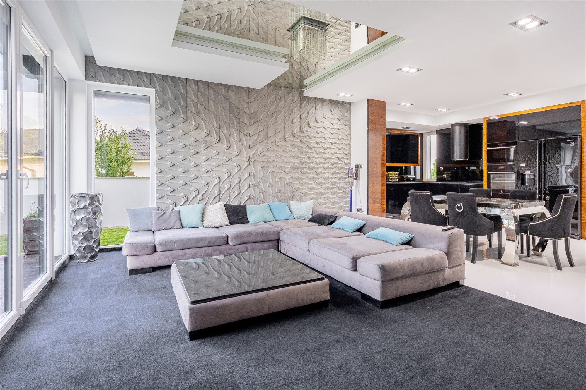 W salonie komfortowe meble, podwieszane sufity, lustra wielkopowierzchniowe, szafki na wysoki połysk i szafki dotykowe. Duże okna zapewniają naturalne światło dzienne. Oświetlenie domu nowoczesne, z wieloma strefami świetlnymi.