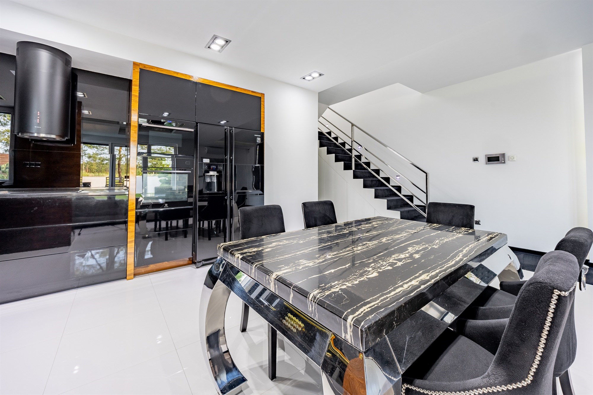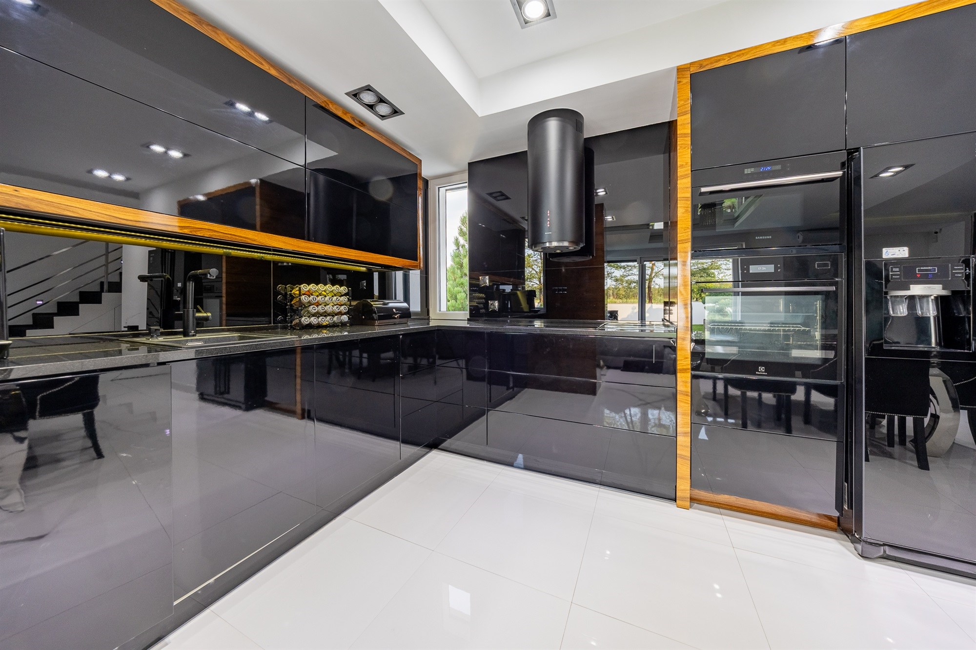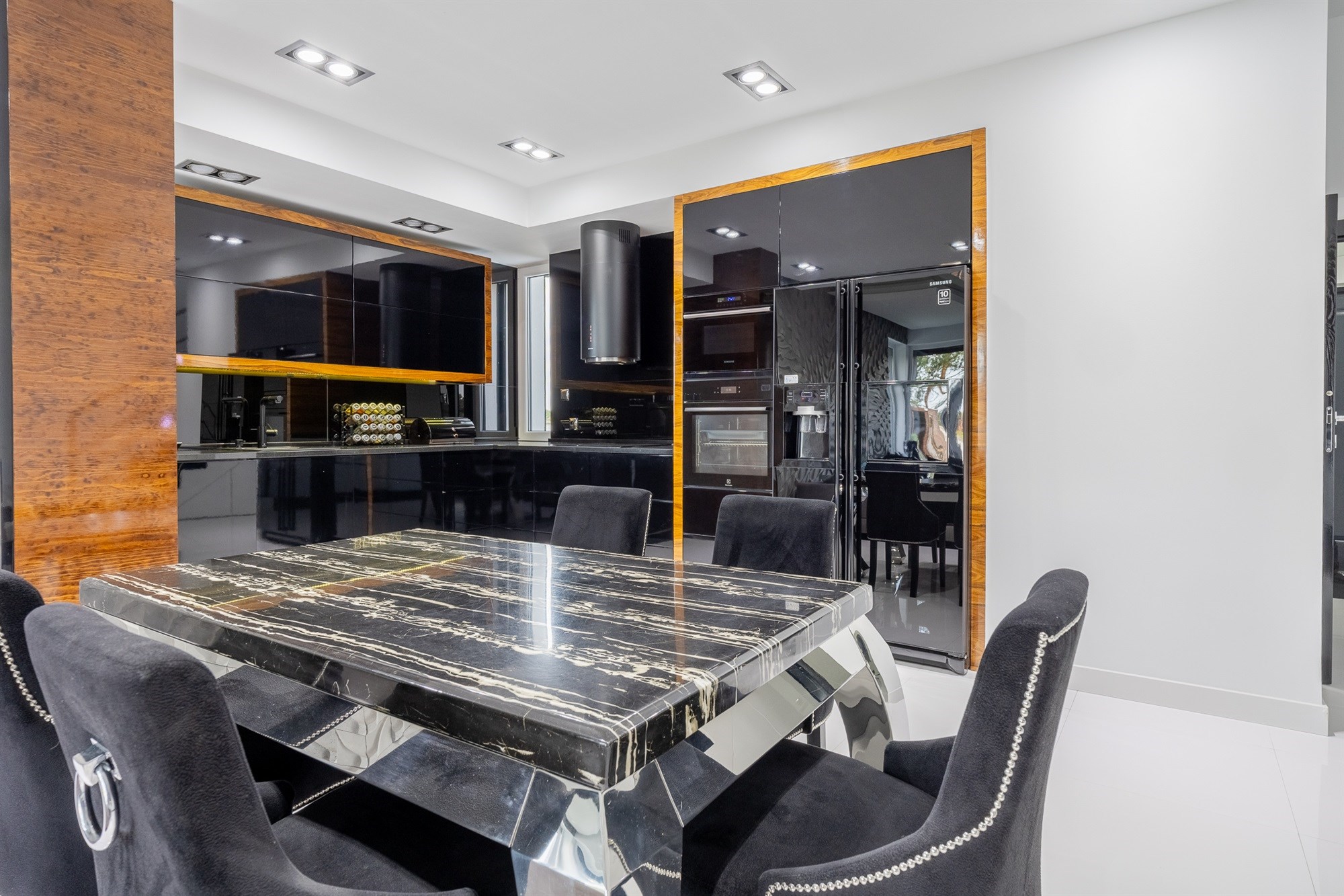 Kuchnia wyposażona w zabudowę na wymiar z wysokiej jakości sprzętem AGD, zgodnie z najnowszymi trendami. Między salonem a aneksem kuchennym znajduje się przestrzeń na rodzinny stół jadalniany, który sprzyja wspólnym posiłkom i spotkaniom w gronie najbliższych. Z salonu wyjście na duży taras z widokiem na zieleń.