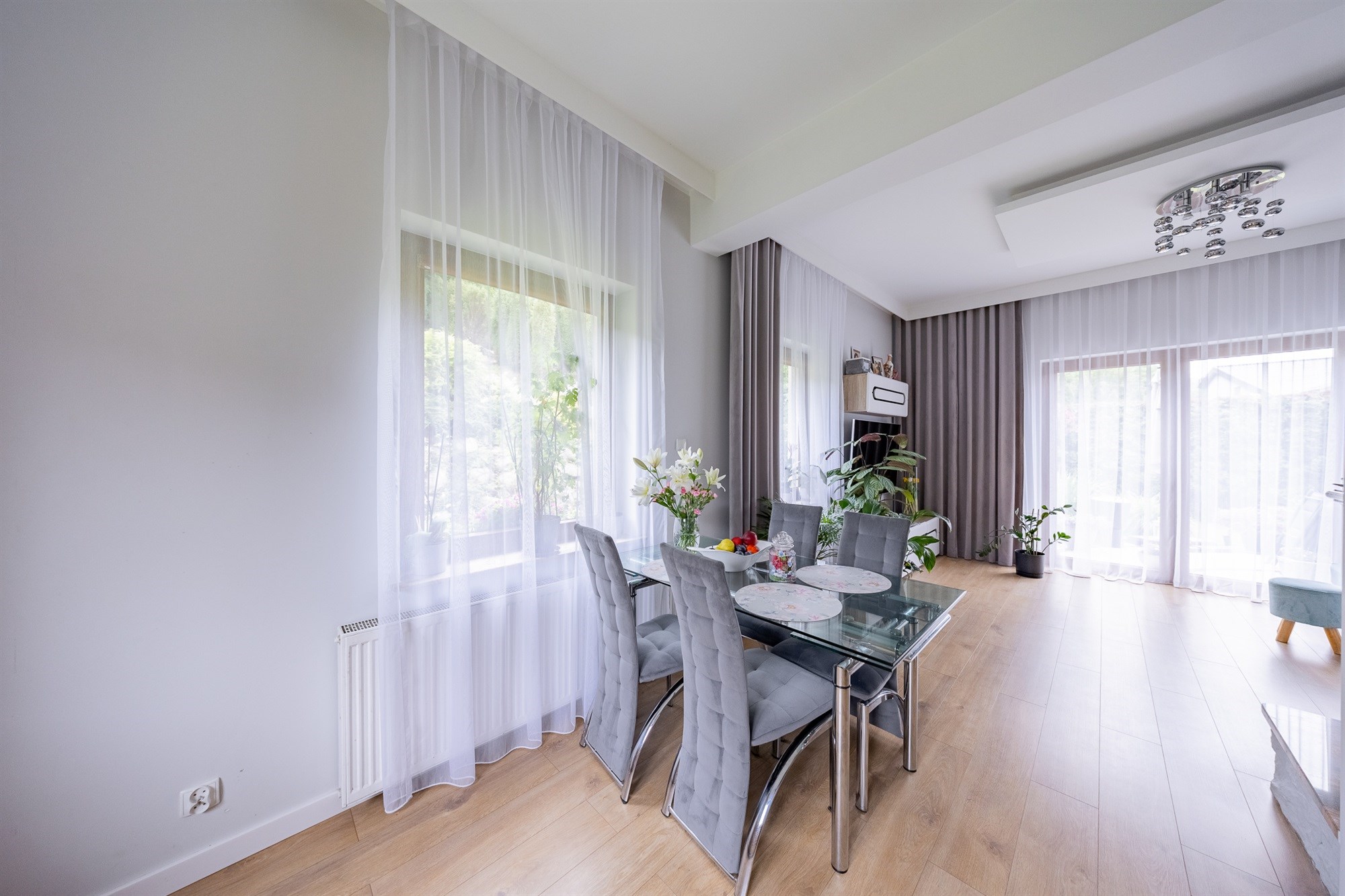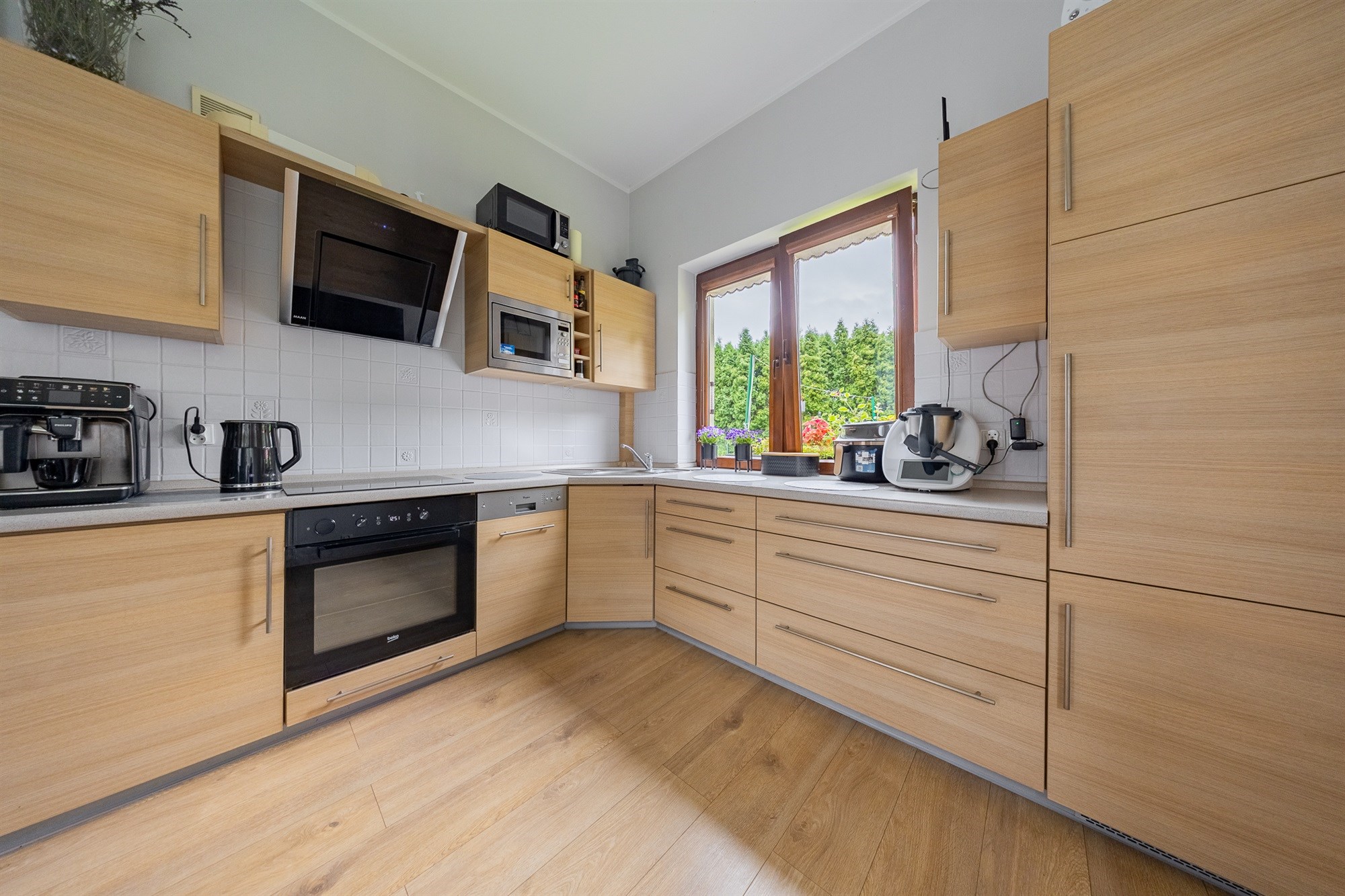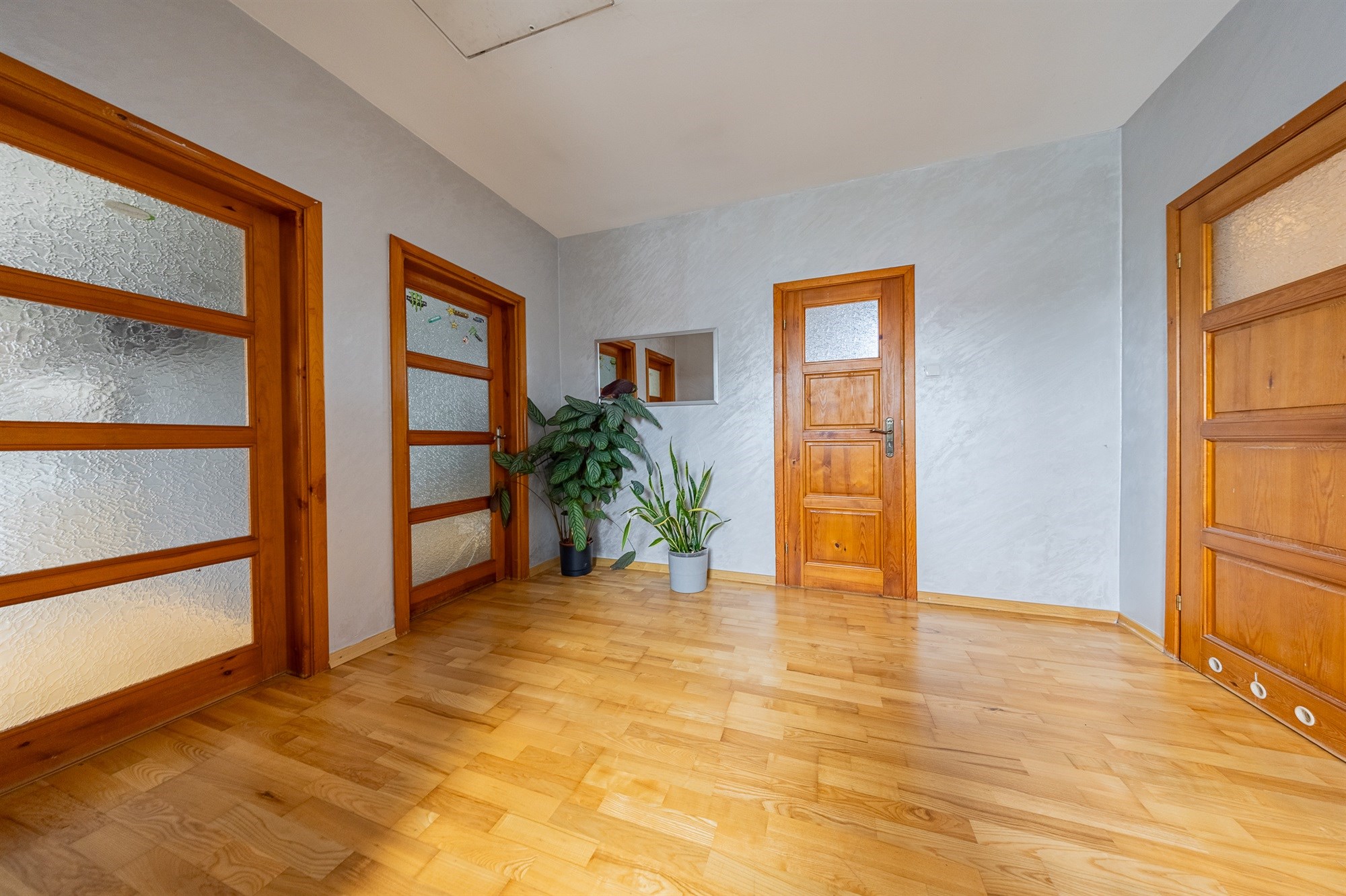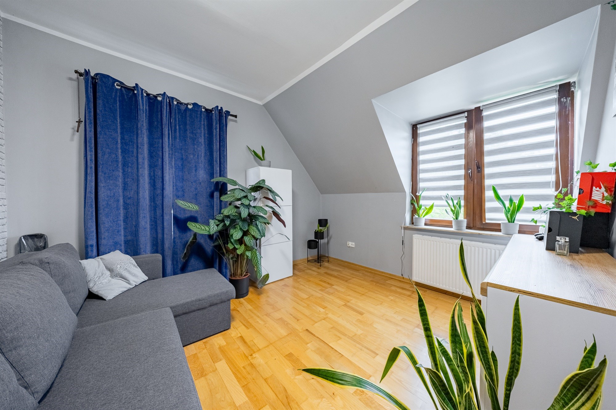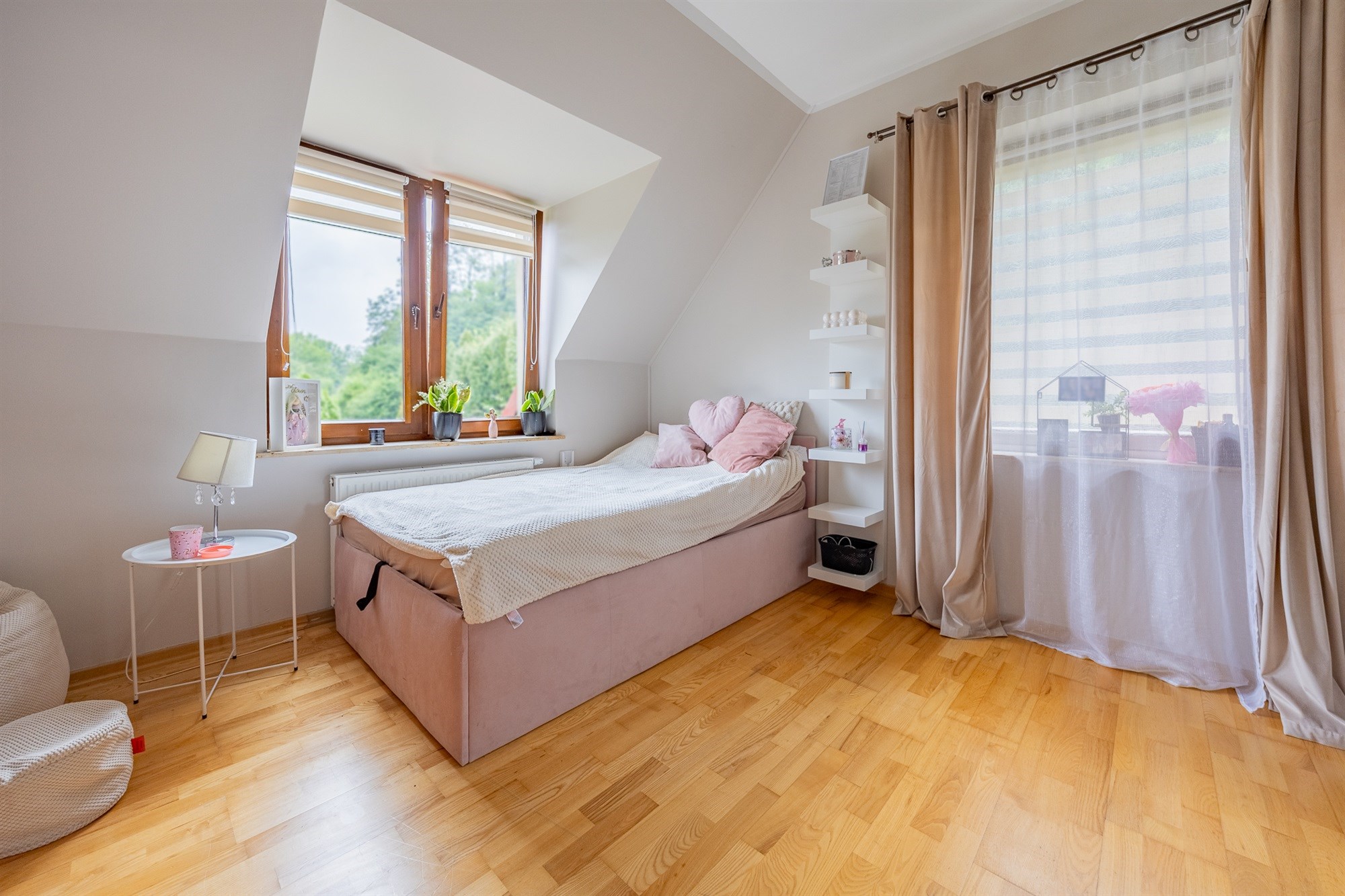 - Piętro: trzy ustawne pokoje, idealne na sypialnie, gabinety lub pokoje dziecięce. Na piętro prowadzą drewniane schody. Na podłodze deska barlinecka.