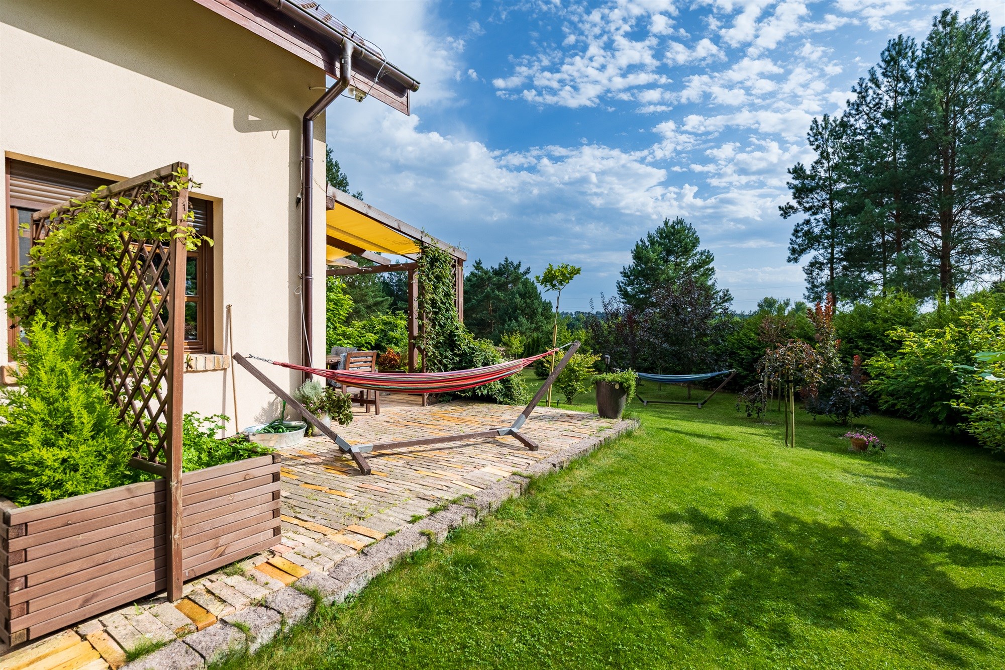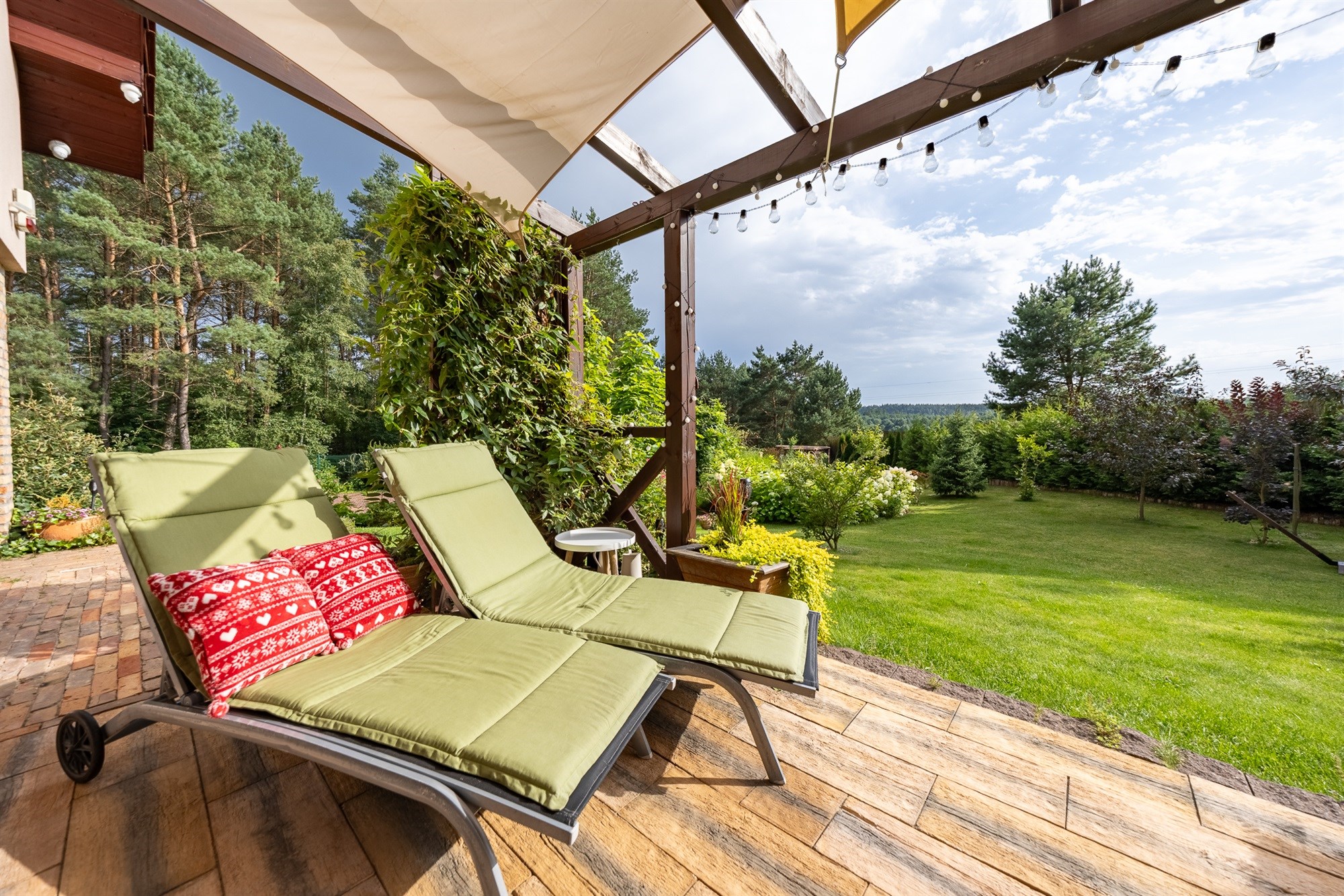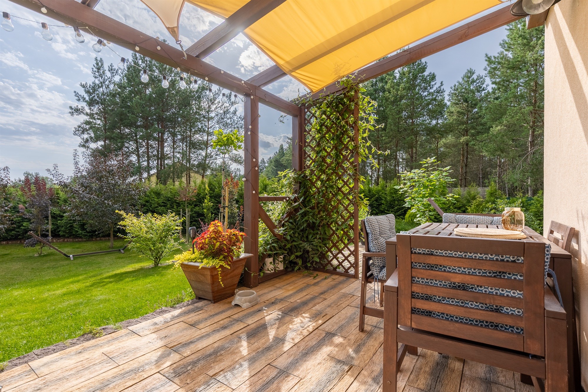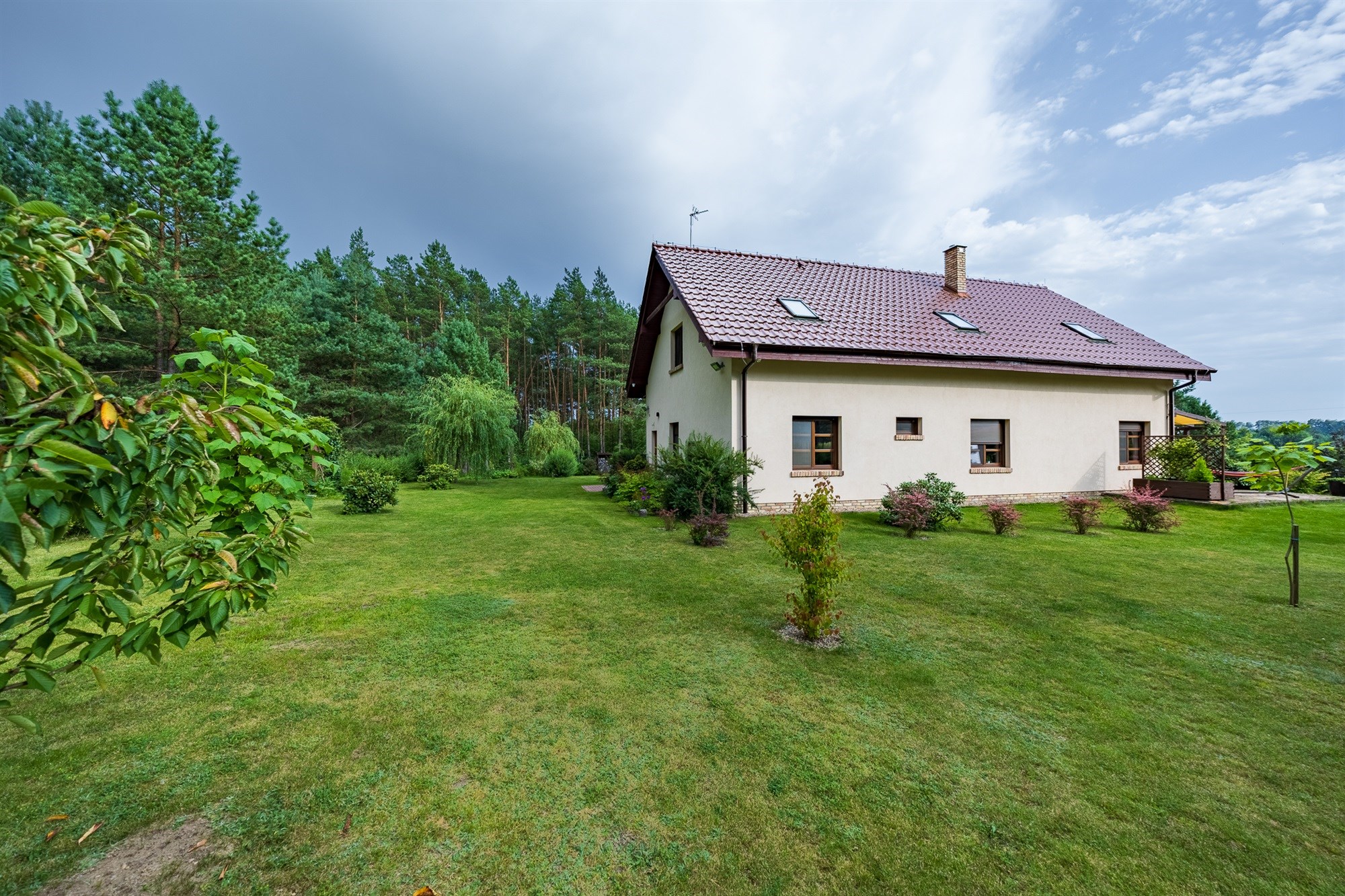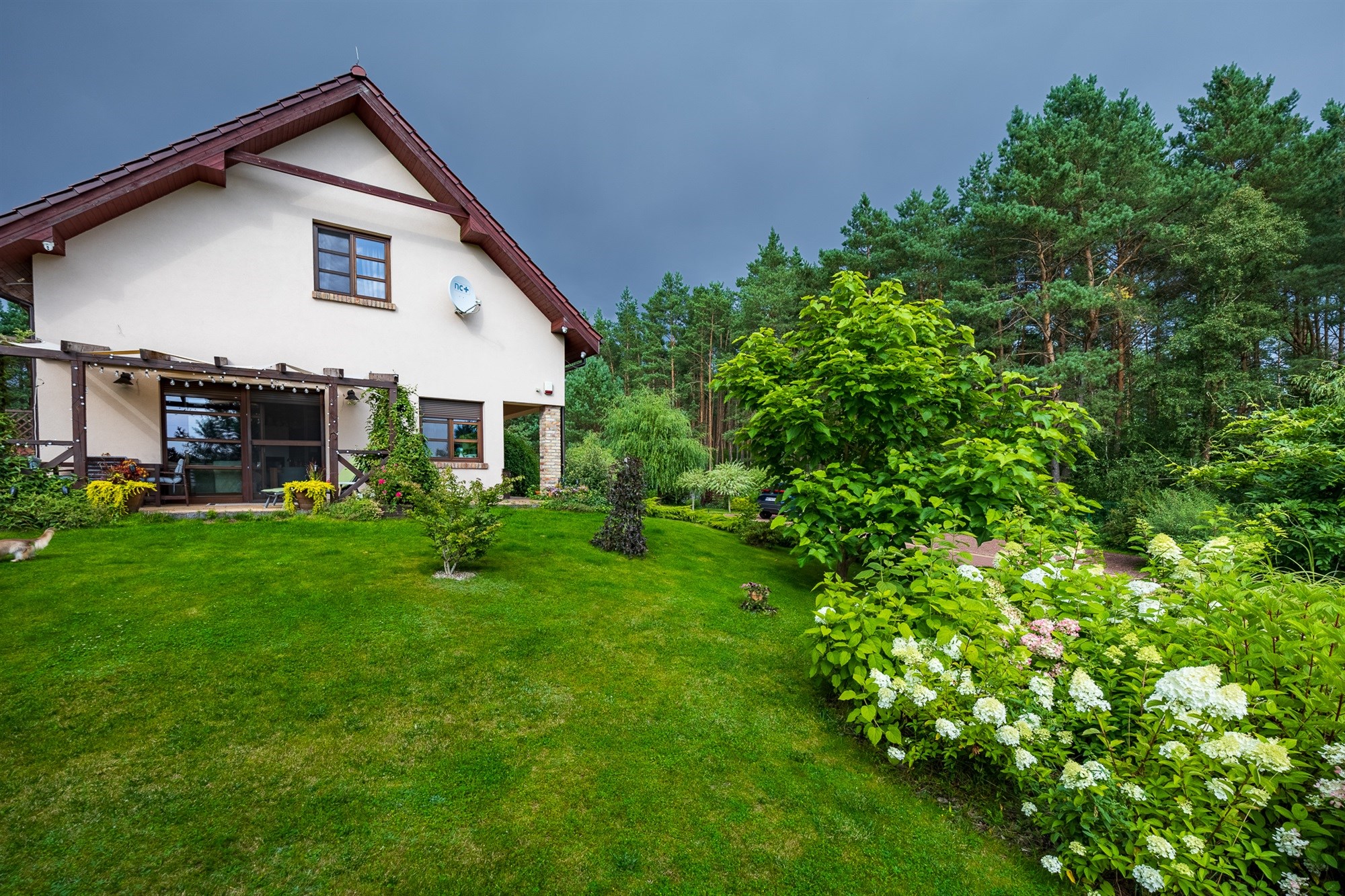 Ogród pełen wieloletnich nasadzeń zachwyca o każdej porze roku – to wymarzone miejsce na poranną kawę, letnie obiady czy wieczorne spotkania przy wspólnym stole. Lekkie pochylenie działki ku granicy ogrodu sprawia, że widok z tarasu rozciąga się daleko w stronę lasu, tworząc niepowtarzalny klimat relaksu.