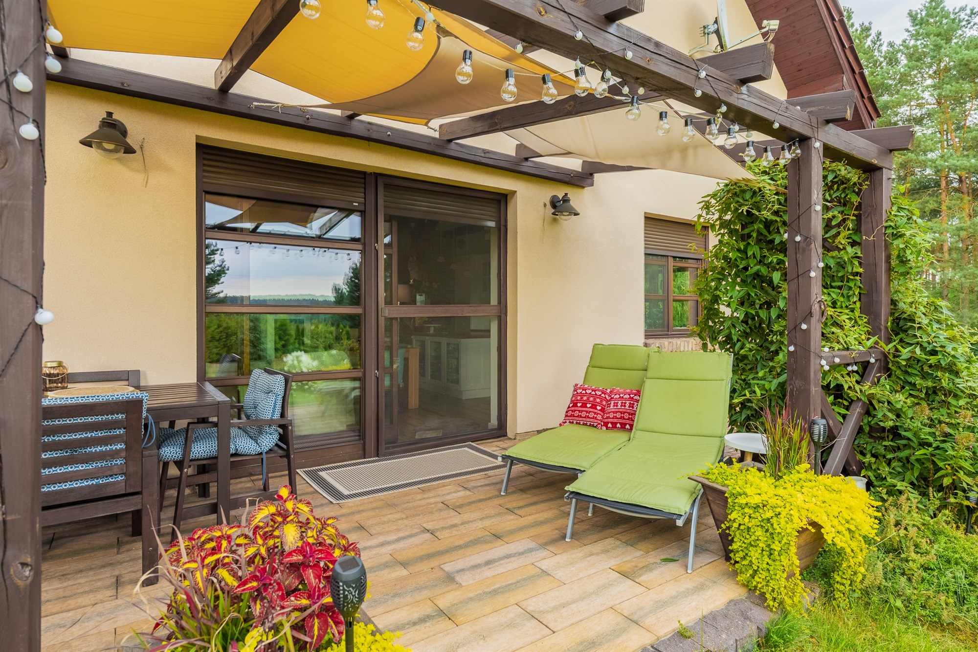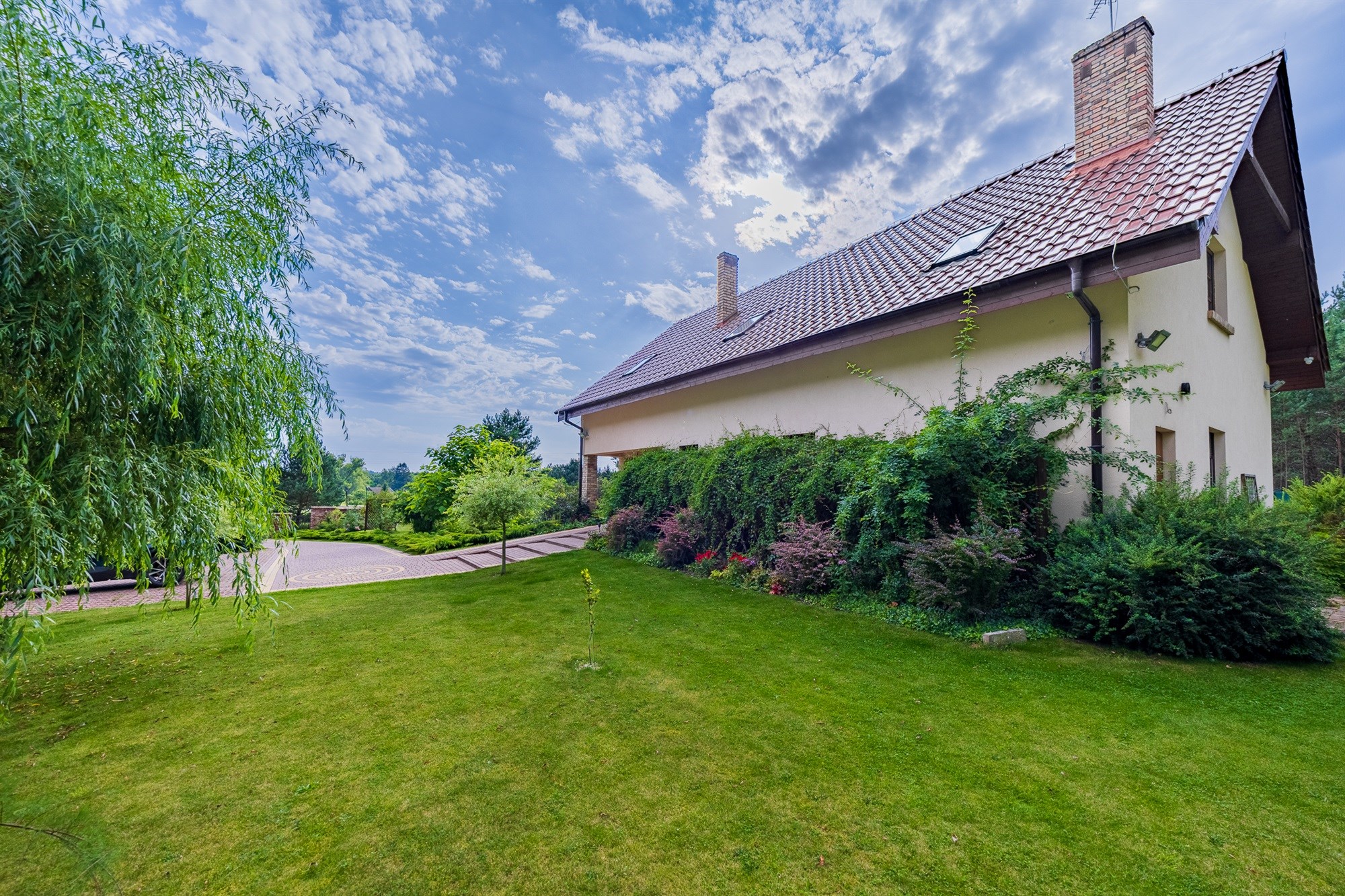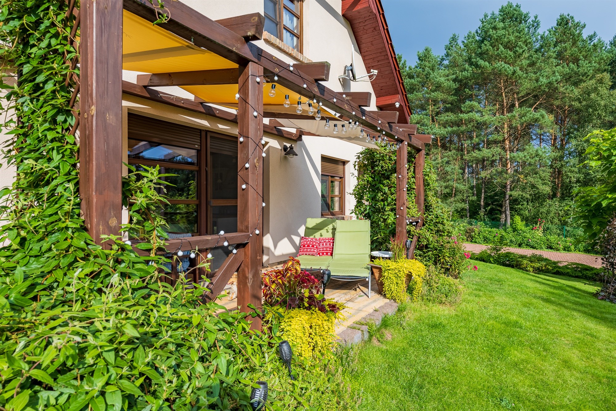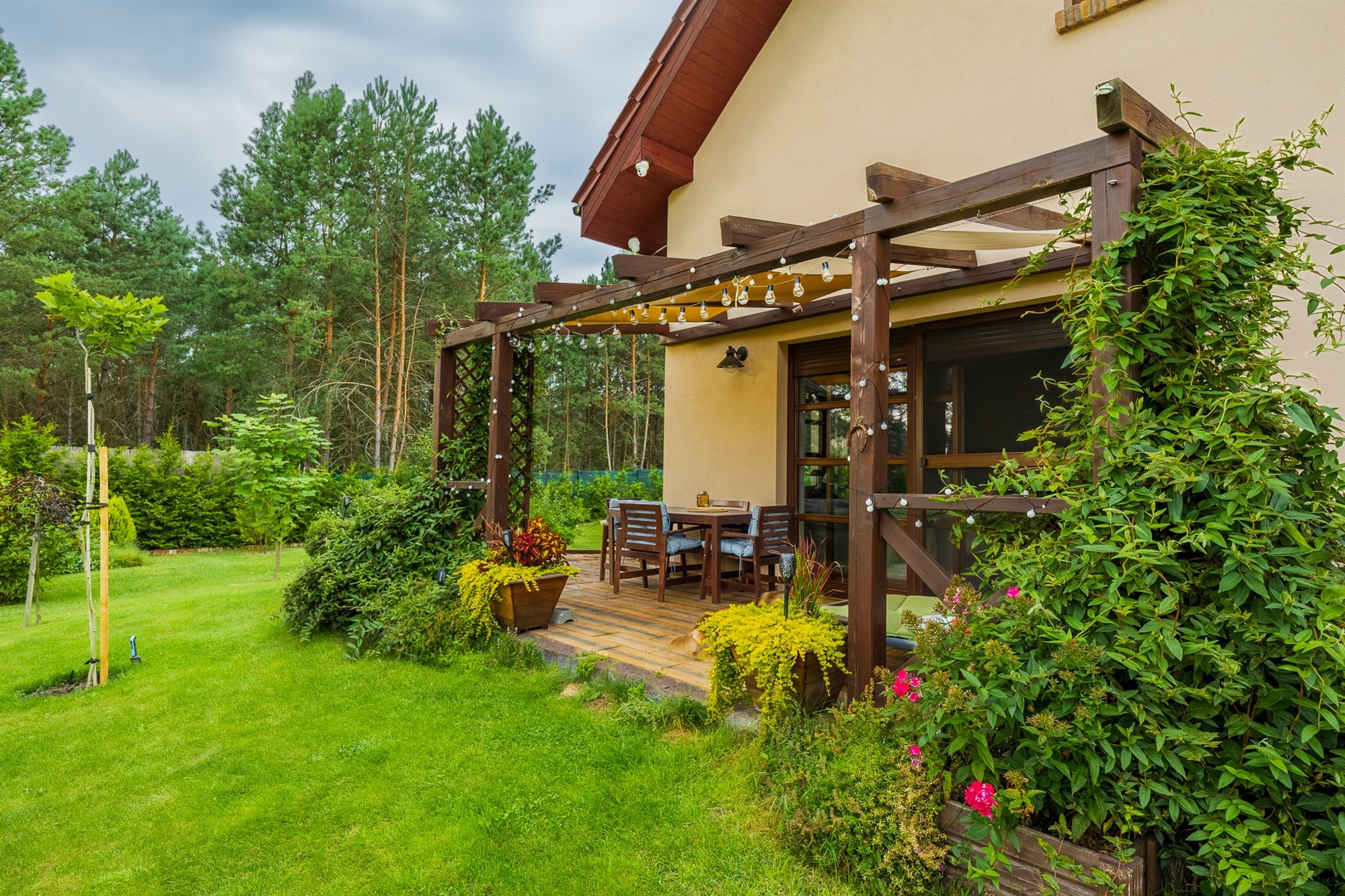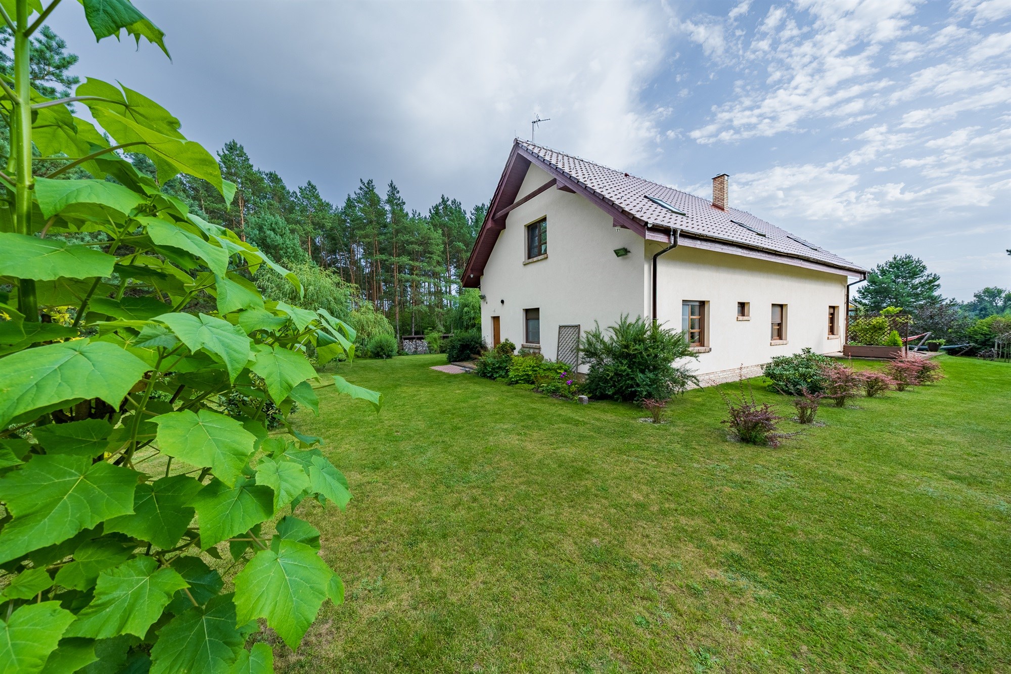 Ogród pełen wieloletnich nasadzeń zachwyca o każdej porze roku – to wymarzone miejsce na poranną kawę, letnie obiady czy wieczorne spotkania przy wspólnym stole. Lekkie pochylenie działki ku granicy ogrodu sprawia, że widok z tarasu rozciąga się daleko w stronę lasu, tworząc niepowtarzalny klimat relaksu.