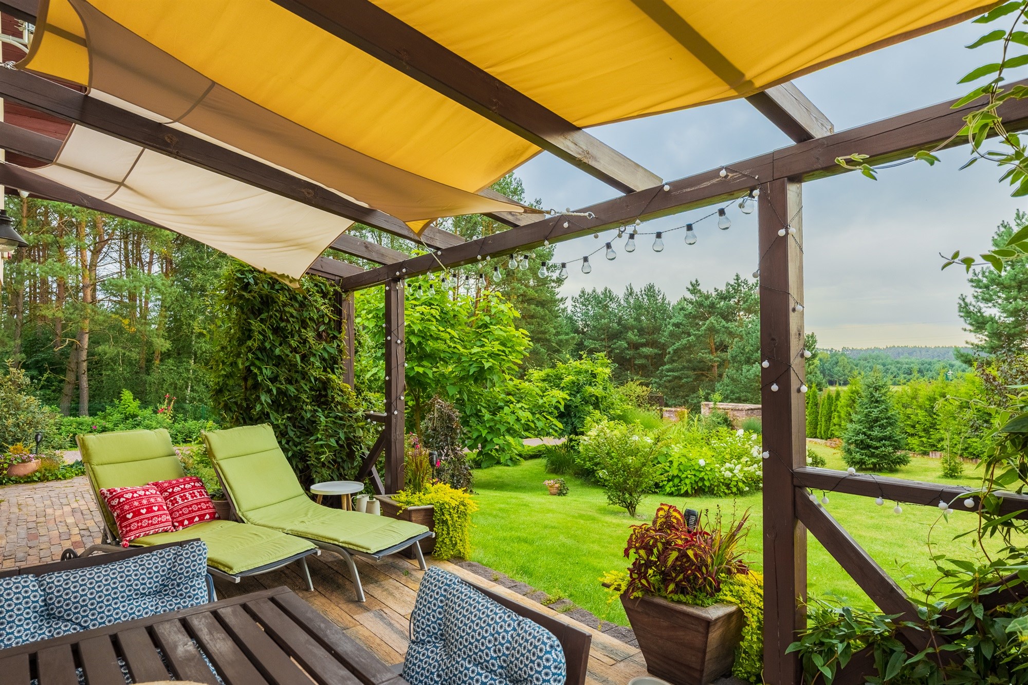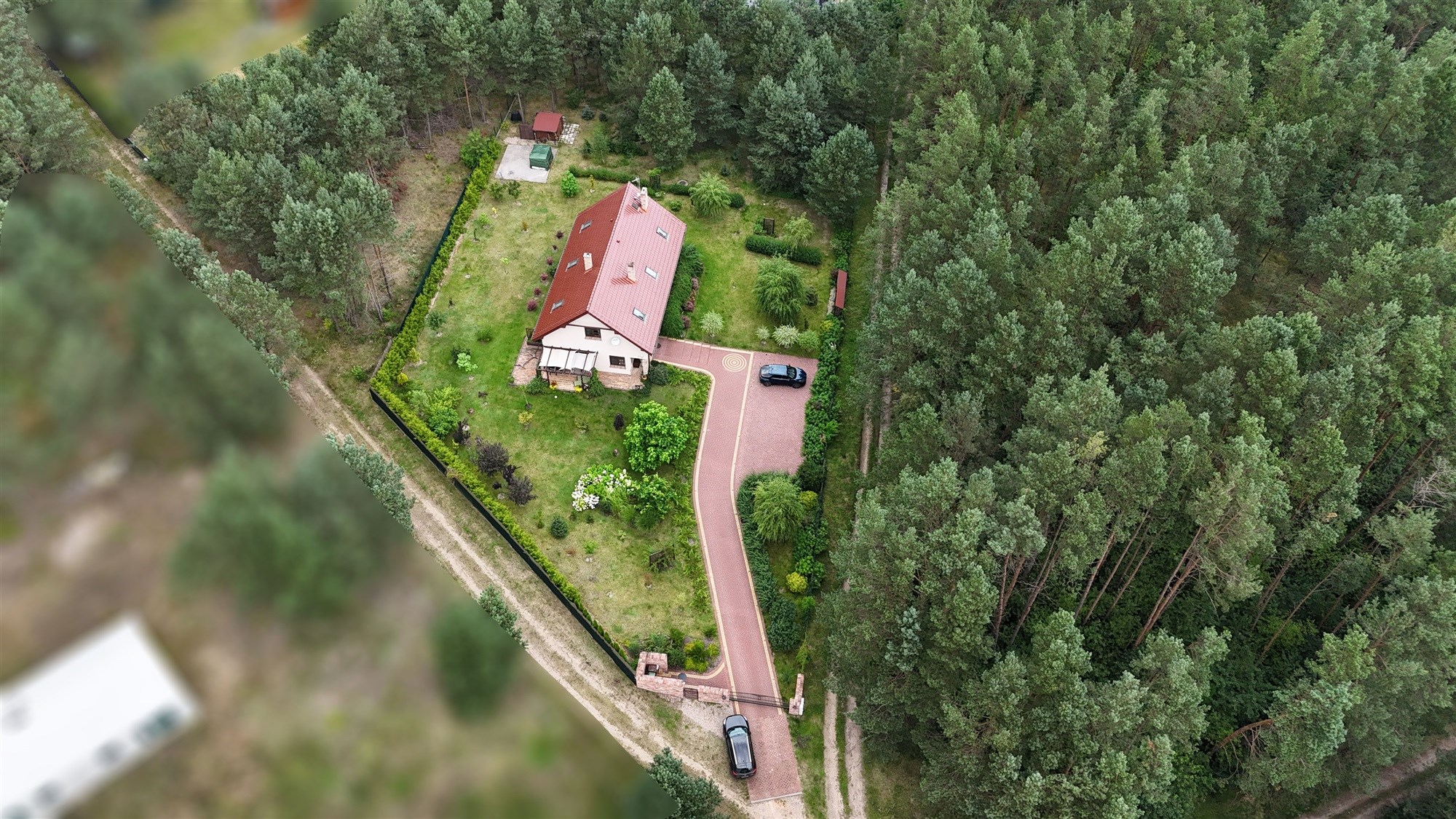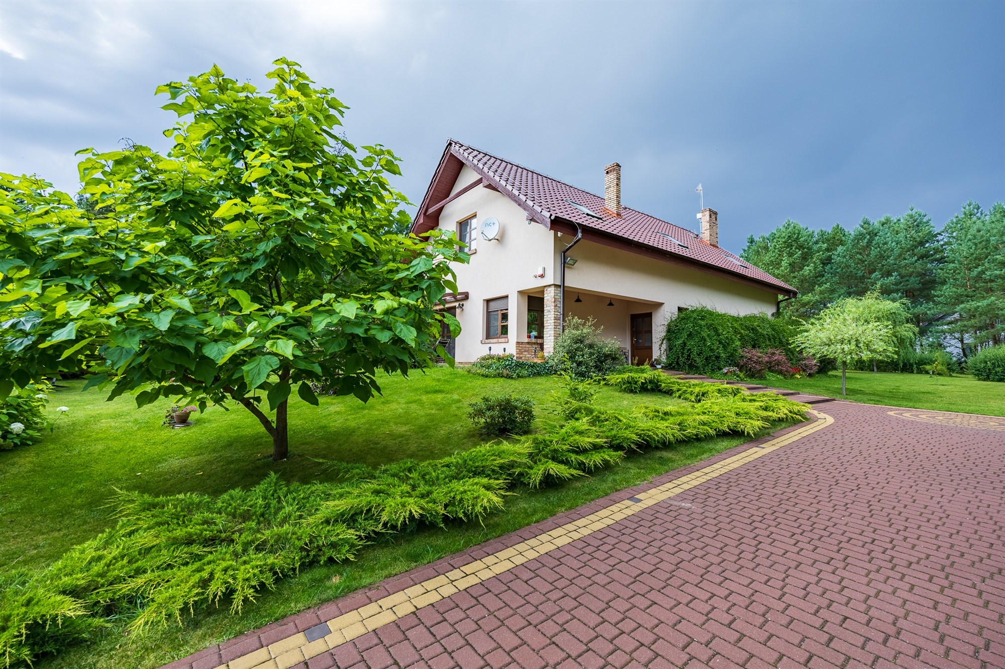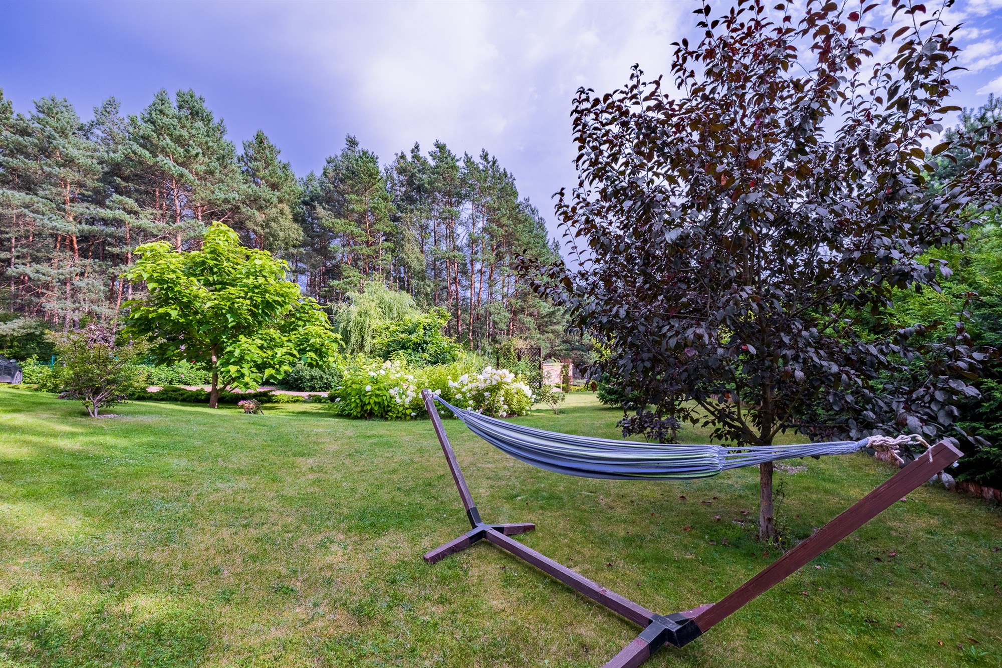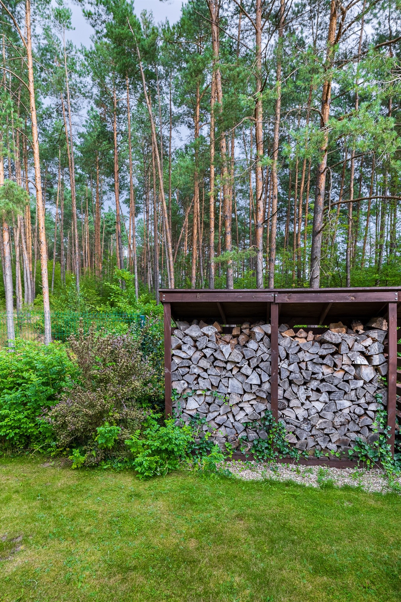 Ogród pełen wieloletnich nasadzeń zachwyca o każdej porze roku – to wymarzone miejsce na poranną kawę, letnie obiady czy wieczorne spotkania przy wspólnym stole. Lekkie pochylenie działki ku granicy ogrodu sprawia, że widok z tarasu rozciąga się daleko w stronę lasu, tworząc niepowtarzalny klimat relaksu.
