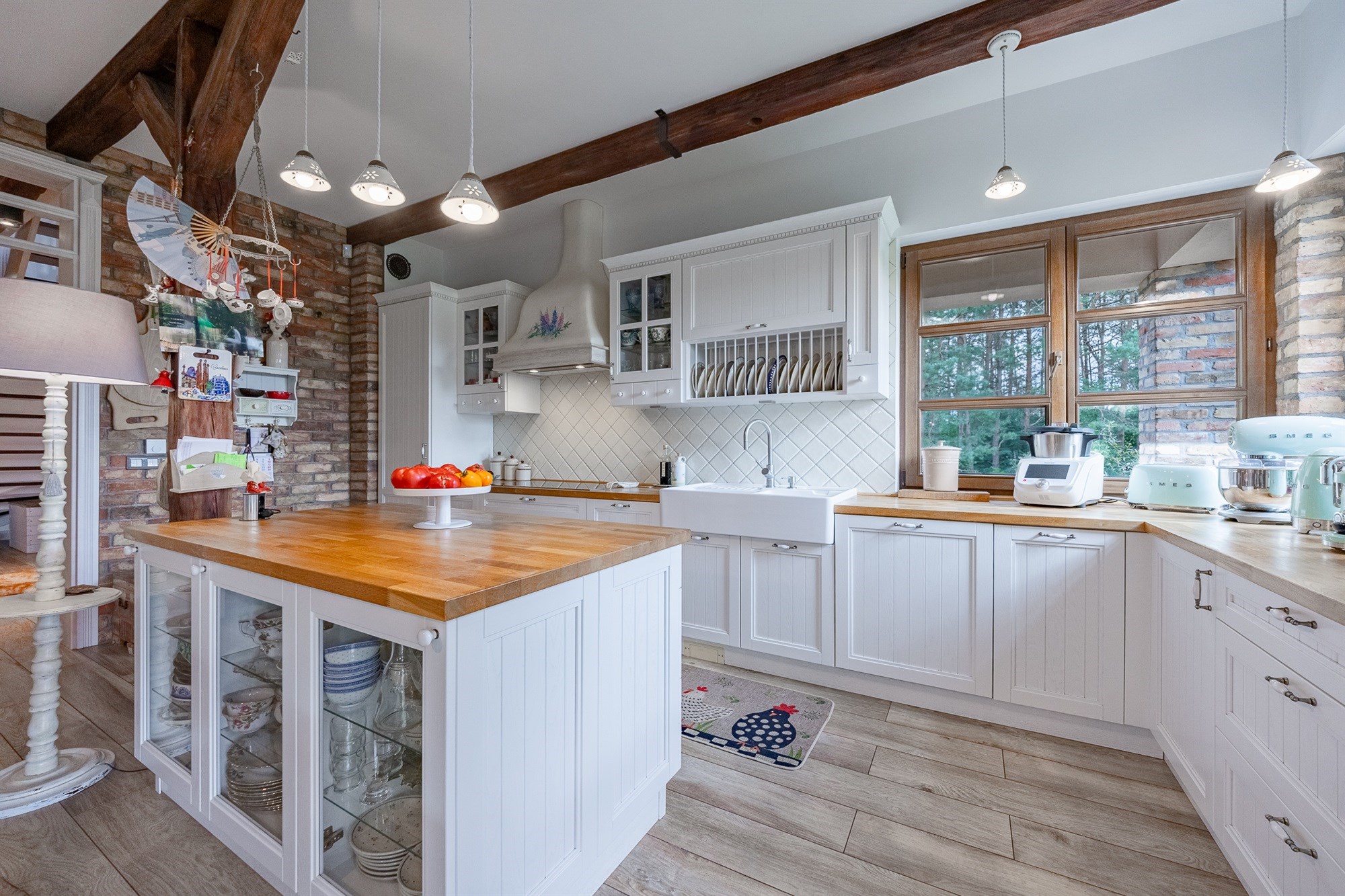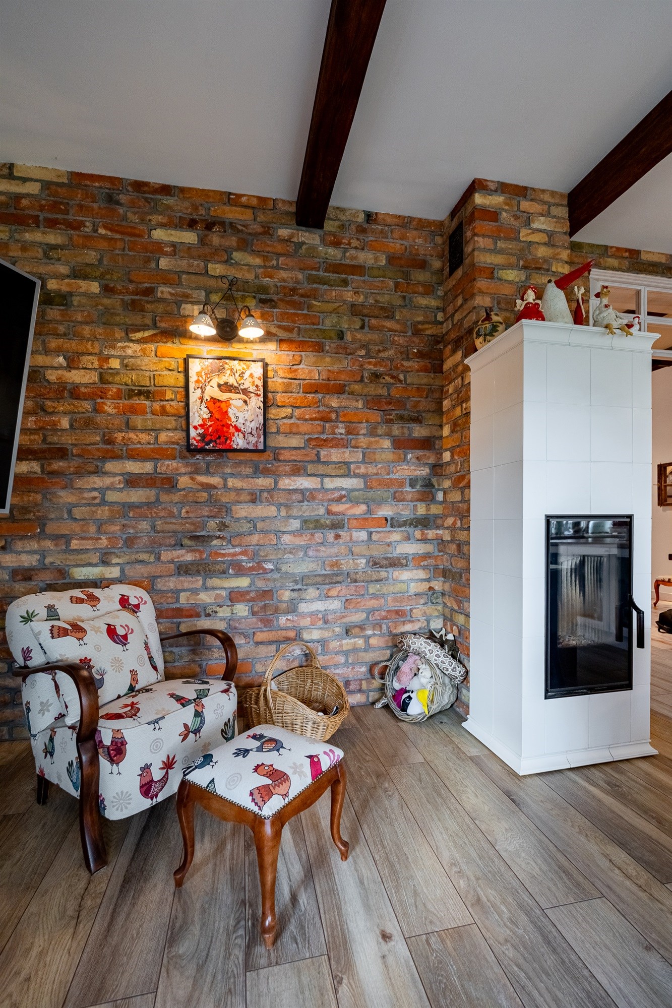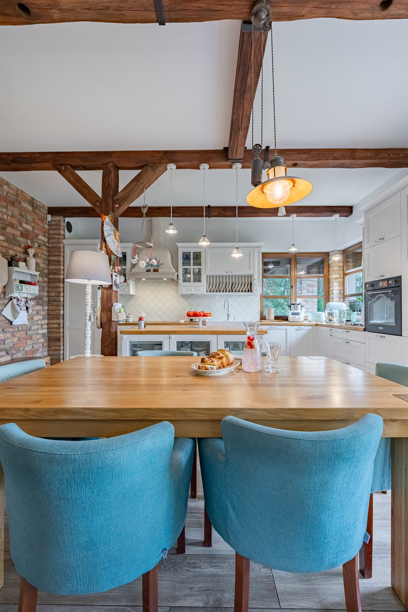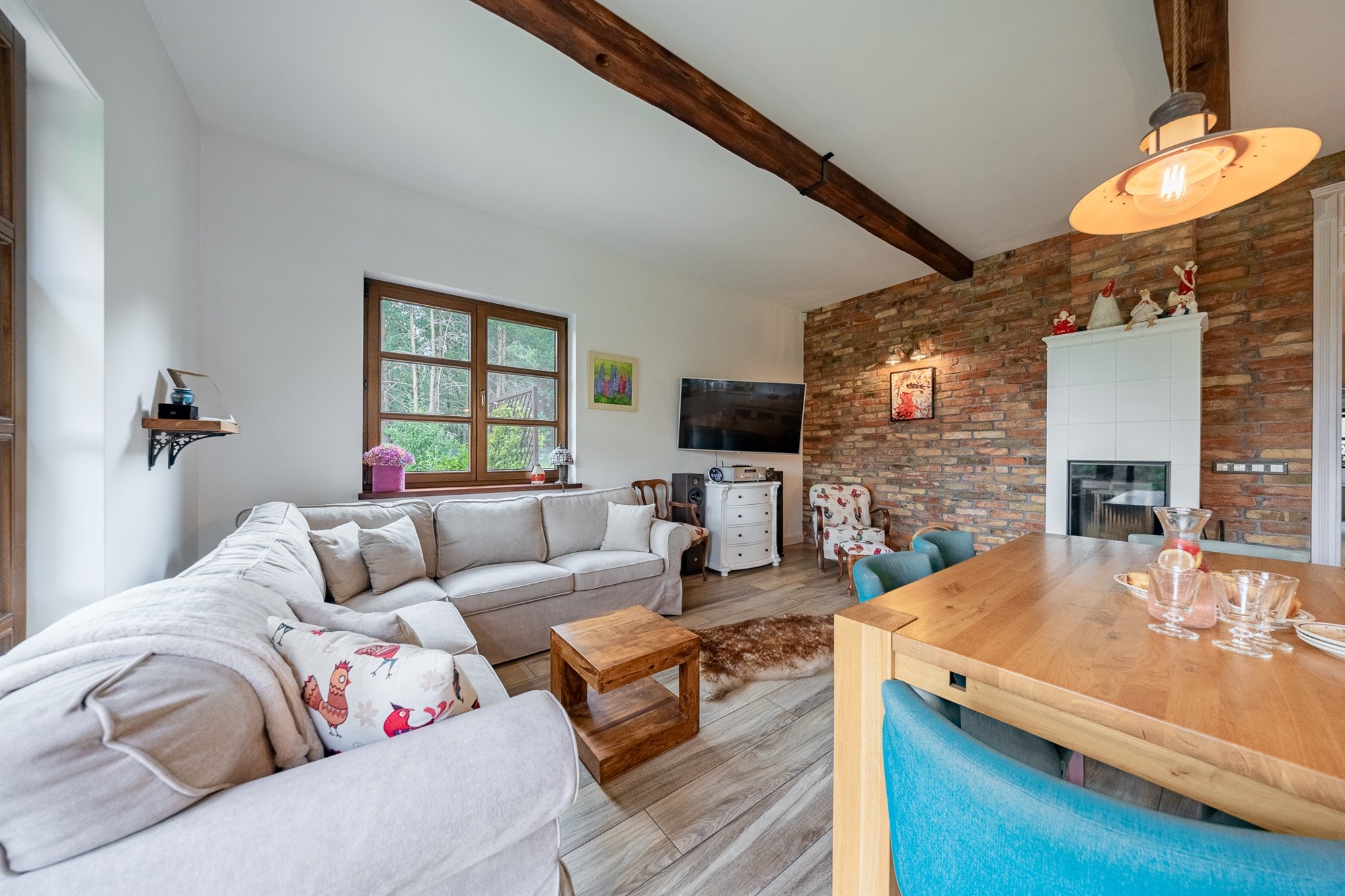 Na parterze o przemyślanym, funkcjonalnym układzie dominuje przestronny salon z kominkiem (24,88 m²) – ciepły, przytulny i pełen charakteru. Ściana z naturalnej cegły, wygodne fotele i duży stół tworzą miejsce, w którym chce się spędzać czas z rodziną. Otwarta kuchnia z jadalnią (11,57 m²) zachwyca piękną zabudową i wyjątkowym klimatem – drewniane belki pod sufitem i ceglane akcenty nadają jej rustykalny urok w nowoczesnym wydaniu.