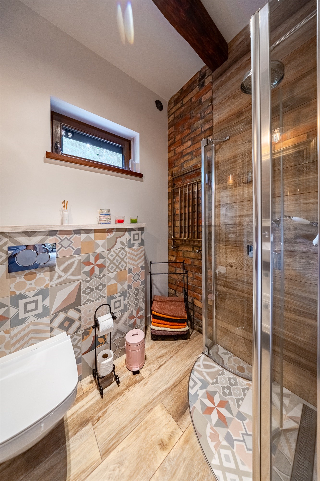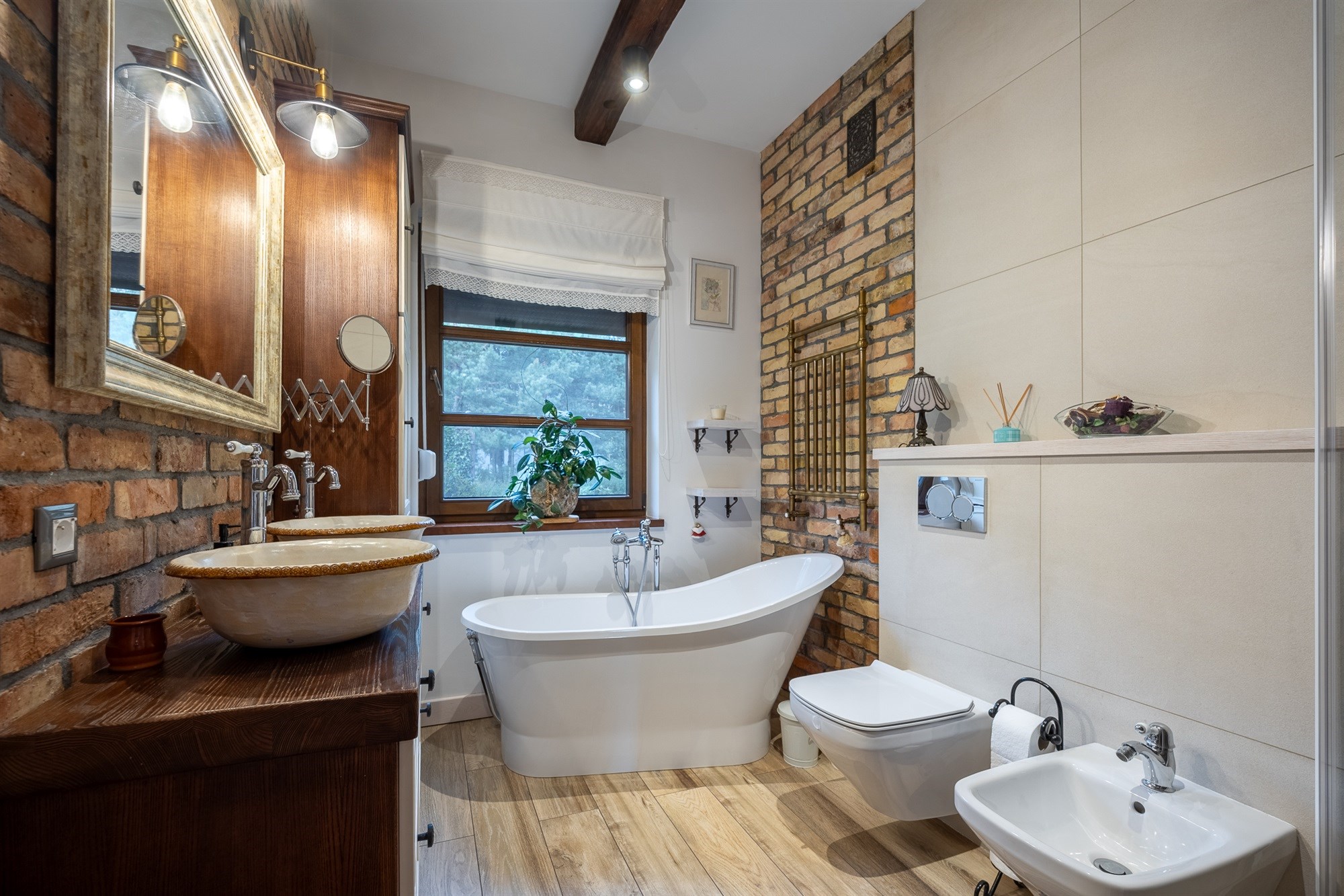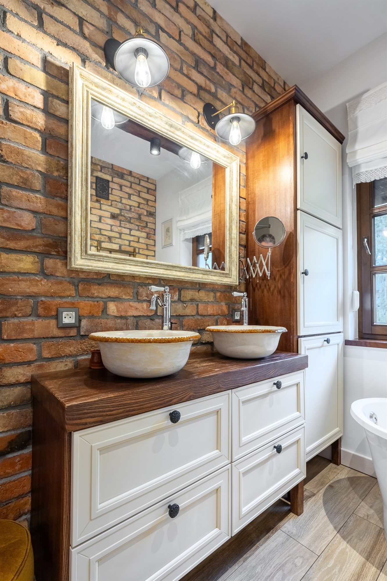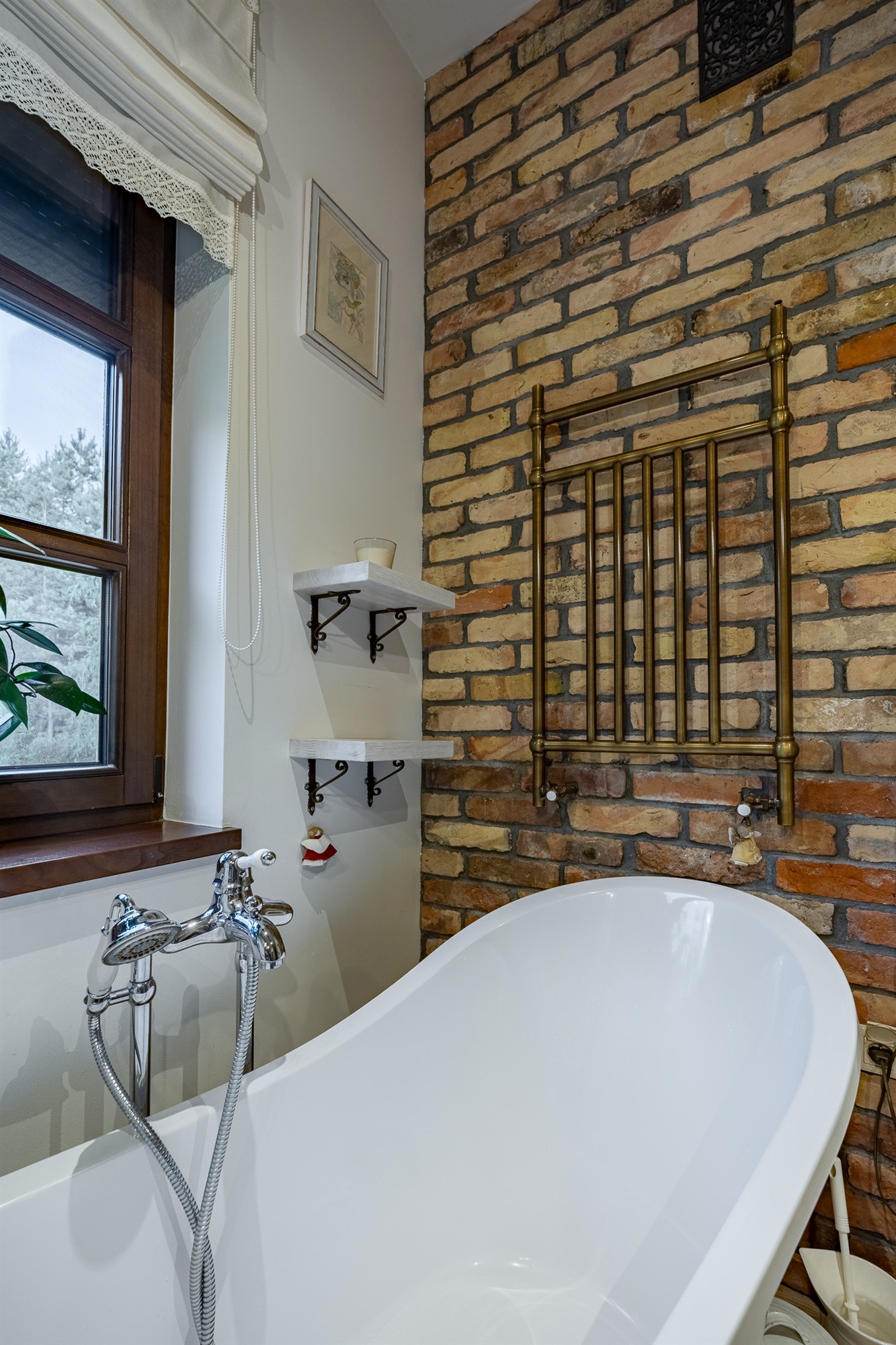Łazienka (7,11 m²) to prawdziwa perełka – połączenie stylu vintage z nowoczesnością. Mosiężne detale, retro grzejnik i naturalna cegła tworzą atmosferę luksusowego, a jednocześnie przytulnego wnętrza.