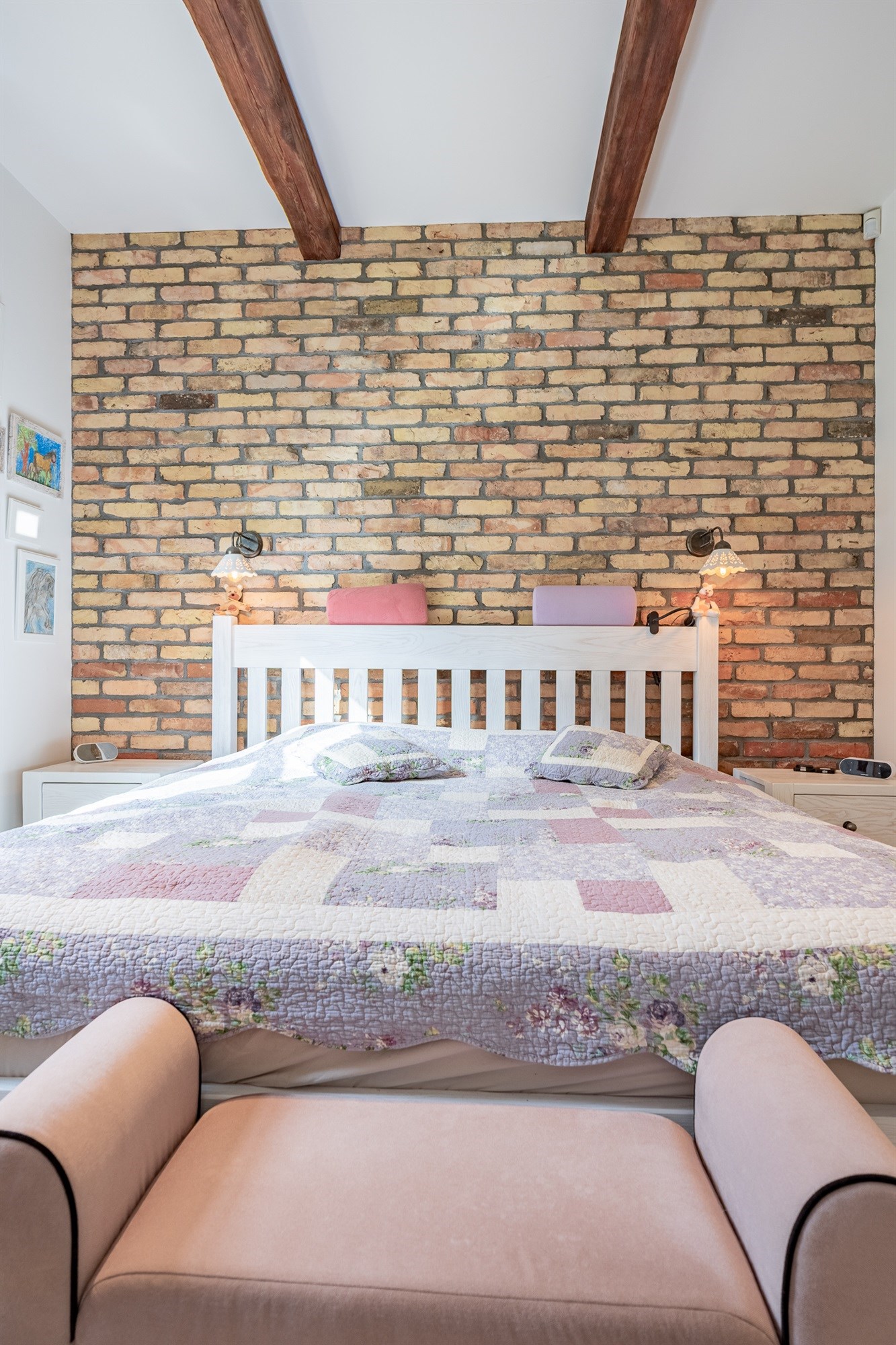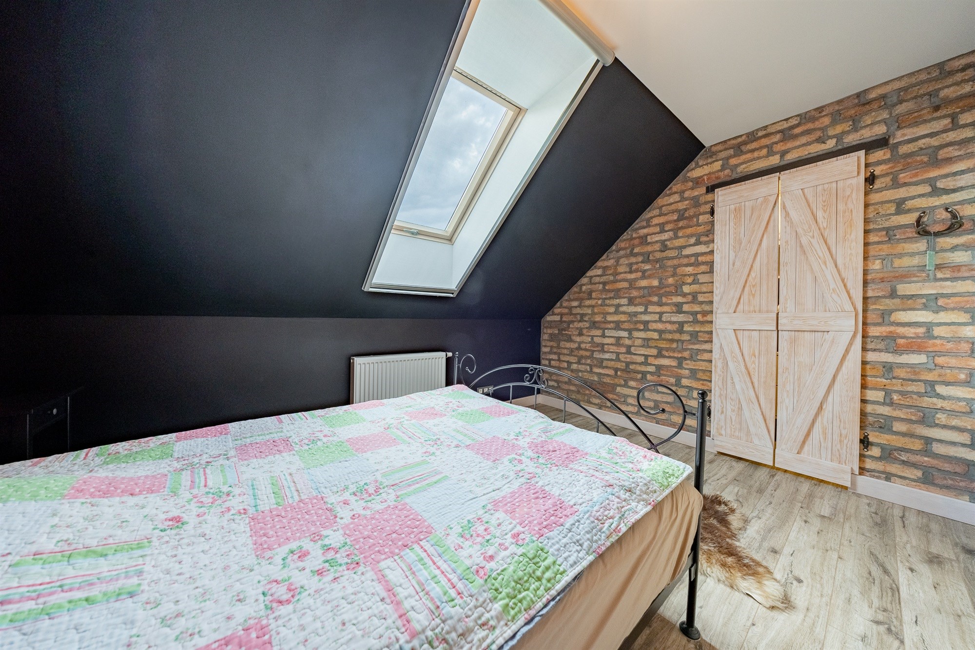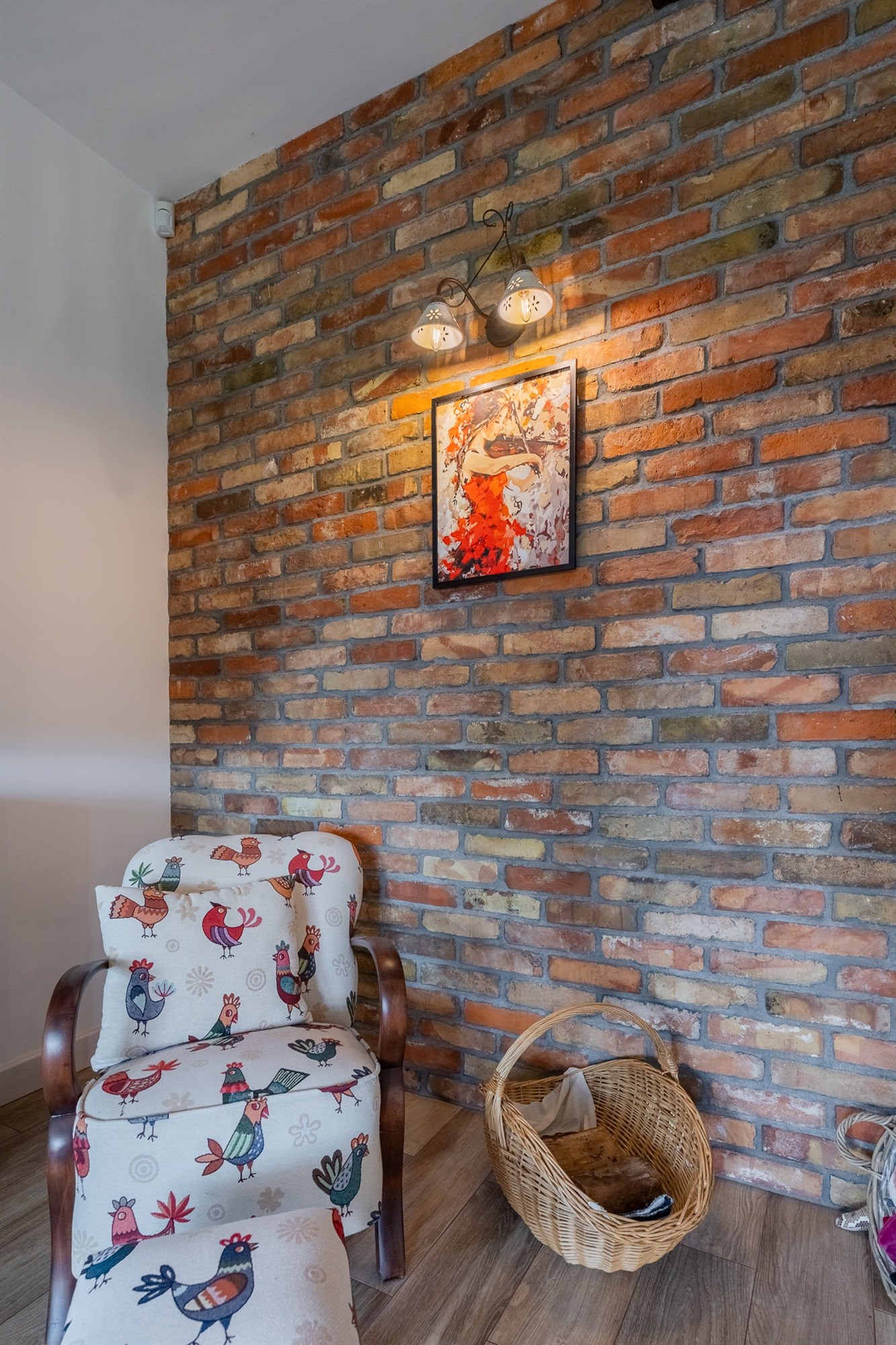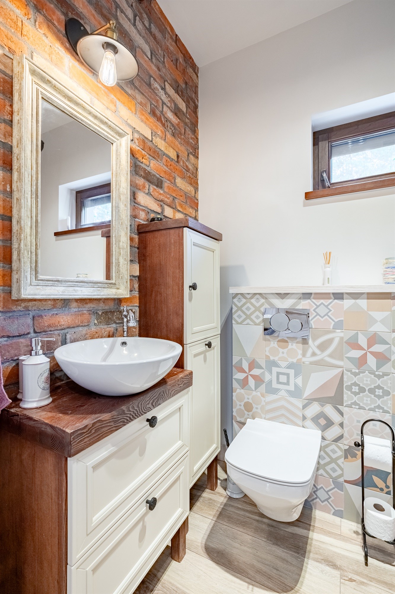 Łazienka (7,11 m²) to prawdziwa perełka – połączenie stylu vintage z nowoczesnością. Mosiężne detale, retro grzejnik i naturalna cegła tworzą atmosferę luksusowego, a jednocześnie przytulnego wnętrza.