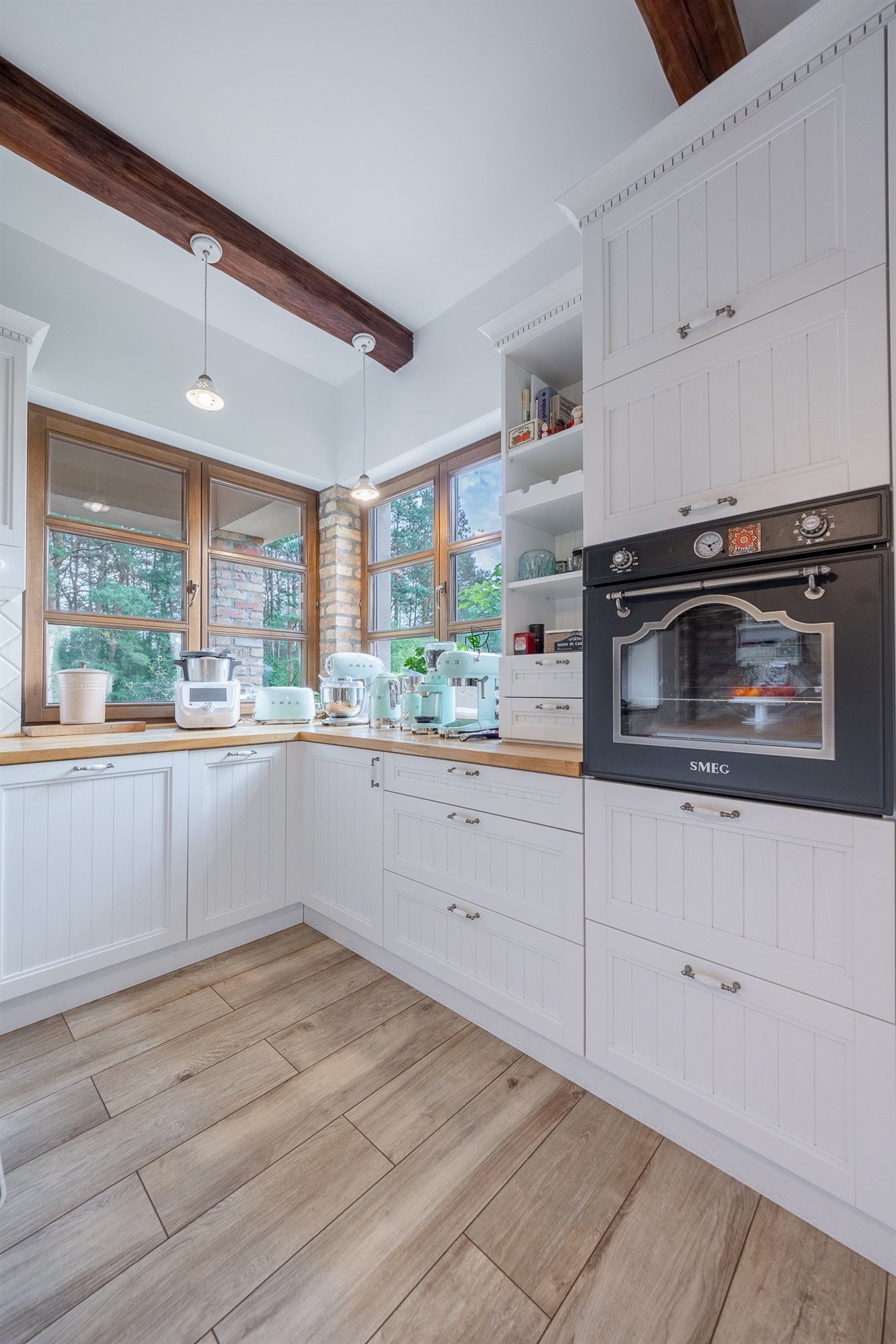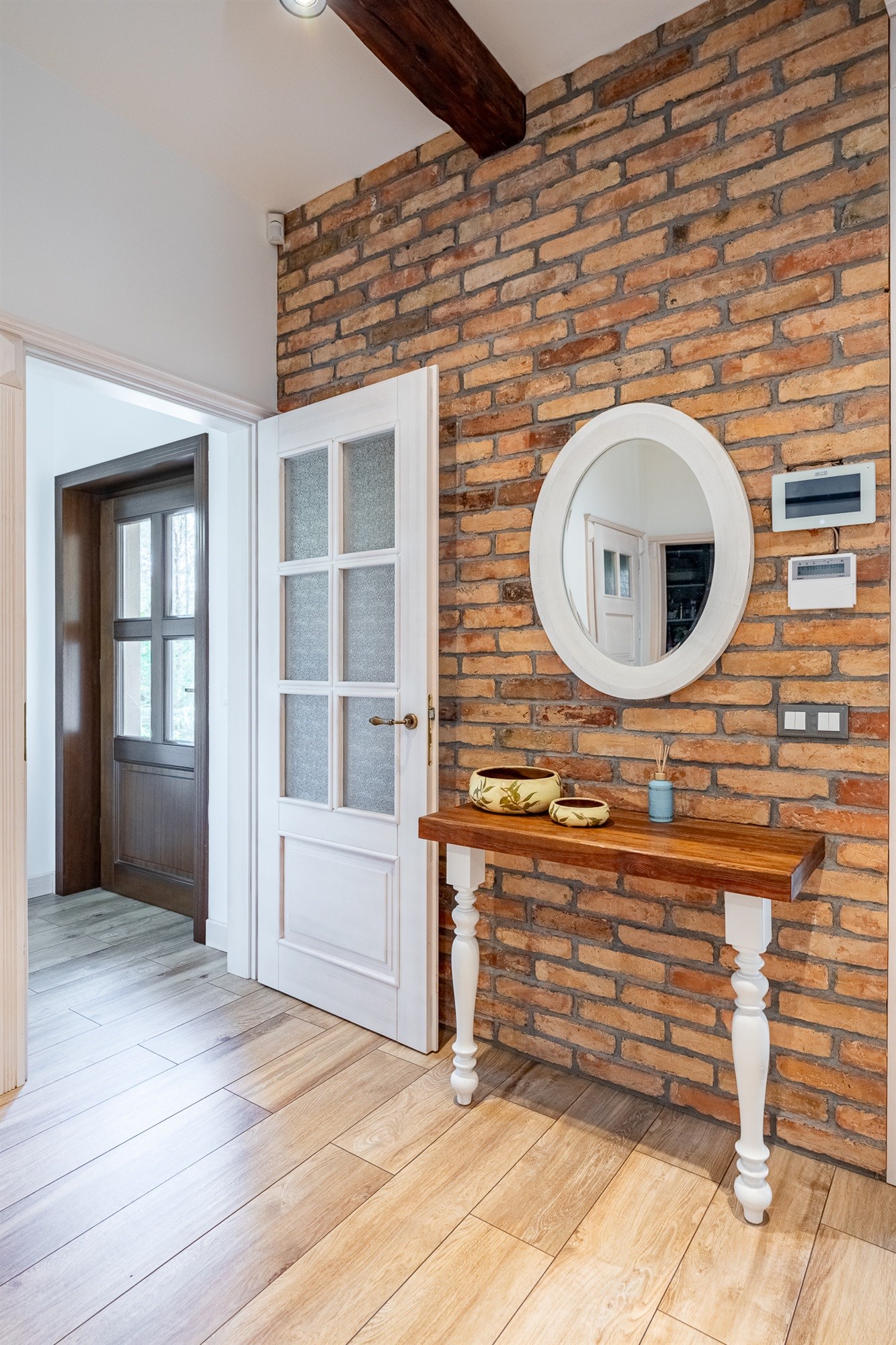 Nowoczesna stolarka okienna drewniane, na parterze rolety sterowane elektrycznie. Ściany gipsowane, malowane, częściowo wykończone oryginalną cegłą. Na podłogach panele oraz terakota.
