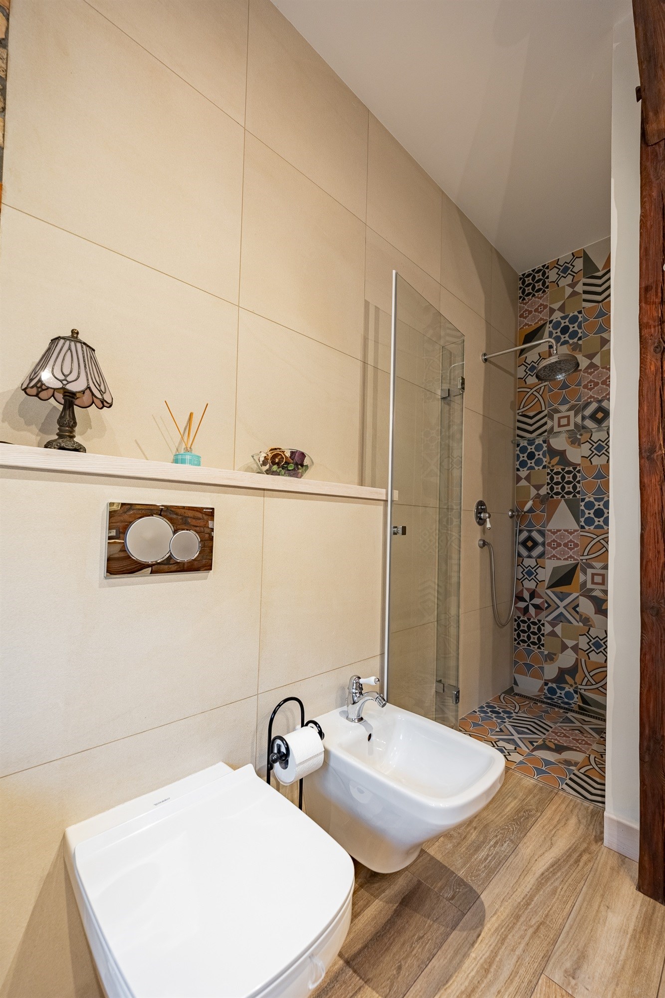 Całość zachwyca spójnością stylu – naturalne materiały, ciepłe barwy i subtelne oświetlenie tworzą wyjątkową aurę domowego spokoju.
