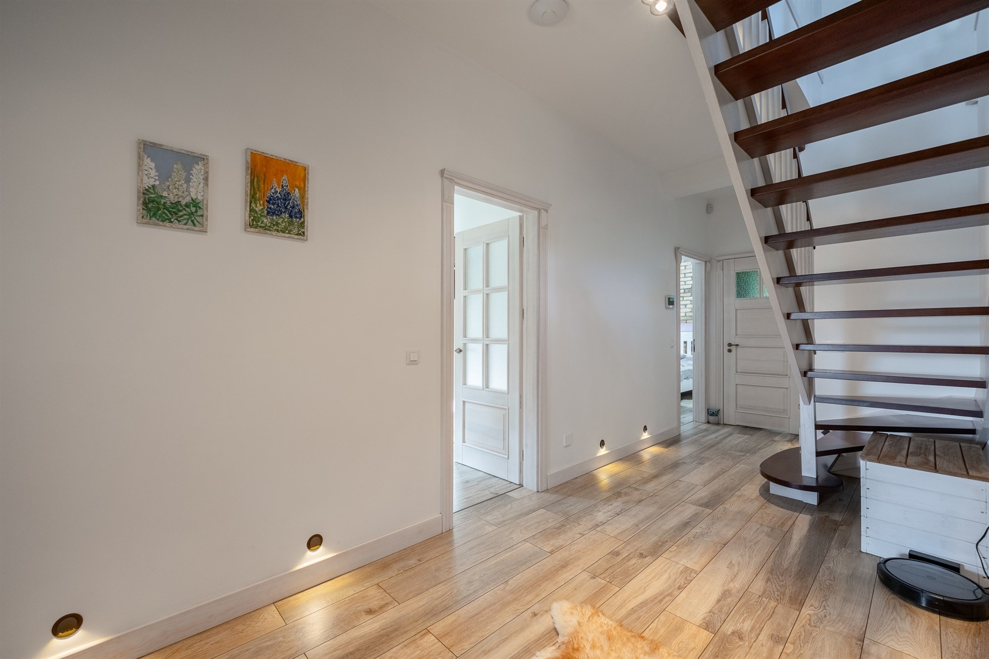 Przestronny hall (16,04 m²) prowadzi do części technicznej – kotłowni, pomieszczenia gospodarczego i osobnego WC.