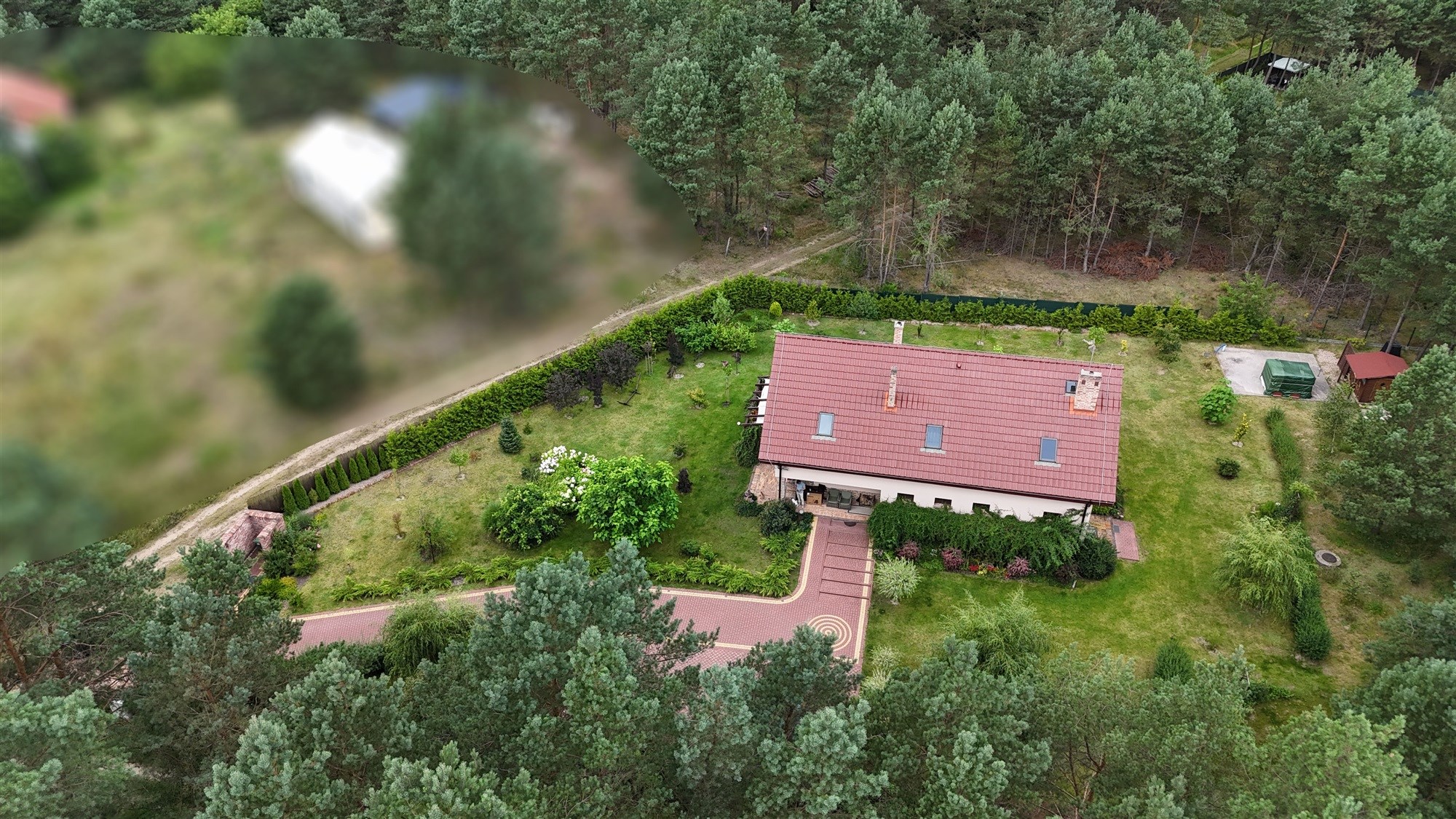 Dom położony jest w bezpośrednim sąsiedztwie lasu i terenów zielonych. Lekko nachylona działka zapewnia piękny widok z tarasu na ogród i dalsze zadrzewienia.