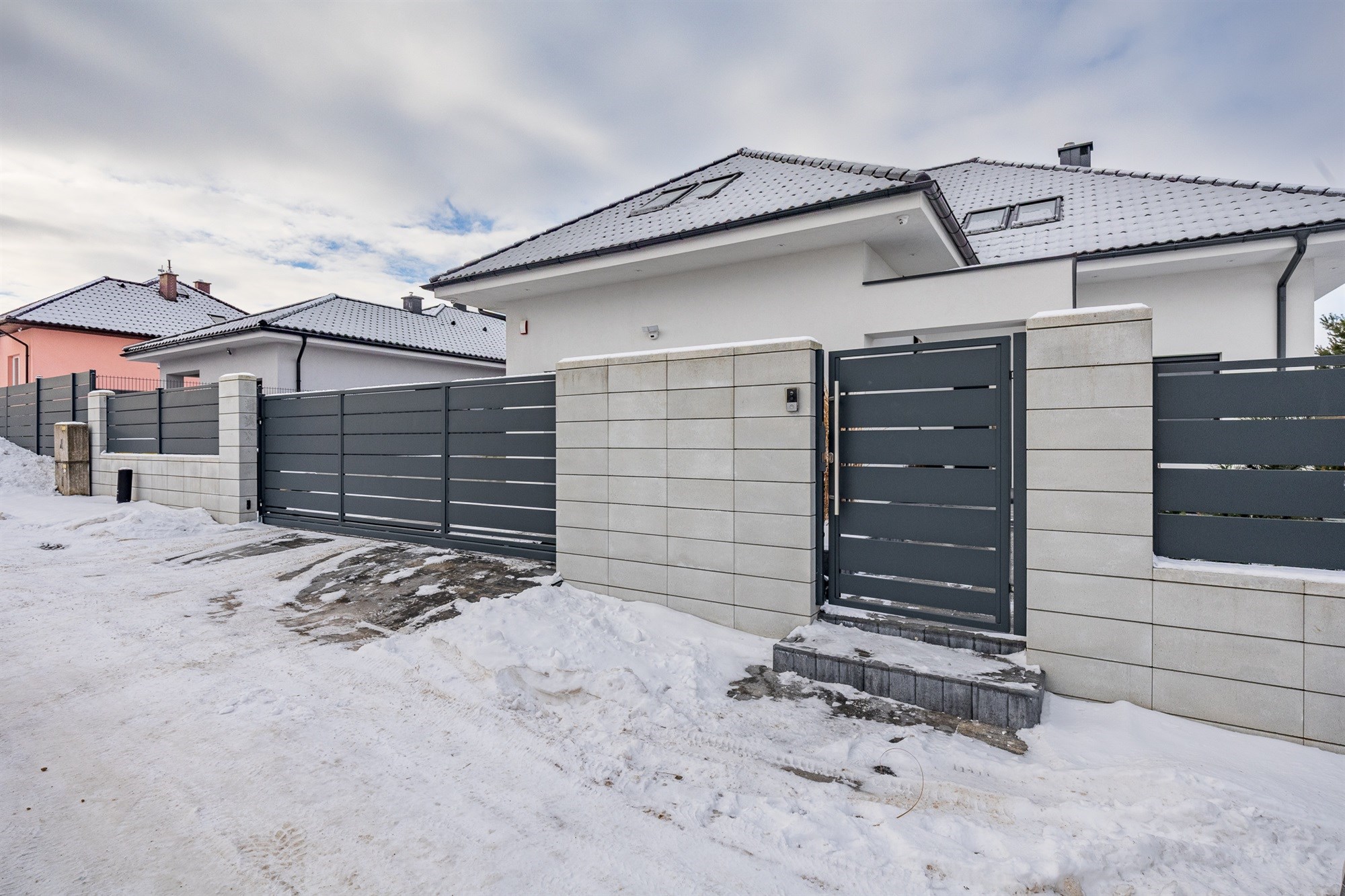 - Pełna automatyka: Sterowanie roletami zewnętrznymi (z podziałem na sekcje), bramą wjazdową, garażową oraz furtką.