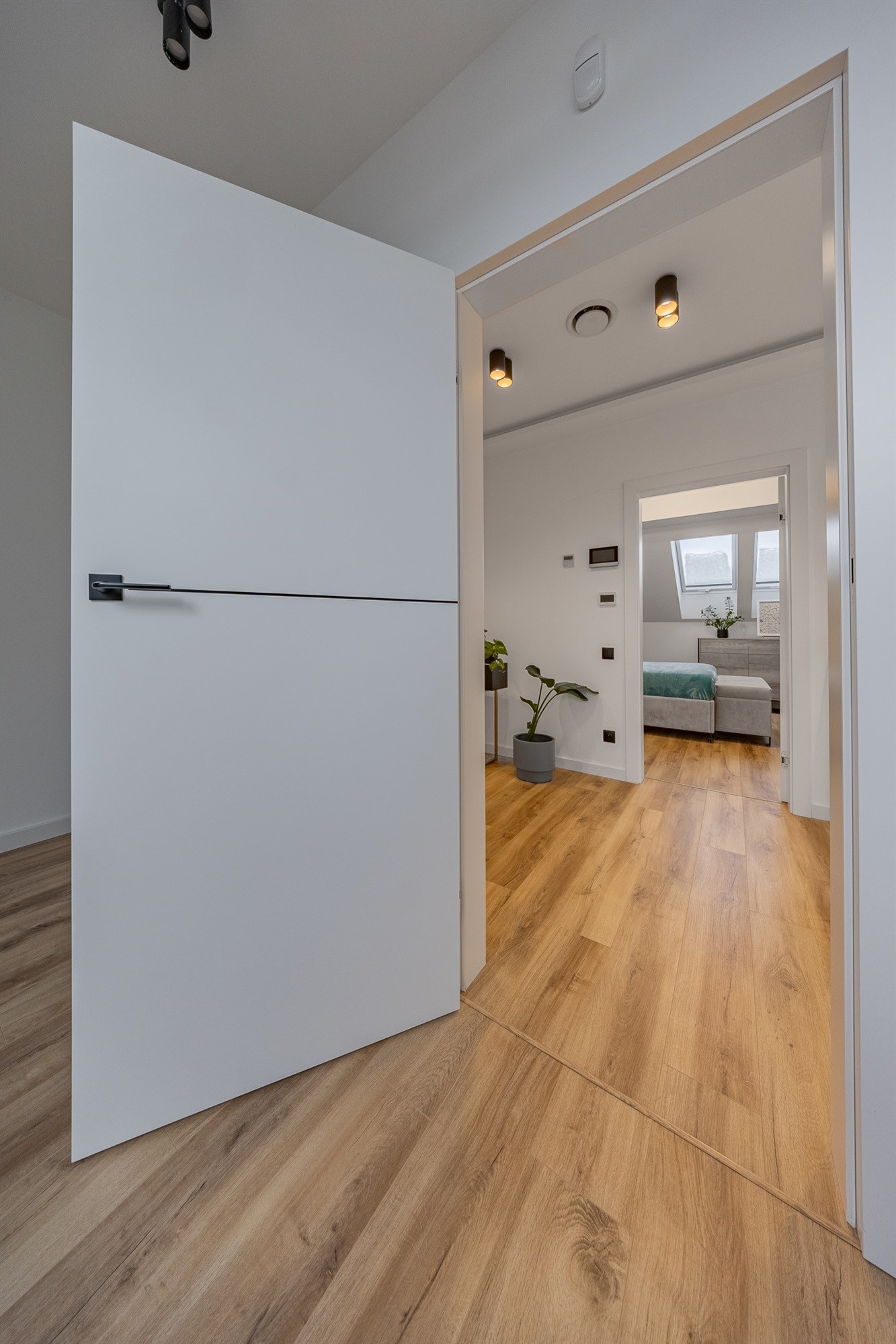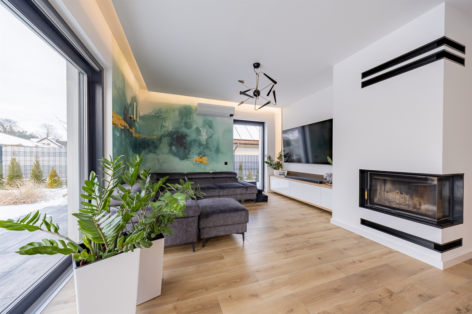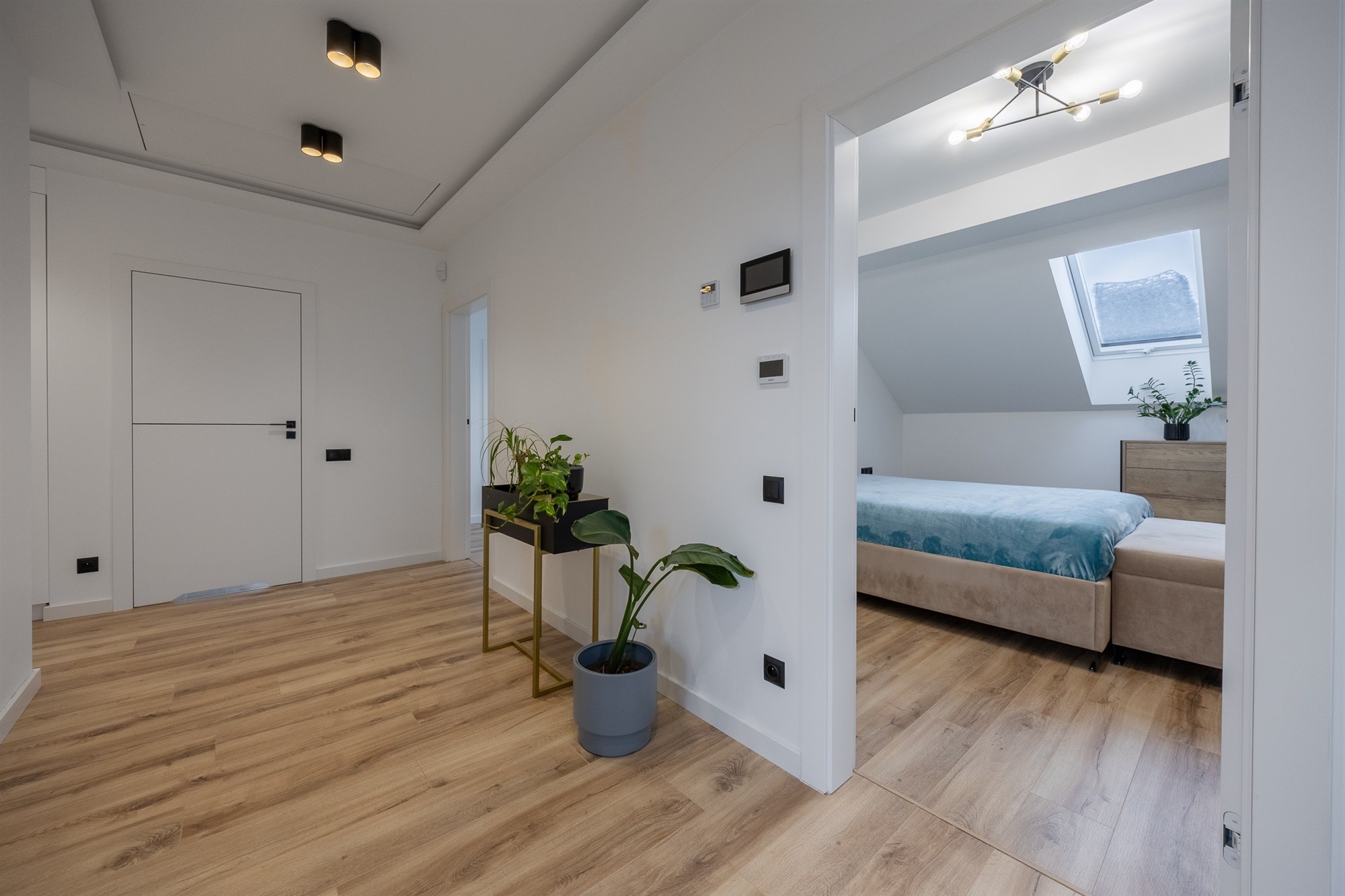 - Klimatyzacja: Pełen komfort latem – na dole system Samsung, na górze jednostka Gree z nawiewami do każdego pokoju i centralnym panelem sterowania.