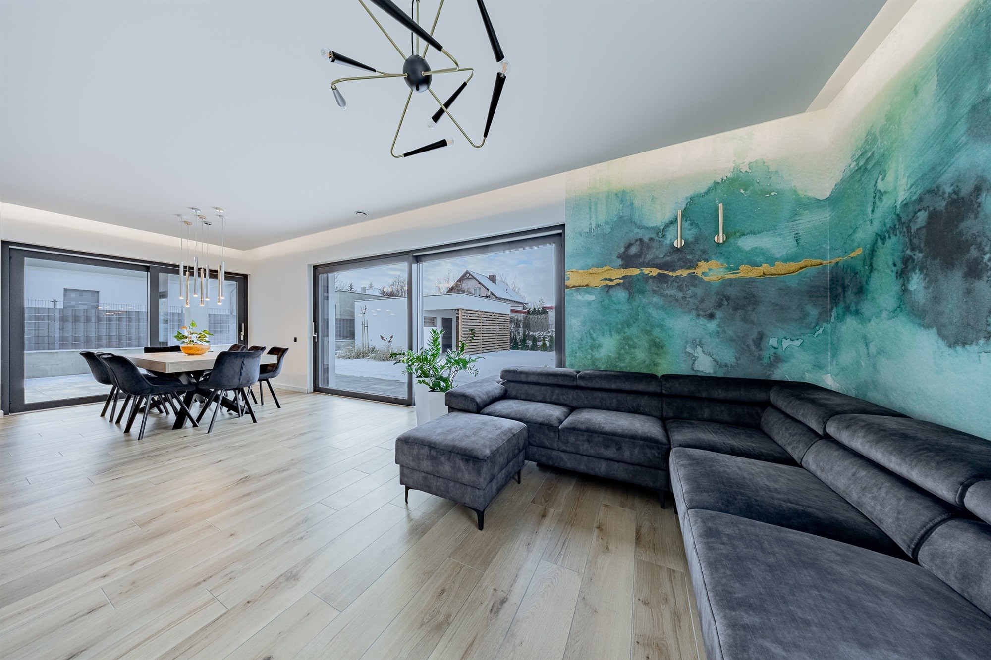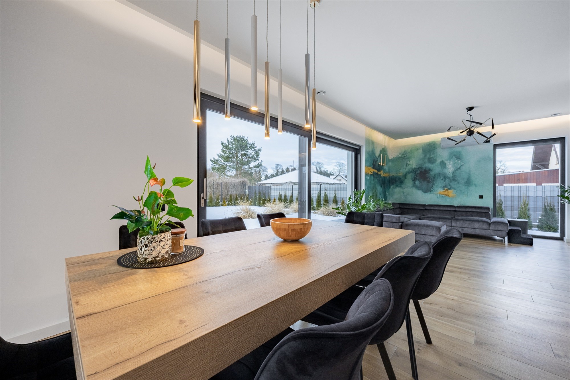 - Salon z kominkiem: Idealne miejsce na wieczorny relaks, które płynnie łączy się z jadalnią.